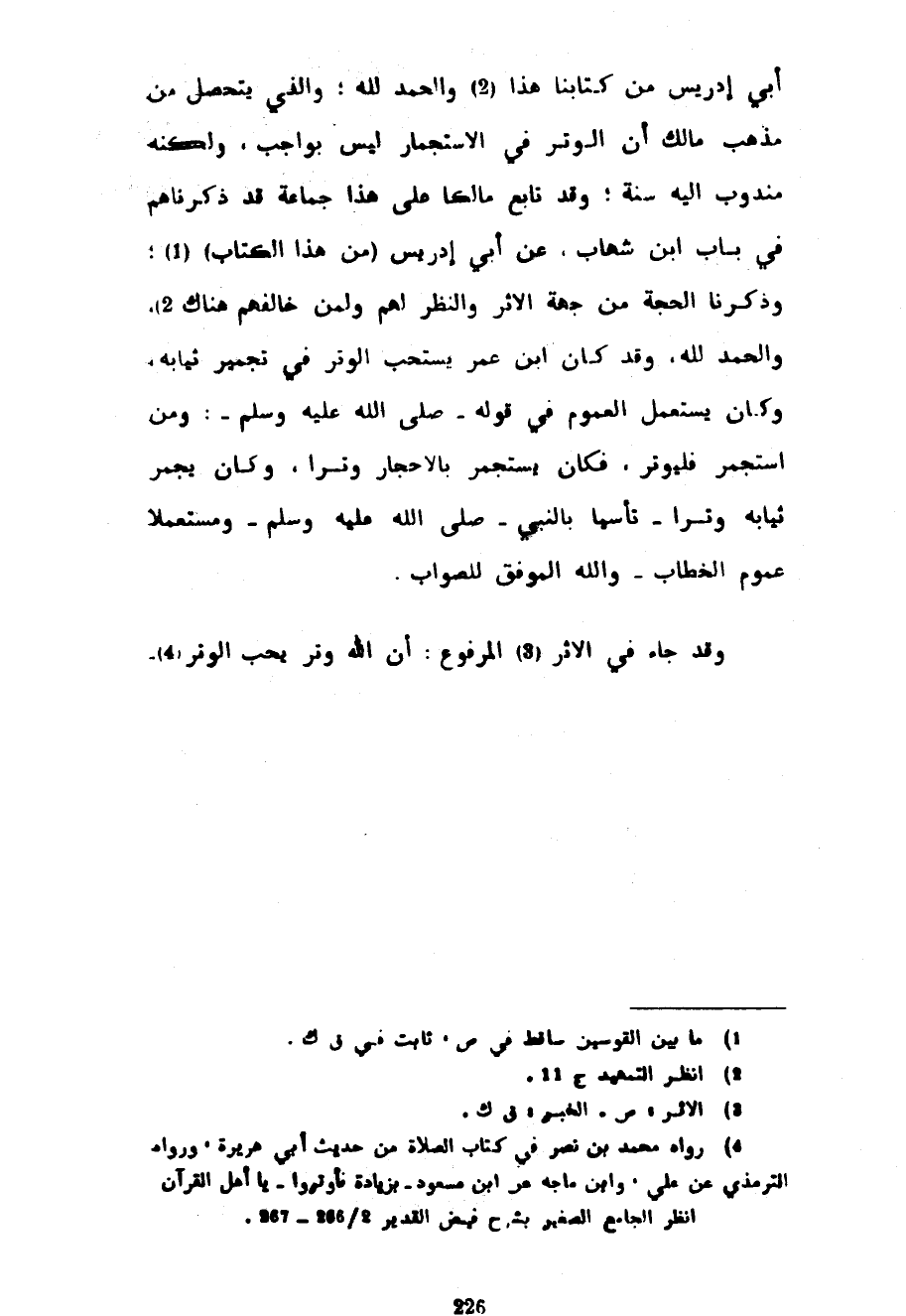 أَبِي إِدْرِيسَ مِنْ كِتَابِنَا هَذَا وَالْحَمْدُ لِلَّهِ وَالَّذِي يَتَحَصَّلُ مِنْ مَذْهَبِ مَالِكٍ أَنَّ الْوِتْرَ فِي الِاسْتِجْمَارِ لَيْسَ بِوَاجِبٍ وَلَكِنَّهُ مَنْدُوبٌ إِلَيْهِ سُنَّةٌ وَقَدْ تَابَعَ مَالِكًا عَلَى هَذَا جَمَاعَةٌ قَدْ ذَكَرْنَاهُمْ فِي بَابِ ابْنِ شِهَابٍ عَنْ أَبِي إِدْرِيسَ (مِنْ هَذَا الْكِتَابِ) وَذَكَرْنَا الْحُجَّةَ مِنْ جِهَةِ الْأَثَرِ وَالنَّظَرِ لَهُمْ وَلِمَنْ خَالَفَهُمْ هُنَاكَ وَالْحَمْدُ لِلَّهِ وَقَدْ كَانَ ابْنُ عُمَرَ يَسْتَحِبُّ الْوِتْرَ فِي تَجْمِيرِ ثِيَابِهِ وَكَانَ يَسْتَعْمِلُ الْعُمُومَ فِي قَوْلِهِ صَلَّى اللَّهُ عَلَيْهِ وَسَلَّمَ وَمَنِ اسْتَجْمَرَ فَلْيُوتِرْ فَكَانَ يَسْتَجْمِرُ بِالْأَحْجَارِ وِتْرًا وَكَانَ يُجَمِّرُ ثِيَابَهُ وِتْرًا تَأَسِّيًا بِالنَّبِيِّ صَلَّى اللَّهُ عَلَيْهِ وَسَلَّمَ وَمُسْتَعْمِلًا عُمُومَ الْخِطَابِ وَاللَّهُ الْمُوَفِّقُ لِلصَّوَابِ وَقَدْ جَاءَ فِي الْأَثَرِ الْمَرْفُوعِ إِنَّ اللَّهَ وِتْرٌ يُحِبُّ الْوِتْرَ