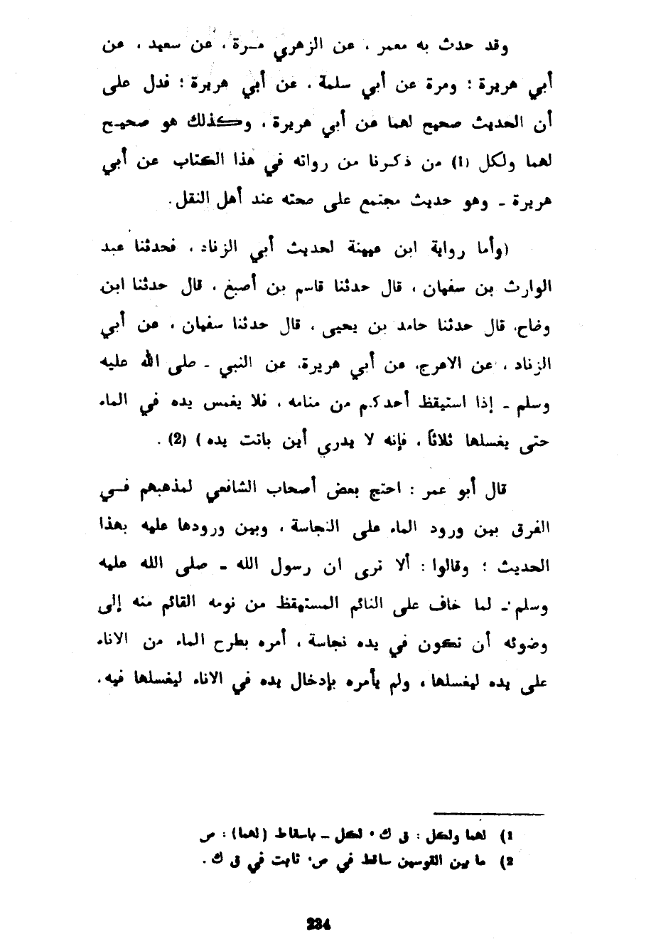 وَقَدْ حَدَّثَ بِهِ مَعْمَرٌ عَنِ الزُّهْرِيِّ مَرَّةً عَنْ سَعِيدٍ عَنْ أَبِي هُرَيْرَةَ وَمَرَّةً عَنْ أَبِي سَلَمَةَ عَنْ أَبِي هُرَيْرَةَ فَدَلَّ عَلَى أَنَّ الْحَدِيثَ صَحِيحٌ لَهُمَا عَنْ أَبِي هُرَيْرَةَ وَكَذَلِكَ هُوَ صَحِيحٌ لَهُمَا وَلِكُلِّ مَنْ ذَكَرْنَا مِنْ رُوَاتِهِ فِي هَذَا الْكِتَابِ عَنْ أَبِي هُرَيْرَةَ وَهُوَ حَدِيثٌ مُجْتَمَعٌ عَلَى صِحَّتِهِ عِنْدَ أَهْلِ النَّقْلِ (وَأَمَّا رِوَايَةُ ابْنِ عُيَيْنَةَ لِحَدِيثِ أَبِي الزِّنَادِ فَحَدَّثَنَا عَبْدُ الْوَارِثِ بْنُ سُفْيَانَ قَالَ حَدَّثَنَا قَاسِمُ بْنُ أَصْبَغَ قَالَ حَدَّثَنَا ابن واضاح قَالَ حَدَّثَنَا حَامِدُ بْنُ يَحْيَى قَالَ حَدَّثَنَا سُفْيَانُ عَنْ أَبِي الزِّنَادِ عَنِ الْأَعْرَجِ عَنْ أَبِي هُرَيْرَةَ عَنِ النَّبِيِّ صَلَّى اللَّهُ عَلَيْهِ وَسَلَّمَ إِذَا اسْتَيْقَظَ أَحَدُكُمْ مِنْ مَنَامِهِ فَلَا يَغْمِسْ يَدَهُ فِي الْمَاءِ حَتَّى يَغْسِلَهَا ثَلَاثًا فَإِنَّهُ لَا يَدْرِي أَيْنَ بَاتَتْ يَدُهُ) قَالَ أَبُو عُمَرَ احْتَجَّ بَعْضُ أَصْحَابِ الشَّافِعِيِّ لِمَذْهَبِهِمْ فِي الْفَرْقِ بَيْنَ وُرُودِ الْمَاءِ عَلَى النَّجَاسَةِ وَبَيْنَ وُرُودِهَا عَلَيْهِ بِهَذَا الْحَدِيثِ وَقَالُوا أَلَا تَرَى أَنَّ رَسُولَ اللَّهِ صَلَّى اللَّهُ عَلَيْهِ وَسَلَّمَ لَمَّا خَافَ عَلَى النَّائِمِ الْمُسْتَيْقِظِ مِنْ نَوْمِهِ الْقَائِمِ مِنْهُ إِلَى وَضُوئِهِ أَنْ تَكُونَ فِي يَدِهِ نَجَاسَةٌ أَمَرَهُ بِطَرْحِ الْمَاءِ مِنَ الْإِنَاءِ عَلَى يَدِهِ لِيَغْسِلَهَا وَلَمْ يَأْمُرْهُ بِإِدْخَالِ يَدِهِ فِي الْإِنَاءِ لِيَغْسِلَهَا فِيهِ
