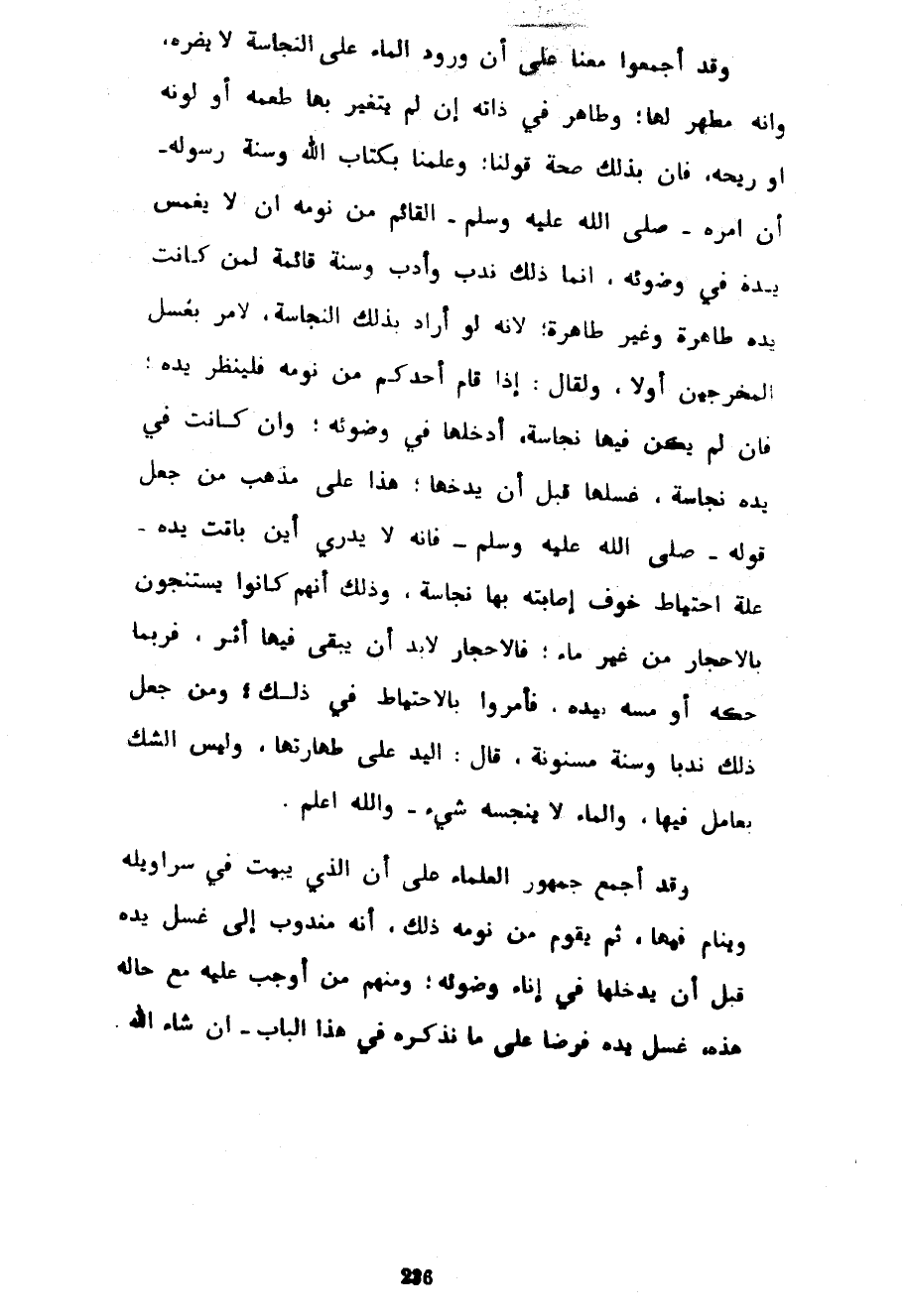 وَقَدْ أَجْمَعُوا مَعَنَا عَلَى أَنَّ وُرُودَ الْمَاءِ عَلَى النَّجَاسَةِ لَا يَضُرُّهُ وَأَنَّهُ مُطَهِّرٌ لَهَا وَطَاهِرٌ فِي ذَاتِهِ إِنْ لَمْ يَتَغَيَّرْ بِهَا طَعْمُهُ أَوْ لَوْنُهُ أَوْ رِيحُهُ فَإِنَّ بِذَلِكَ صِحَّةَ قَوْلِنَا وَعِلْمِنَا بِكِتَابِ اللَّهِ وَسُنَّةِ رَسُولِهِ أَنَّ أَمْرَهُ صَلَّى اللَّهُ عَلَيْهِ وَسَلَّمَ الْقَائِمَ مِنْ نَوْمِهِ أَنْ لَا يَغْمِسَ يَدَهُ فِي وَضُوئِهِ إِنَّمَا ذَلِكَ نَدْبٌ وَأَدَبٌ وَسُنَّةٌ قَائِمَةٌ لِمَنْ كَانَتْ يَدُهُ طَاهِرَةً وَغَيْرَ طَاهِرَةٍ لِأَنَّهُ لَوْ أَرَادَ بِذَلِكَ النَّجَاسَةَ لَأَمَرَ بِغَسْلِ الْمَخْرَجَيْنِ أَوَّلًا وَلَقَالَ إِذَا قَامَ أَحَدُكُمْ مِنْ نَوْمِهِ لفينظر يَدَهُ فَإِنْ لَمْ يَكُنْ فِيهَا نَجَاسَةٌ أَدْخَلَهَا فِي وَضُوئِهِ وَإِنْ كَانَتْ فِي يَدِهِ نَجَاسَةٌ غَسَلَهَا قَبْلَ أَنْ يُدْخِلَهَا هَذَا عَلَى مَذْهَبِ مَنْ جَعَلَ قَوْلَهُ صَلَّى اللَّهُ عَلَيْهِ وَسَلَّمَ فَإِنَّهُ لَا يَدْرِي أَيْنَ بَاتَتْ يَدُهُ عِلَّةَ احْتِيَاطٍ خَوْفَ إِصَابَتِهِ بِهَا نَجَاسَةً وَذَلِكَ أَنَّهُمْ كَانُوا يَسْتَنْجُونَ بِالْأَحْجَارِ مِنْ غَيْرِ مَاءٍ فَالْأَحْجَارُ لَا بُدَّ أَنْ يَبْقَى فِيهَا أَثَرٌ فَرُبَّمَا حَكَّهُ أَوْ مَسَّهُ بِيَدِهِ فَأُمِرُوا بِالِاحْتِيَاطِ فِي ذَلِكَ وَمَنْ جَعَلَ ذَلِكَ نَدْبًا وَسُنَّةً مَسْنُونَةً قَالَ الْيَدُ عَلَى طَهَارَتِهَا وَلَيْسَ الشَّكُّ بِعَامِلٍ فِيهَا وَالْمَاءُ لَا يُنَجِّسُهُ شَيْءٌ وَاللَّهُ أَعْلَمُ وَقَدْ أَجْمَعَ جُمْهُورُ الْعُلَمَاءِ عَلَى أَنَّ الَّذِي يَبِيتُ فِي سَرَاوِيلِهِ وَيَنَامُ فِيهَا ثُمَّ يَقُومُ مِنْ نَوْمِهِ ذَلِكَ أَنَّهُ مَنْدُوبٌ إِلَى غَسْلِ يَدِهِ قَبْلَ أَنْ يُدْخِلَهَا فِي إِنَاءِ وَضُوئِهِ وَمِنْهُمْ مَنْ أَوْجَبَ عَلَيْهِ مَعَ حَالِهِ هَذِهِ غَسْلَ يَدِهِ فَرْضًا عَلَى مَا نَذْكُرُهُ فِي هَذَا الْبَابِ إِنْ شَاءَ اللَّهُ