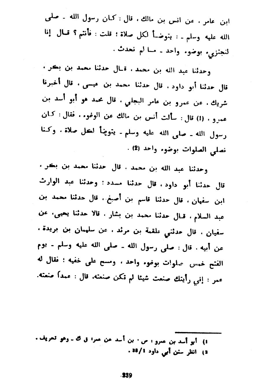 ابن عَامِرٍ عَنْ أَنَسِ بْنِ مَالِكٍ قَالَ كَانَ رَسُولُ اللَّهِ صَلَّى اللَّهُ عَلَيْهِ وَسَلَّمَ يَتَوَضَّأُ لِكُلِّ صَلَاةٍ قُلْتُ فَأَنْتُمْ قَالَ إِنَّا لَنَجْتَزِئُ بِوُضُوءٍ وَاحِدٍ مَا لَمْ نُحْدِثْ وَحَدَّثَنَا عَبْدُ اللَّهِ بْنُ مُحَمَّدٍ قَالَ حَدَّثَنَا مُحَمَّدُ بْنُ بَكْرٍ قَالَ حَدَّثَنَا أَبُو دَاوُدَ قَالَ حَدَّثَنَا مُحَمَّدُ بْنُ عِيسَى قَالَ أَخْبَرَنَا شَرِيكٌ عَنْ عَمْرِو بْنِ عَامِرٍ الْبَجَلِيِّ قَالَ مُحَمَّدٌ هُوَ أَبُو أَسَدِ بْنُ عَمْرٍو قَالَ سَأَلْتُ أَنَسَ بْنَ مَالِكٍ عَنِ الْوُضُوءِ فَقَالَ كَانَ رَسُولُ اللَّهِ صَلَّى اللَّهُ عَلَيْهِ وَسَلَّمَ يَتَوَضَّأُ لِكُلِّ صَلَاةٍ وَكُنَّا نُصَلِّي الصَّلَوَاتِ بِوُضُوءٍ وَاحِدٍ وَحَدَّثَنَا عَبْدُ اللَّهِ بْنُ مُحَمَّدٍ قَالَ حَدَّثَنَا مُحَمَّدُ بْنُ بَكْرٍ قَالَ حَدَّثَنَا أَبُو دَاوُدَ قال حَدَّثَنَا مُسَدَّدٌ وَحَدَّثَنَا عَبْدُ الْوَارِثِ بْنُ سُفْيَانَ قَالَ حَدَّثَنَا قَاسِمُ بْنُ أَصْبَغَ قَالَ حَدَّثَنَا مُحَمَّدُ بْنُ عَبْدِ السَّلَامِ قَالَ حَدَّثَنَا مُحَمَّدُ بْنُ بَشَّارٍ قَالَا حَدَّثَنَا يَحْيَى عَنْ سُفْيَانَ قَالَ حَدَّثَنِي عَلْقَمَةَ بْنِ مَرْثَدٍ عَنْ سُلَيْمَانَ بْنِ بُرَيْدَةَ عَنْ أَبِيهِ قَالَ صَلَّى رَسُولُ اللَّهِ صَلَّى اللَّهُ عَلَيْهِ وَسَلَّمَ يَوْمَ الْفَتْحِ خَمْسَ صَلَوَاتٍ بِوُضُوءٍ وَاحِدٍ وَمَسَحَ عَلَى خُفَّيْهِ فَقَالَ لَهُ عُمَرُ إِنِّي رَأَيْتُكَ صَنَعْتَ شَيْئًا لَمْ تَكُنْ صَنَعْتَهُ قَالَ عَمْدًا صَنَعْتُهُ