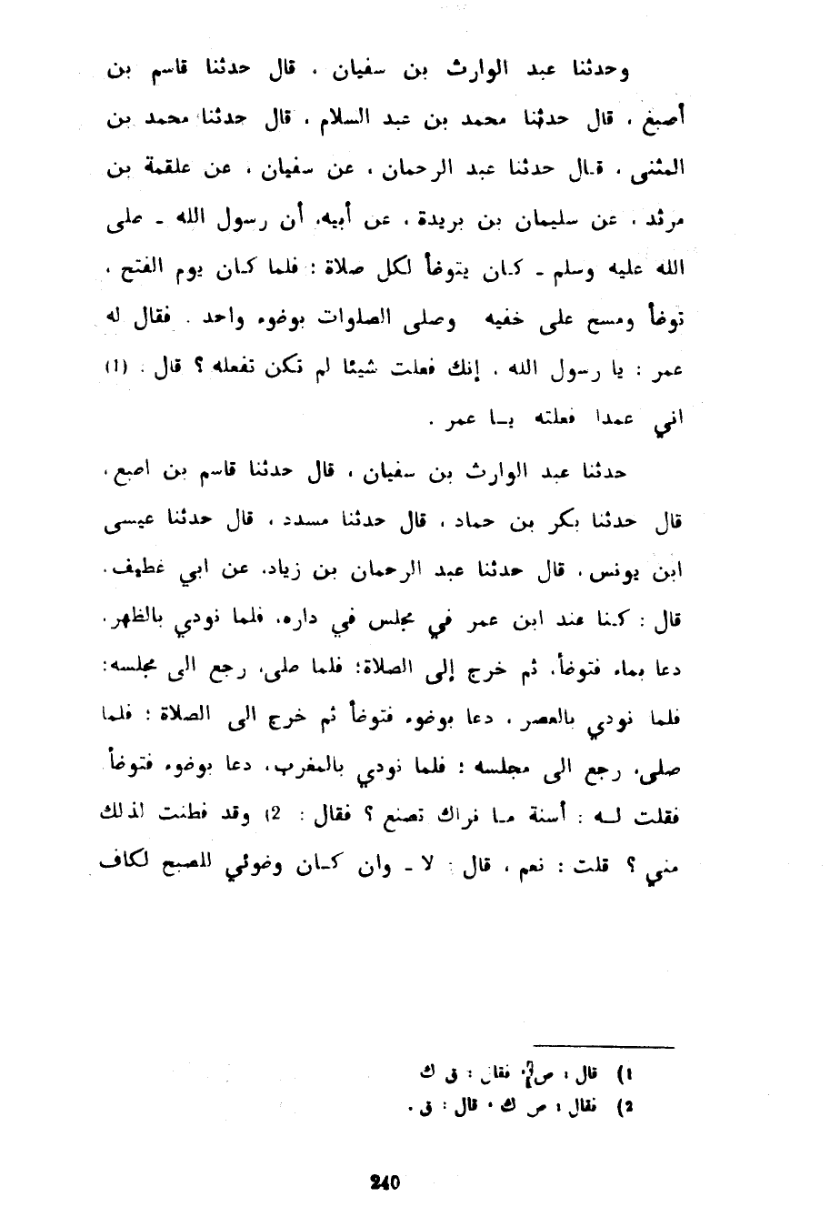 وَحَدَّثَنَا عَبْدُ الْوَارِثِ بْنُ سُفْيَانَ قَالَ حَدَّثَنَا قَاسِمُ بْنُ أَصْبَغَ قَالَ حَدَّثَنَا مُحَمَّدُ بْنُ عَبْدِ السَّلَامِ قَالَ حَدَّثَنَا مُحَمَّدُ بْنُ الْمُثَنَّى قَالَ حَدَّثَنَا عبد الرحمان عَنْ سُفْيَانَ عَنْ عَلْقَمَةَ بْنِ مَرْثَدٍ عَنْ سُلَيْمَانَ بْنِ بُرَيْدَةَ عَنْ أَبِيهِ أَنَّ رَسُولَ اللَّهِ صَلَّى اللَّهُ عَلَيْهِ وَسَلَّمَ كَانَ يَتَوَضَّأُ لِكُلِّ صَلَاةٍ فَلَمَّا كَانَ يَوْمُ الْفَتْحِ تَوَضَّأَ وَمَسَحَ عَلَى خُفَّيْهِ وَصَلَّى الصَّلَوَاتِ بِوُضُوءٍ وَاحِدٍ فَقَالَ لَهُ عُمَرُ يَا رَسُولَ اللَّهِ إِنَّكَ فَعَلْتَ شَيْئًا لَمْ تَكُنْ تَفْعَلُهُ قَالَ إِنِّي عَمْدًا فَعَلْتُهُ يَا عُمَرَ حَدَّثَنَا عَبْدُ الْوَارِثِ بْنُ سُفْيَانَ قَالَ حَدَّثَنَا قَاسِمُ بْنُ أَصْبَغَ قَالَ حَدَّثَنَا بَكْرُ بْنُ حَمَّادٍ قَالَ حَدَّثَنَا مُسَدَّدٌ قَالَ حَدَّثَنَا عِيسَى بْنُ يُونُسَ قَالَ حَدَّثَنَا عبد الرحمان بن زياد عن أبي عطيف قَالَ كُنَّا عِنْدَ ابْنِ عُمَرَ فِي مَجْلِسٍ فِي دَارِهِ فَلَمَّا نُودِيَ بِالظُّهْرِ دَعَا بِمَاءٍ فَتَوَضَّأَ ثُمَّ خَرَجَ إِلَى الصَّلَاةِ فَلَمَّا صَلَّى رَجَعَ إِلَى مَجْلِسِهِ فَلَمَّا نُودِيَ بِالْعَصْرِ دَعَا بِوُضُوءٍ فَتَوَضَّأَ ثُمَّ خَرَجَ إِلَى الصَّلَاةِ فَلَمَّا صَلَّى رَجَعَ إِلَى مَجْلِسِهِ فَلَمَّا نُودِيَ بِالْمَغْرِبِ دَعَا بِوُضُوءٍ فَتَوَضَّأَ فَقُلْتُ لَهُ أَسُنَّةٌ مَا نَرَاكَ تَصْنَعُ فَقَالَ وَقَدْ فَطِنْتَ لِذَلِكَ مِنِّي قُلْتُ نَعَمْ قَالَ لَا وَإِنْ كَانَ وُضُوئِي للصبح لكاف