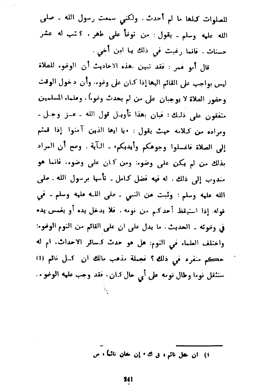 لِلصَّلَوَاتِ كُلِّهَا مَا لَمْ أُحْدِثْ وَلَكِنِّي سَمِعْتُ رَسُولَ اللَّهِ صَلَّى اللَّهُ عَلَيْهِ وسلم يقول مَنْ تَوَضَّأَ عَلَى طُهْرٍ كُتِبَ لَهُ عَشْرُ حَسَنَاتٍ فَإِنَّمَا رَغِبْتُ فِي ذَلِكَ يَا ابْنَ أَخِي قَالَ أَبُو عُمَرَ فَقَدْ تَبَيَّنَ بِهَذِهِ الْأَحَادِيثِ أَنْ الْوُضُوءَ لِلصَّلَاةِ لَيْسَ بِوَاجِبٍ عَلَى الْقَائِمِ إِلَيْهَا إِذَا كَانَ عَلَى وُضُوءٍ وَأَنَّ دُخُولَ الْوَقْتِ وَحُضُورَ الصَّلَاةِ لَا يُوجِبَانِ عَلَى مَنْ لَمْ يُحْدِثْ وُضُوءًا وَعُلَمَاءُ الْمُسْلِمِينَ مُتَّفِقُونَ عَلَى ذَلِكَ فَبَانَ بِهَذَا تَأْوِيلُ قَوْلِ اللَّهِ عَزَّ وَجَلَّ وَمُرَادُهُ مِنْ كَلَامِهِ حَيْثُ يَقُولُ يَا أَيُّهَا الَّذِينَ آمَنُوا إِذَا قُمْتُمْ إِلَى الصَّلَاةِ فَاغْسِلُوا وُجُوهَكُمْ وَأَيْدِيَكُمْ الْآيَةَ وَصَحَّ أَنَّ الْمُرَادَ بِذَلِكَ مَنْ لَمْ يَكُنْ عَلَى وُضُوءٍ وَمَنْ كَانَ عَلَى وُضُوءٍ فَإِنَّمَا هُوَ مَنْدُوبٌ إِلَى ذَلِكَ لَهُ فِيهِ فَضْلٌ كَامِلٌ تَأَسِّيًا بِرَسُولِ اللَّهِ صَلَّى اللَّهُ عَلَيْهِ وَسَلَّمَ وَثَبَتَ عَنِ النَّبِيِّ صَلَّى اللَّهُ عَلَيْهِ وَسَلَّمَ فِي قَوْلِهِ إِذَا اسْتَيْقَظَ أَحَدُكُمْ مِنْ نَوْمِهِ فَلَا يُدْخِلْ يَدَهُ أَوْ يَغْمِسْ يَدَهُ فِي وَضُوئِهِ الْحَدِيثَ مَا يَدُلُّ عَلَى أَنَّ عَلَى الْقَائِمِ مِنَ النَّوْمِ الْوُضُوءَ وَاخْتَلَفَ الْعُلَمَاءُ فِي النَّوْمِ هَلْ هُوَ حَدَثٌ كَسَائِرِ الْأَحْدَاثِ أَمْ لَهُ حُكْمٌ مُنْفَرِدٌ فِي ذَلِكَ فَجُمْلَةُ مَذْهَبِ مَالِكٍ أَنَّ كُلَّ نَائِمٍ اسْتَثْقَلَ نَوْمًا وَطَالَ نَوْمُهُ عَلَى أَيِّ حَالٍ كَانَ فَقَدْ وَجَبَ عَلَيْهِ الْوُضُوءُ