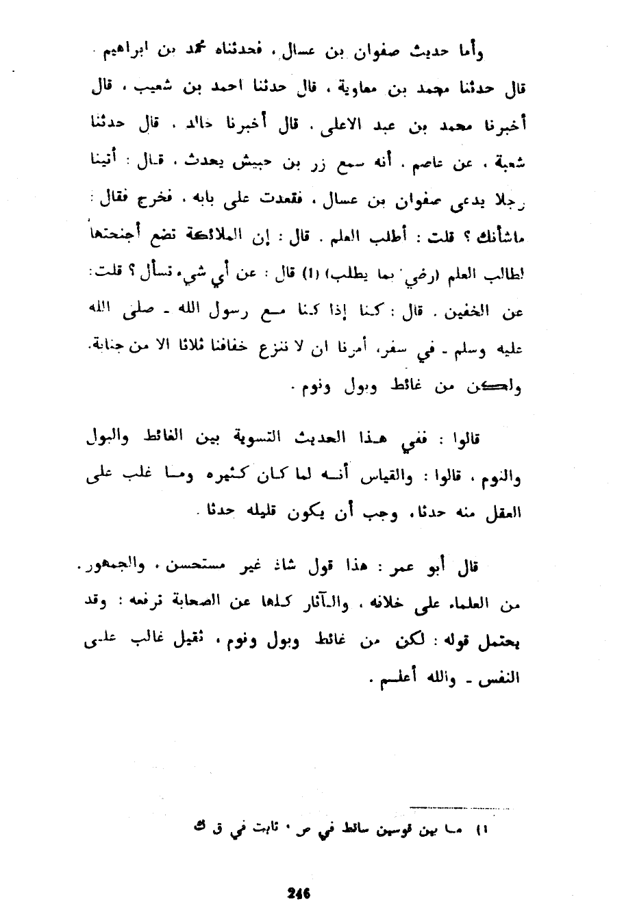 وَأَمَّا حَدِيثُ صَفْوَانَ بْنِ عَسَّالٍ فَحَدَّثَنَاهُ مُحَمَّدُ بْنُ إِبْرَاهِيمَ قَالَ حَدَّثَنَا مُحَمَّدُ بْنُ مُعَاوِيَةَ قَالَ حَدَّثَنَا أَحْمَدُ بْنُ شُعَيْبٍ قَالَ أَخْبَرَنَا مُحَمَّدُ بْنُ عَبْدِ الْأَعْلَى قَالَ أَخْبَرَنَا خَالِدٌ قَالَ حَدَّثَنَا شُعْبَةُ عَنْ عَاصِمٍ أَنَّهُ سَمِعَ زِرَّ بْنَ حُبَيْشٍ يُحَدِّثُ قَالَ أَتَيْنَا رَجُلًا يُدْعَى صَفْوَانَ بْنَ عَسَّالٍ فَقَعَدْتُ عَلَى بَابِهِ فَخَرَجَ فَقَالَ مَا شَأْنُكَ قُلْتُ أَطْلُبُ الْعِلْمَ قَالَ إِنَّ الْمَلَائِكَةَ تَضَعُ أَجْنِحَتَهَا لِطَالِبِ الْعِلْمِ (رِضًى بِمَا يَطْلُبُ) قَالَ عَنْ أَيِّ شَيْءٍ تَسْأَلُ قُلْتُ عَنِ الْخُفَّيْنِ قَالَ كُنَّا إِذَا كُنَّا مَعَ رَسُولِ اللَّهِ صَلَّى اللَّهُ عَلَيْهِ وَسَلَّمَ فِي سَفَرٍ أَمَرَنَا أَنْ لَا نَنْزِعَ خِفَافَنَا ثَلَاثًا إِلَّا مِنْ جَنَابَةٍ وَلَكِنْ مِنْ غَائِطٍ وَبَوْلٍ وَنَوْمٍ قَالُوا فَفِي هَذَا الْحَدِيثِ التَّسْوِيَةُ بَيْنَ الْغَائِطِ وَالْبَوْلِ وَالنَّوْمِ قَالُوا وَالْقِيَاسُ أَنَّهُ لَمَّا كَانَ كَثِيرُهُ وَمَا غَلَبَ عَلَى الْعَقْلِ مِنْهُ حَدَثًا وَجَبَ أَنْ يَكُونَ قَلِيلُهُ حَدَثًا قَالَ أَبُو عُمَرَ هَذَا قَوْلٌ شَاذٌّ غَيْرُ مُسْتَحْسَنٍ وَالْجُمْهُورُ مِنَ الْعُلَمَاءِ عَلَى خِلَافِهِ وَالْآثَارُ كُلُّهَا عَنِ الصَّحَابَةِ تَرْفَعُهُ وَقَدْ يَحْتَمِلُ قَوْلُهُ لَكِنْ مِنْ غَائِطٍ وَبَوْلٍ وَنَوْمٍ ثَقِيلٍ غَالِبٍ عَلَى النَّفْسِ وَاللَّهُ أَعْلَمُ