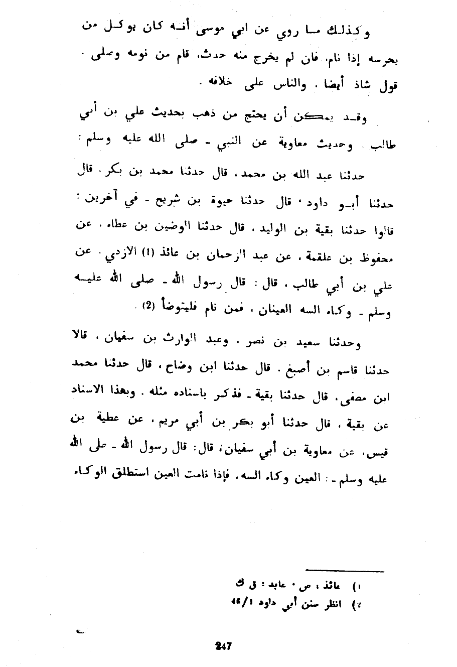 وَكَذَلِكَ مَا رُوِيَ عَنْ أَبِي مُوسَى أَنَّهُ كَانَ يُوكِلُ مَنْ يَحْرُسُهُ إِذَا نَامَ فَإِنْ لَمْ يَخْرُجْ مِنْهُ حَدَثٌ قَامَ مِنْ نَوْمِهِ وَصَلَّى قَوْلٌ شَاذٌّ أَيْضًا وَالنَّاسُ عَلَى خِلَافِهِ وَقَدْ يُمْكِنُ أَنْ يَحْتَجَّ مَنْ ذَهَبَ بِحَدِيثِ عَلِيِّ بْنِ أَبِي طَالِبٍ وَحَدِيثِ مُعَاوِيَةَ عَنِ النَّبِيِّ صَلَّى اللَّهُ عَلَيْهِ وَسَلَّمَ حَدَّثَنَا عَبْدُ اللَّهِ بْنُ مُحَمَّدٍ قَالَ حَدَّثَنَا مُحَمَّدُ بْنُ بَكْرٍ قَالَ حَدَّثَنَا أَبُو دَاوُدَ قَالَ حَدَّثَنَا حَيْوَةُ بْنُ شُرَيْحٍ فِي آخَرِينَ قَالُوا حَدَّثَنَا بَقِيَّةُ بْنُ الْوَلِيدِ قَالَ حَدَّثَنَا الْوَضِينُ بْنُ عَطَاءٍ عَنْ مَحْفُوظِ بْنِ عَلْقَمَةَ عَنْ عَبْدِ الرحمان بْنِ عَائِذٍ الْأَزْدِيِّ عَنْ عَلِيِّ بْنِ أَبِي طَالِبٍ قَالَ قَالَ رَسُولُ اللَّهِ صَلَّى اللَّهُ عَلَيْهِ وَسَلَّمَ وِكَاءُ السَّهِ الْعَيْنَانِ فَمَنْ نَامَ فَلْيَتَوَضَّأْ وَحَدَّثَنَا سَعِيدُ بْنُ نَصْرٍ وَعَبْدُ الْوَارِثِ بْنُ سُفْيَانَ قَالَا حَدَّثَنَا قَاسِمُ بْنُ أَصْبَغَ قَالَ حَدَّثَنَا ابْنُ وَضَّاحٍ قَالَ حَدَّثَنَا مُحَمَّدُ بْنُ مُصَفَّى قَالَ حَدَّثَنَا بَقِيَّةُ فَذَكَرَ بِإِسْنَادِهِ مِثْلَهُ وَبِهَذَا الْإِسْنَادِ عَنْ بَقِيَّةَ قَالَ حَدَّثَنَا أَبُو بَكْرِ بْنُ أَبِي مَرْيَمَ عَنْ عَطِيَّةَ بْنِ قَيْسٍ عَنْ مُعَاوِيَةَ بْنِ أَبِي سُفْيَانَ قَالَ قَالَ رَسُولُ اللَّهِ صَلَّى اللَّهُ عَلَيْهِ وَسَلَّمَ الْعَيْنُ وِكَاءُ السَّهِ فَإِذَا نَامَتِ الْعَيْنُ استطلق الوكاء
