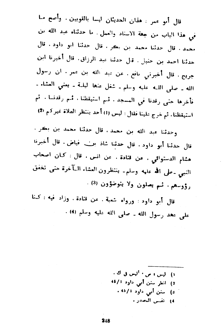 قَالَ أَبُو عُمَرَ هَذَانِ الْحَدِيثَانِ لَيْسَا بِالْقَوِيَّيْنِ وَأَصَحُّ مَا فِي هَذَا الْبَابِ مِنْ جِهَةِ الْإِسْنَادِ وَالْعَمَلِ مَا حَدَّثَنَاهُ عَبْدُ اللَّهِ بْنُ مُحَمَّدٍ قَالَ حَدَّثَنَا مُحَمَّدُ بْنُ بَكْرٍ قَالَ حَدَّثَنَا أَبُو دَاوُدَ قَالَ حَدَّثَنَا أَحْمَدُ بْنُ حَنْبَلٍ قَالَ حَدَّثَنَا عَبْدُ الرَّزَّاقِ قَالَ أَخْبَرَنَا ابْنُ جُرَيْجٍ قَالَ أَخْبَرَنِي نَافِعٍ عَنْ عَبْدِ اللَّهِ بْنِ عُمَرَ أَنَّ رَسُولَ اللَّهِ صَلَّى اللَّهُ عَلَيْهِ وَسَلَّمَ شُغِلَ عَنْهَا لَيْلَةً يَعْنِي الْعِشَاءَ فَأَخَّرَهَا حَتَّى رَقَدْنَا فِي الْمَسْجِدِ ثُمَّ اسْتَيْقَظْنَا ثُمَّ رَقَدْنَا ثُمَّ اسْتَيْقَظْنَا ثُمَّ خَرَجَ عَلَيْنَا فَقَالَ لَيْسَ أَحَدٌ يَنْتَظِرُ الصَّلَاةَ غَيْرُكُمْ وَحَدَّثَنَا عَبْدُ اللَّهِ بْنُ مُحَمَّدٍ قَالَ حَدَّثَنَا مُحَمَّدُ بْنُ بَكْرٍ قَالَ حَدَّثَنَا أَبُو دَاوُدَ قَالَ حَدَّثَنَا شَاذُّ بْنُ فَيَّاضٍ قَالَ أَخْبَرَنَا هِشَامٌ الدَّسْتُوَائِيُّ عَنْ قَتَادَةَ عَنْ أَنَسٍ قَالَ كَانَ أَصْحَابُ النَّبِيِّ صَلَّى اللَّهُ عَلَيْهِ وَسَلَّمَ ينتظرون العشاء الآخرة حتى تخفق رؤوسهم ثم يصلون ولا يتوضؤون قَالَ أَبُو دَاوُدَ وَرَوَاهُ شُعْبَةُ عَنْ قَتَادَةَ وَزَادَ فِيهِ كُنَّا عَلَى عَهْدِ رَسُولِ اللَّهِ صَلَّى اللَّهُ عَلَيْهِ وَسَلَّمَ