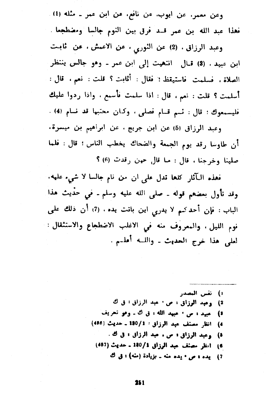 وَعَنْ مَعْمَرٍ عَنْ أَيُّوبَ عَنْ نَافِعٍ عَنِ ابْنِ عُمَرَ مِثْلُهُ فَهَذَا عَبْدُ اللَّهِ بْنُ عُمَرَ قَدْ فَرَّقَ بَيْنَ النَّوْمِ جَالِسًا وَمُضْطَجِعًا وَعَبْدُ الرَّزَّاقِ عَنِ الثَّوْرِيِّ عَنِ الْأَعْمَشِ عَنْ ثَابِتِ بْنِ عُبَيْدٍ قَالَ انْتَهَيْتُ إِلَى ابْنِ عُمَرَ وَهُوَ جَالِسٌ يَنْتَظِرُ الصَّلَاةَ فَسَلَّمْتُ فَاسْتَيْقَظَ فَقَالَ أَثَابِتٌ قُلْتُ نَعَمْ قَالَ أَسَلَّمْتَ قُلْتُ نَعَمْ قَالَ إِذَا سَلَّمْتَ فَأَسْمِعْ وَإِذَا رَدُّوا عَلَيْكَ فَلْيُسْمِعُوكَ قَالَ ثُمَّ قَامَ فَصَلَّى وَكَانَ مُحْتَبِيًا قَدْ نَامَ وَعَبْدُ الرَّزَّاقِ عَنِ ابْنِ جُرَيْجٍ عَنْ إِبْرَاهِيمَ بْنِ مَيْسَرَةَ أَنَّ طَاوُسًا رَقَدَ يَوْمَ الْجُمُعَةِ وَالضَّحَّاكُ يَخْطُبُ النَّاسَ قَالَ فَلَمَّا صَلَّيْنَا وَخَرَجْنَا قَالَ مَا قَالَ حِينَ رَقَدْتُ فَهَذِهِ الْآثَارُ كُلُّهَا تَدُلُّ عَلَى أَنَّ مَنْ نَامَ جَالِسًا لَا شَيْءَ عَلَيْهِ وَقَدْ تَأَوَّلَ بَعْضُهُمْ قَوْلَهُ صَلَّى اللَّهُ عَلَيْهِ وَسَلَّمَ فِي حَدِيثِ هَذَا الْبَابِ فَإِنَّ أَحَدَكُمْ لَا يَدْرِي أَيْنَ بَاتَتْ يَدُهُ أَنَّ ذَلِكَ عَلَى نَوْمِ اللَّيْلِ وَالْمَعْرُوفُ مِنْهُ فِي الْأَغْلَبِ الِاضْطِجَاعُ وَالِاسْتِثْقَالُ لَعَلَى هَذَا خَرَجَ الْحَدِيثُ وَاللَّهُ أَعْلَمُ