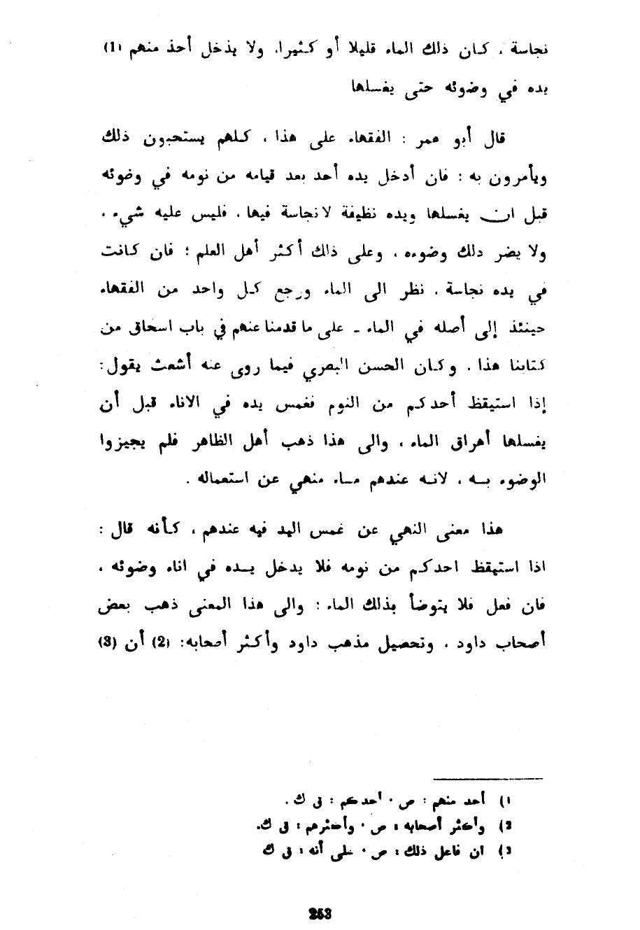 نَجَاسَةٌ كَانَ ذَلِكَ الْمَاءُ قَلِيلًا أَوْ كَثِيرًا وَلَا يُدْخِلُ أَحَدٌ مِنْهُمْ يَدَهُ فِي وَضُوئِهِ حَتَّى يَغْسِلَهَا قَالَ أَبُو عُمَرَ الْفُقَهَاءُ عَلَى هَذَا كُلُّهُمْ يَسْتَحِبُّونَ ذَلِكَ وَيَأْمُرُونَ بِهِ فَإِنْ أَدْخَلَ يَدَهُ أَحَدٌ بَعْدَ قِيَامِهِ مِنْ نَوْمِهِ فِي وَضُوئِهِ قَبْلَ أَنْ يَغْسِلَهَا وَيَدُهُ نَظِيفَةٌ لَا نَجَاسَةَ فِيهَا فَلَيْسَ عَلَيْهِ شَيْءٌ وَلَا يَضُرُّ ذَلِكَ وُضُوءَهُ وَعَلَى ذَلِكَ أَكْثَرُ أَهْلِ الْعِلْمِ فَإِنْ كَانَتْ فِي يَدِهِ نَجَاسَةٌ نُظِرَ إِلَى الْمَاءِ وَرَجَعَ كُلُّ وَاحِدٍ مِنَ الْفُقَهَاءِ حِينَئِذٍ إِلَى أَصْلِهِ فِي الْمَاءِ عَلَى مَا قَدَّمْنَا عَنْهُمْ فِي بَابِ إِسْحَاقَ مِنْ كِتَابِنَا هَذَا وَكَانَ الْحَسَنُ الْبَصْرِيُّ فِيمَا رَوَى عَنْهُ أَشْعَثُ يَقُولُ إِذَا اسْتَيْقَظَ أَحَدُكُمْ مِنَ النَّوْمِ فَغَمَسَ يَدَهُ فِي الْإِنَاءِ قَبْلَ أَنْ يَغْسِلَهَا أَهْرَاقَ الْمَاءَ وَإِلَى هَذَا ذَهَبَ أَهْلُ الظَّاهِرِ فَلَمْ يُجِيزُوا الْوُضُوءَ بِهِ لِأَنَّهُ عِنْدَهُمْ مَاءٌ مَنْهِيٌّ عَنِ اسْتِعْمَالِهِ هَذَا مَعْنَى النَّهْيِ عَنْ غَمْسِ الْيَدِ فِيهِ عِنْدَهُمْ كَأَنَّهُ قَالَ إِذَا اسْتَيْقَظَ أَحَدُكُمْ مِنْ نَوْمِهِ فَلَا يُدْخِلْ يَدَهُ فِي إِنَاءِ وَضُوئِهِ فَإِنْ فَعَلَ فَلَا يَتَوَضَّأُ بِذَلِكَ الْمَاءِ وَإِلَى هَذَا الْمَعْنَى ذَهَبَ بَعْضُ أَصْحَابِ دَاوُدَ وَتَحْصِيلُ مَذْهَبِ دَاوُدَ وَأَكْثَرِ أَصْحَابِهِ أن