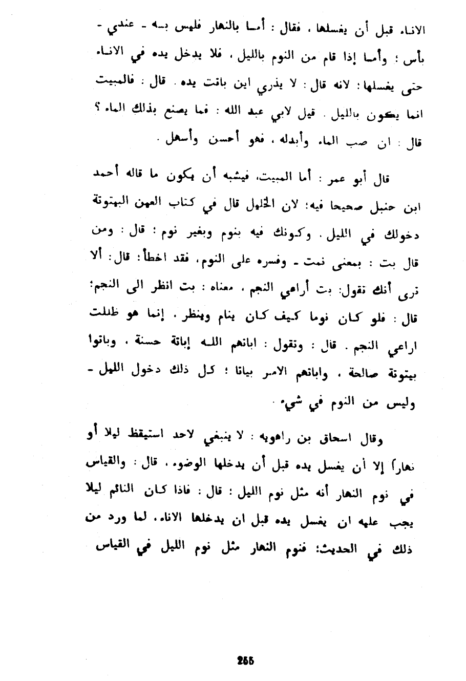 الْإِنَاءِ قَبْلَ أَنْ يَغْسِلَهَا فَقَالَ أَمَّا بِالنَّهَارِ فَلَيْسَ بِهِ عِنْدِي بَأْسٌ وَأَمَّا إِذَا قَامَ مِنَ النَّوْمِ بِاللَّيْلِ فَلَا يُدْخِلْ يَدَهُ فِي الْإِنَاءِ حَتَّى يَغْسِلَهَا لِأَنَّهُ قَالَ لَا يَدْرِي أَيْنَ بَاتَتْ يَدُهُ قَالَ فَالْمَبِيتُ إِنَّمَا يَكُونُ بِاللَّيْلِ قِيلَ لِأَبِي عَبْدِ اللَّهِ فَمَا يَصْنَعُ بِذَلِكَ الْمَاءِ قَالَ إِنْ صَبَّ الْمَاءَ وَأَبْدَلَهُ فَهُوَ أَحْسَنُ وَأَسْهَلُ قَالَ أَبُو عُمَرَ أَمَّا الْمَبِيتُ فَيُشْبِهُ أَنْ يَكُونَ مَا قَالَهُ أَحْمَدُ بْنُ حَنْبَلٍ صَحِيحًا فِيهِ لِأَنَّ الْخَلِيلَ قَالَ فِي كِتَابِ الْعَيْنِ الْبَيْتُوتَةُ دُخُولُكَ فِي اللَّيْلِ وَكَوْنُكَ فِيهِ بِنَوْمٍ وَبِغَيْرِ نَوْمٍ قَالَ وَمَنْ قَالَ بِتُّ بِمَعْنَى نِمْتُ وَفَسَّرَهُ عَلَى النَّوْمِ فَقَدْ أَخْطَأَ قَالَ أَلَا تَرَى أَنَّكَ تَقُولُ بِتُّ أُرَاعِي النَّجْمَ مَعْنَاهُ بِتُّ أَنْظُرُ إِلَى النَّجْمِ قَالَ فَلَوْ كَانَ نَوْمًا كَيْفَ كَانَ يَنَامُ وَيَنْظُرُ إِنَّمَا هُوَ ظَلِلْتُ أُرَاعِي النَّجْمَ قَالَ وَتَقُولُ أَبَاتَهُمُ اللَّهُ إِبَاتَةً حَسَنَةً وَبَاتُوا بَيْتُوتَةً صَالِحَةً وَأَبَاتَهُمُ الْأَمْرُ بَيَاتًا كُلُّ ذَلِكَ دُخُولُ اللَّيْلِ وَلَيْسَ مِنَ النَّوْمِ فِي شَيْءٍ وَقَالَ إِسْحَاقُ بْنُ رَاهَوَيْهِ لَا يَنْبَغِي لِأَحَدٍ اسْتَيْقَظَ لَيْلًا أَوْ نَهَارًا إِلَّا أَنْ يَغْسِلَ يَدَهُ قَبْلَ أَنْ يُدْخِلَهَا الْوُضُوءَ قَالَ وَالْقِيَاسُ فِي نَوْمِ النَّهَارِ أَنَّهُ مِثْلُ نَوْمِ اللَّيْلِ قَالَ فَإِذَا كَانَ النَّائِمُ لَيْلًا يَجِبُ عَلَيْهِ أَنْ يَغْسِلَ يَدَهُ قَبْلَ أَنْ يُدْخِلَهَا الْإِنَاءَ لِمَا وَرَدَ مِنْ ذَلِكَ فِي الْحَدِيثِ فَنَوْمُ النَّهَارِ مِثْلُ نَوْمِ اللَّيْلِ فِي الْقِيَاسِ