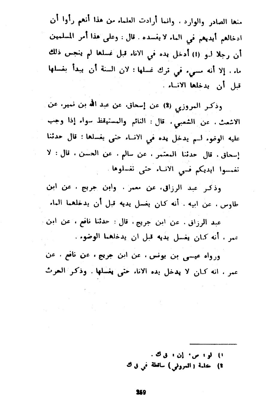 مِنْهَا الصَّادِرُ وَالْوَارِدُ وَإِنَّمَا أَرَادَتِ الْعُلَمَاءُ مِنْ هذا أنهم رأوا أن إدخاهلم أَيْدِيَهُمْ فِي الْمَاءِ لَا يُفْسِدُهُ قَالَ وَعَلَى هَذَا أَمْرُ الْمُسْلِمِينَ أَنَّ رَجُلًا لَوْ أَدْخَلَ يَدَهُ فِي الْإِنَاءِ قَبْلَ غَسْلِهَا لَمْ يُنَجِّسْ ذَلِكَ مَاءً إِلَّا أَنَّهُ مُسِيءٌ فِي تَرْكِ غلسها لِأَنَّ السُّنَّةَ أَنْ يَبْدَأَ بِغَسْلِهَا قَبْلَ أَنْ يُدْخِلَهَا الْإِنَاءَ وَذَكَرَ الْمَرْوَزِيُّ عَنْ إِسْحَاقَ عَنْ عَبْدِ اللَّهِ بْنِ نُمَيْرٍ عَنِ الْأَشْعَثِ عَنِ الشَّعْبِيِّ قَالَ النَّائِمُ وَالْمُسْتَيْقِظُ سَوَاءٌ إِذَا وَجَبَ عَلَيْهِ الْوُضُوءُ لَمْ يُدْخِلْ يَدَهُ فِي الْإِنَاءِ حَتَّى يَغْسِلَهَا قَالَ حَدَّثَنَا إِسْحَاقُ قَالَ حَدَّثَنَا الْمُعْتَمِرُ عَنْ سَالِمٍ عَنِ الْحَسَنِ قَالَ لَا تَغْمِسُوا أَيْدِيَكُمْ فِي الْإِنَاءِ حَتَّى تَغْسِلُوهَا وَذَكَرَ عَبْدُ الرَّزَّاقِ عَنْ مَعْمَرٍ وَابْنُ جُرَيْجٍ عَنِ ابْنِ طَاوُسٍ عَنْ أَبِيهِ أَنَّهُ كَانَ يَغْسِلُ يَدَيْهِ قَبْلَ أَنْ يُدْخِلَهُمَا الْمَاءَ عَبْدُ الرَّزَّاقِ عَنِ ابْنِ جُرَيْجٍ قَالَ حَدَّثَنَا نَافِعٌ عَنِ ابْنِ عُمَرَ أَنَّهُ كَانَ يَغْسِلُ يَدَيْهِ قَبْلَ أَنْ يُدْخِلَهُمَا الْوَضُوءَ وَرَوَاهُ عِيسَى بْنُ يُونُسَ عَنِ ابْنِ جُرَيْجٍ عَنْ نَافِعٍ عَنِ ابْنِ عُمَرَ أَنَّهُ كَانَ لَا يُدْخِلُ يَدَهُ الْإِنَاءَ حتى يغسلها وذكر الحرث