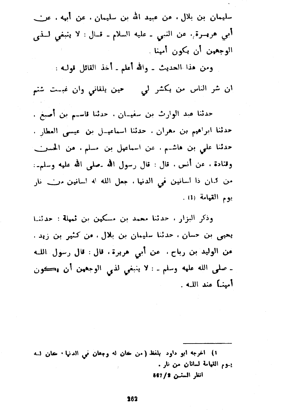 سليمان بن بلال عن عبيد الله بن سُلَيْمَانَ عَنْ أَبِيهِ عَنْ أَبِي هُرَيْرَةَ عَنِ النَّبِيِّ عَلَيْهِ السَّلَامُ قَالَ لَا يَنْبَغِي لِذِي الْوَجْهَيْنِ أَنْ يَكُونَ أَمِينًا وَمِنْ هَذَا الْحَدِيثِ وَاللَّهُ أَعْلَمُ أَخَذَ الْقَائِلُ قَوْلَهُ ... إِنَّ شَرَّ النَّاسِ مَنْ يَكْشِرُ لِي ... حِينَ يَلْقَانِي وَإِنْ غِبْتُ شَتَمَ ...
