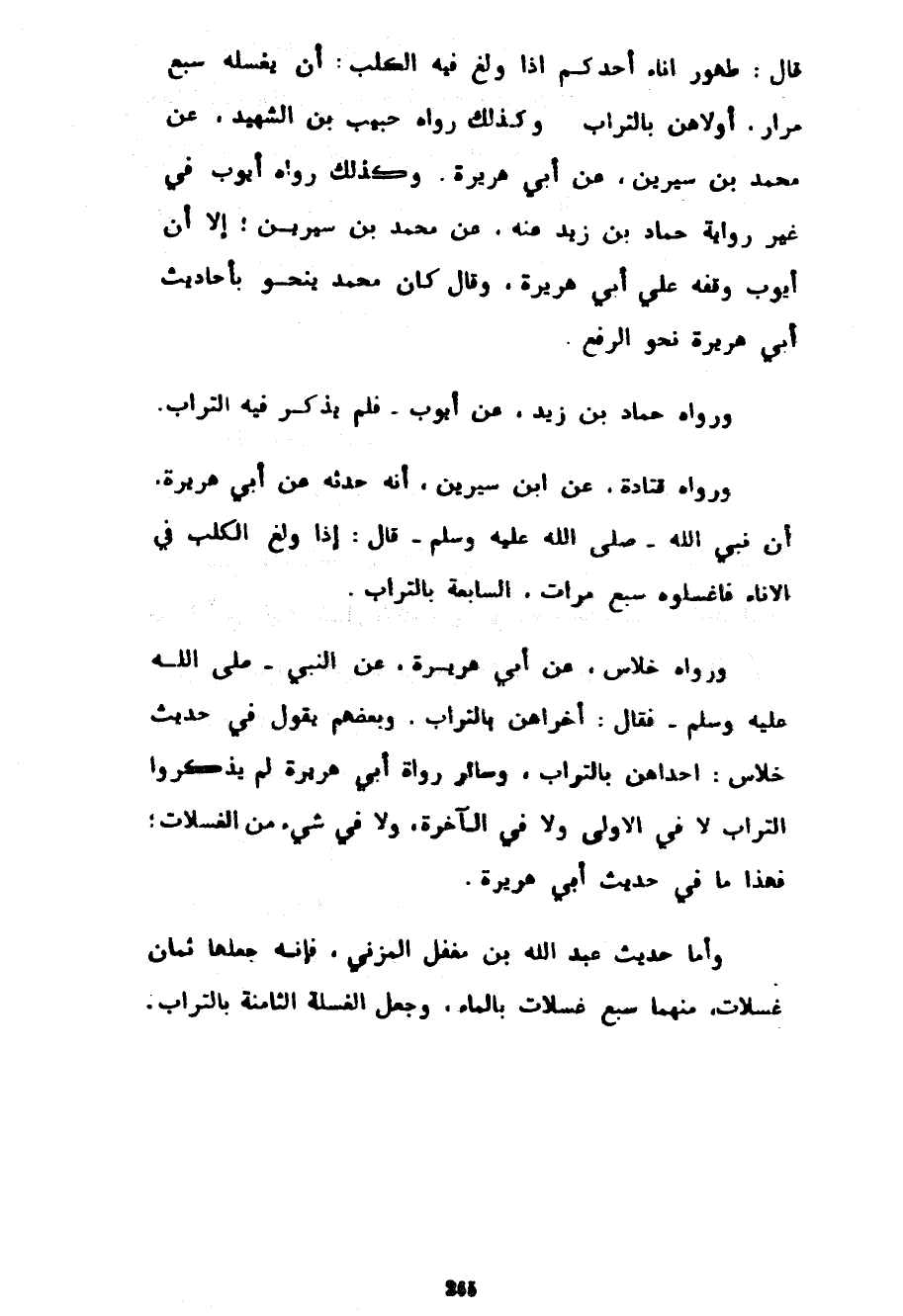 قَالَ طَهُورُ إِنَاءِ أَحَدِكُمْ إِذَا وَلَغَ فِيهِ الْكَلْبُ أَنْ يَغْسِلَهُ سَبْعَ مِرَارٍ أُولَاهُنَّ بِالتُّرَابِ وَكَذَلِكَ رَوَاهُ حَبِيبُ بْنُ الشَّهِيدِ عَنْ مُحَمَّدِ بْنِ سِيرِينَ عَنْ أَبِي هُرَيْرَةَ وَكَذَلِكَ رَوَاهُ أَيُّوبُ فِي غَيْرِ رِوَايَةِ حَمَّادِ بْنِ زَيْدٍ عَنْهُ عَنْ مُحَمَّدِ بْنِ سِيرِينَ إِلَّا أَنَّ أَيُّوبَ وَقَفَهُ عَلَى أَبِي هُرَيْرَةَ وَقَالَ كَانَ مُحَمَّدٌ يَنْحُو بِأَحَادِيثِ أَبِي هُرَيْرَةَ نَحْوَ الرَّفْعِ وَرَوَاهُ حَمَّادُ بْنُ زَيْدٍ عَنْ أَيُّوبَ فَلَمْ يَذْكُرْ فِيهِ التُّرَابَ وَرَوَاهُ قَتَادَةُ عَنِ ابْنِ سِيرِينَ أَنَّهُ حَدَّثَهُ عَنْ أَبِي هُرَيْرَةَ أَنَّ نَبِيَّ اللَّهِ صَلَّى اللَّهُ عَلَيْهِ وَسَلَّمَ قَالَ إِذَا وَلَغَ الْكَلْبُ فِي الْإِنَاءِ فَاغْسِلُوهُ سَبْعَ مَرَّاتٍ السَّابِعَةُ بِالتُّرَابِ وَرَوَاهُ خِلَاسٌ عَنْ أَبِي هُرَيْرَةَ عَنِ النَّبِيِّ صَلَّى اللَّهُ عليه وسلم فَقَالَ أُخْرَاهُنَّ بِالتُّرَابِ وَبَعْضُهُمْ يَقُولُ فِي حَدِيثِ خِلَاسٍ إِحْدَاهُنَّ بِالتُّرَابِ وَسَائِرُ رُوَاةِ أَبِي هُرَيْرَةَ لَمْ يَذْكُرُوا التُّرَابَ لَا فِي الْأُولَى وَلَا فِي الْآخِرَةِ وَلَا فِي شَيْءٍ مِنَ الْغَسَلَاتِ فَهَذَا مَا فِي حَدِيثِ أَبِي هُرَيْرَةَ وَأَمَّا حَدِيثُ عَبْدِ اللَّهِ بْنِ مُغَفَّلٍ الْمُزَنِيِّ فَإِنَّهُ جَعَلَهَا ثَمَانِ غَسَلَاتٍ مِنْهُمَا سَبْعُ غَسَلَاتٍ بِالْمَاءِ وَجَعَلَ الْغَسْلَةَ الثَّامِنَةَ بِالتُّرَابِ