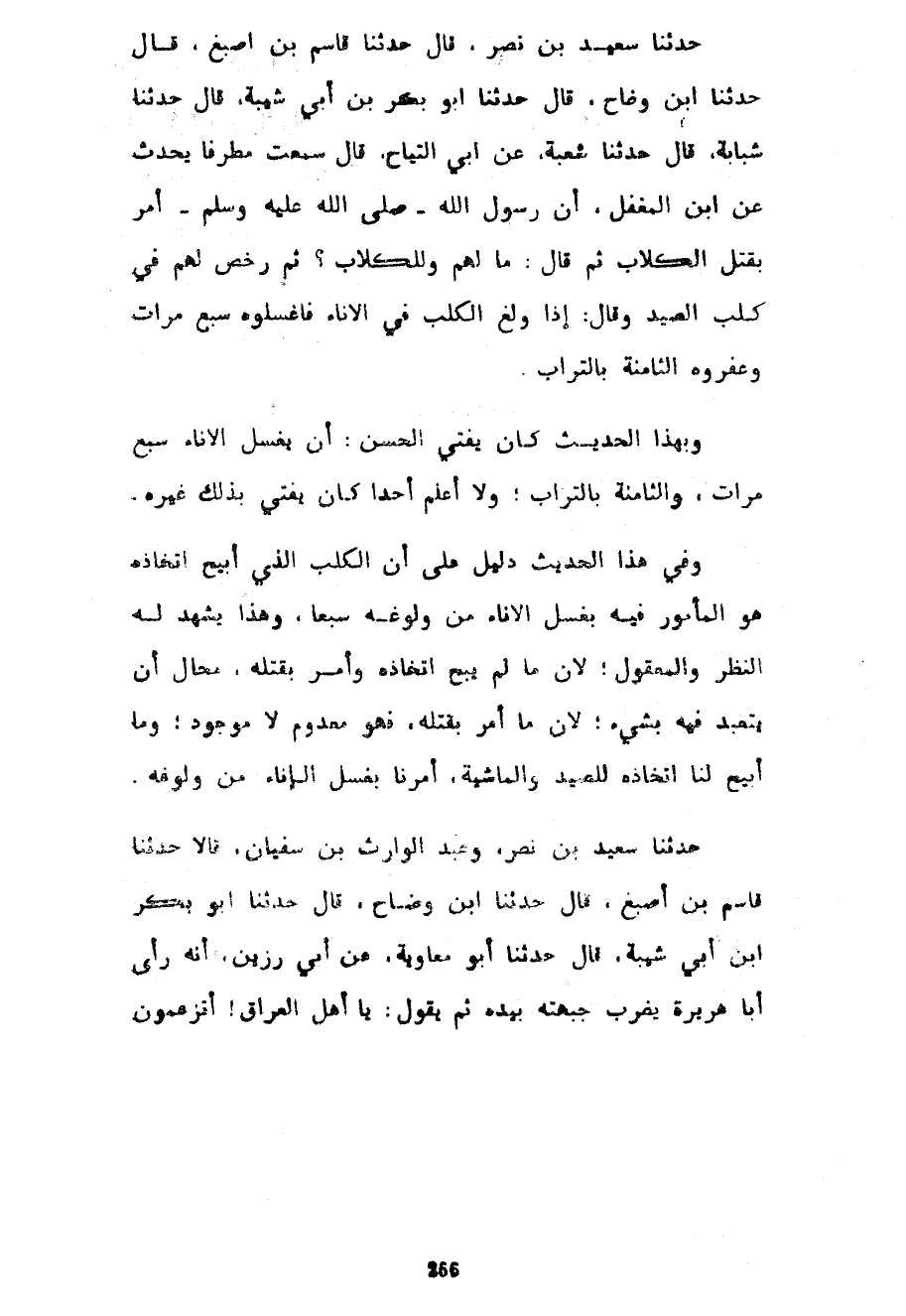 حَدَّثَنَا سَعِيدُ بْنُ نَصْرٍ قَالَ حَدَّثَنَا قَاسِمُ بْنُ أَصْبَغَ قَالَ حَدَّثَنَا ابْنُ وَضَّاحٍ قَالَ حَدَّثَنَا أَبُو بَكْرِ بْنُ أَبِي شَيْبَةَ قَالَ حَدَّثَنَا شَبَابَةُ قَالَ حَدَّثَنَا شُعْبَةُ عَنْ أَبِي التَّيَّاحِ قَالَ سَمِعْتُ مُطَرِّفًا يُحَدِّثُ عَنِ ابْنِ الْمُغَفَّلِ أَنَّ رَسُولَ اللَّهِ صَلَّى اللَّهُ عَلَيْهِ وَسَلَّمَ أَمَرَ بِقَتْلِ الْكِلَابِ ثُمَّ قَالَ مَا لَهُمْ وَلِلْكِلَابِ ثُمَّ رَخَّصَ لَهُمْ فِي كَلْبِ الصَّيْدِ وَقَالَ إِذَا وَلَغَ الْكَلْبُ فِي الْإِنَاءِ فَاغْسِلُوهُ سَبْعَ مَرَّاتٍ وَعَفِّرُوهُ الثَّامِنَةَ بِالتُّرَابِ وَبِهَذَا الْحَدِيثِ كَانَ يُفْتِي الْحَسَنُ أَنْ يُغْسَلَ الْإِنَاءُ سَبْعَ مَرَّاتٍ وَالثَّامِنَةَ بِالتُّرَابِ وَلَا أَعْلَمُ أَحَدًا كَانَ يُفْتِي بِذَلِكَ غَيْرَهُ وَفِي هَذَا الْحَدِيثِ دَلِيلٌ عَلَى أَنَّ الْكَلْبَ الَّذِي أُبِيحَ اتِّخَاذُهُ هُوَ الْمَأْمُورُ فِيهِ بِغَسْلِ الْإِنَاءِ مِنْ وُلُوغِهِ سَبْعًا وَهَذَا يَشْهَدُ لَهُ النَّظَرُ وَالْمَعْقُولُ لِأَنَّ مَا لَمْ يُبَحِ اتِّخَاذُهُ وَأُمِرَ بِقَتْلِهِ مُحَالٌ أَنْ يُتَعَبَّدَ فِيهِ بِشَيْءٍ لِأَنَّ مَا أُمِرَ بِقَتْلِهِ فَهُوَ مَعْدُومٌ لَا مَوْجُودٌ وَمَا أُبِيحَ لَنَا اتِّخَاذُهُ لِلصَّيْدِ وَالْمَاشِيَةِ أُمِرْنَا بِغَسْلِ الْإِنَاءِ مِنْ وُلُوغِهِ حَدَّثَنَا سَعِيدُ بْنُ نَصْرٍ وَعَبْدُ الْوَارِثِ بْنُ سُفْيَانَ قَالَا حَدَّثَنَا قَاسِمُ بْنُ أَصْبَغَ قَالَ حَدَّثَنَا ابْنُ وَضَّاحٍ قَالَ حَدَّثَنَا أَبُو بَكْرِ بْنُ أَبِي شَيْبَةَ قَالَ حَدَّثَنَا أَبُو مُعَاوِيَةَ عَنْ أَبِي رَزِينٍ أَنَّهُ رَأَى أَبَا هُرَيْرَةَ يَضْرِبُ جَبْهَتَهُ بِيَدِهِ ثُمَّ يَقُولُ يَا أَهْلَ الْعِرَاقِ أَتَزْعُمُونَ