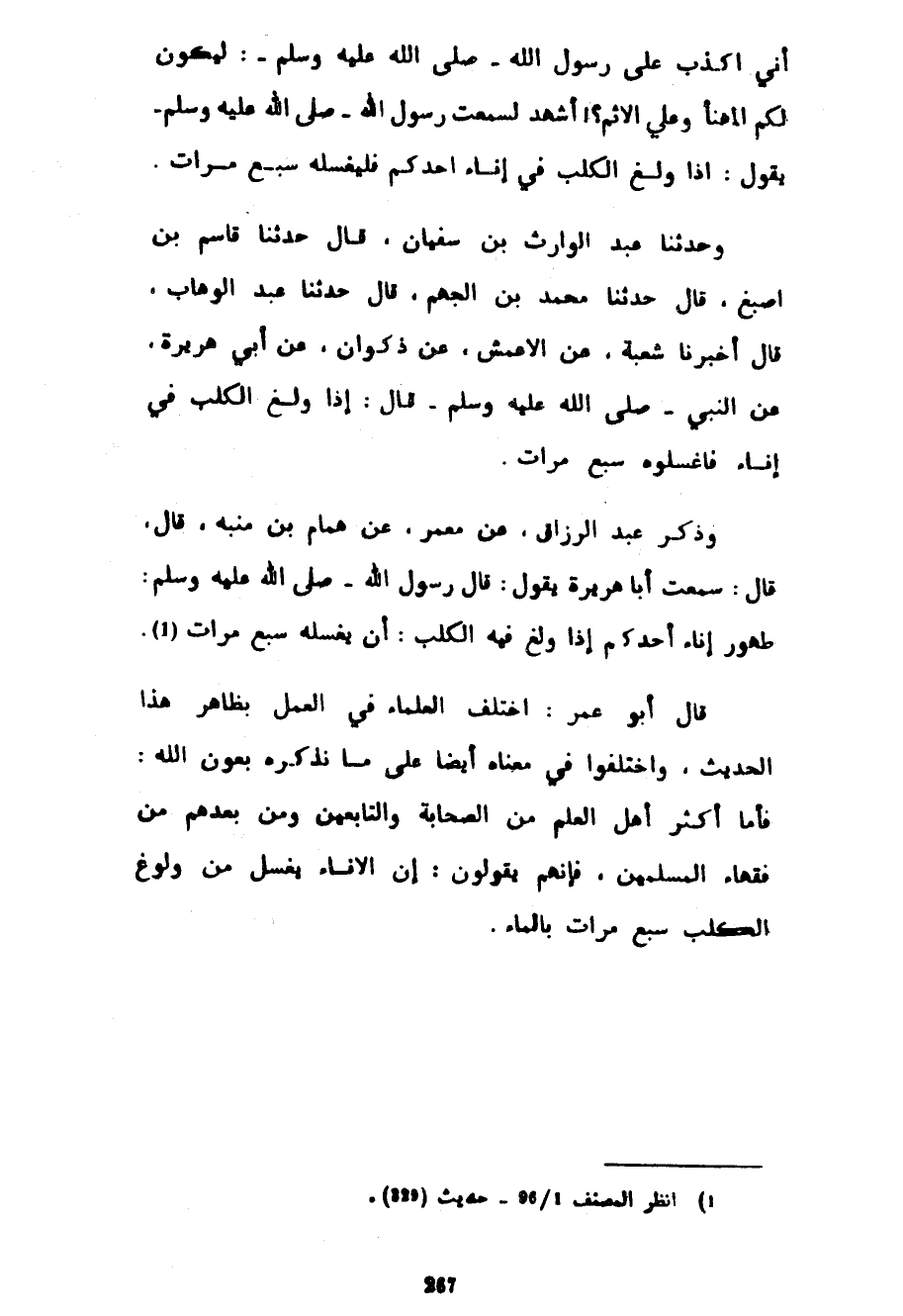 أَنِّي أَكْذِبُ عَلَى رَسُولِ اللَّهِ صَلَّى اللَّهُ عَلَيْهِ وَسَلَّمَ لِيَكُونَ لَكُمُ الْمَهْنَأُ وَعَلَيَّ الْإِثْمُ أَشْهَدُ لَسَمِعْتُ رَسُولَ اللَّهِ صَلَّى اللَّهُ عَلَيْهِ وَسَلَّمَ يَقُولُ إِذَا وَلَغَ الْكَلْبُ فِي إِنَاءِ أَحَدِكُمْ فَلْيَغْسِلْهُ سَبْعَ مَرَّاتٍ وَحَدَّثَنَا عَبْدُ الْوَارِثِ بْنُ سُفْيَانَ قَالَ حَدَّثَنَا قَاسِمُ بْنُ أَصْبَغَ قَالَ حَدَّثَنَا مُحَمَّدُ بْنُ الْجَهْمِ قَالَ حَدَّثَنَا عَبْدُ الْوَهَّابِ قَالَ أَخْبَرَنَا شُعْبَةُ عَنِ الْأَعْمَشِ عَنْ ذَكْوَانَ عَنْ أَبِي هُرَيْرَةَ عَنِ النَّبِيِّ صَلَّى اللَّهُ عَلَيْهِ وَسَلَّمَ قَالَ إِذَا وَلَغَ الْكَلْبُ فِي إِنَاءٍ فَاغْسِلُوهُ سَبْعَ مَرَّاتٍ وَذَكَرَ عَبْدُ الرَّزَّاقِ عَنْ مَعْمَرٍ عَنْ هَمَّامِ بْنِ مُنَبِّهٍ قَالَ قَالَ سَمِعْتُ أَبَا هُرَيْرَةَ يَقُولُ قَالَ رَسُولُ اللَّهِ صَلَّى اللَّهُ عَلَيْهِ وَسَلَّمَ طَهُورُ إِنَاءِ أَحَدِكُمْ إِذَا وَلَغَ فِيهِ الْكَلْبُ أَنْ يَغْسِلَهُ سَبْعَ مَرَّاتٍ قَالَ أَبُو عُمَرَ اخْتَلَفَ الْعُلَمَاءُ فِي الْعَمَلِ بِظَاهِرِ هَذَا الْحَدِيثِ وَاخْتَلَفُوا فِي مَعْنَاهُ أَيْضًا عَلَى مَا نَذْكُرُهُ بِعَوْنِ اللَّهِ فَأَمَّا أَكْثَرُ أَهْلِ الْعِلْمِ مِنَ الصَّحَابَةِ وَالتَّابِعِينَ وَمَنْ بَعْدَهُمْ مِنْ فُقَهَاءِ الْمُسْلِمِينَ فَإِنَّهُمْ يَقُولُونَ إِنَّ الْإِنَاءَ يُغْسَلُ مِنْ وُلُوغِ الْكَلْبِ سَبْعَ مَرَّاتٍ بِالْمَاءِ
