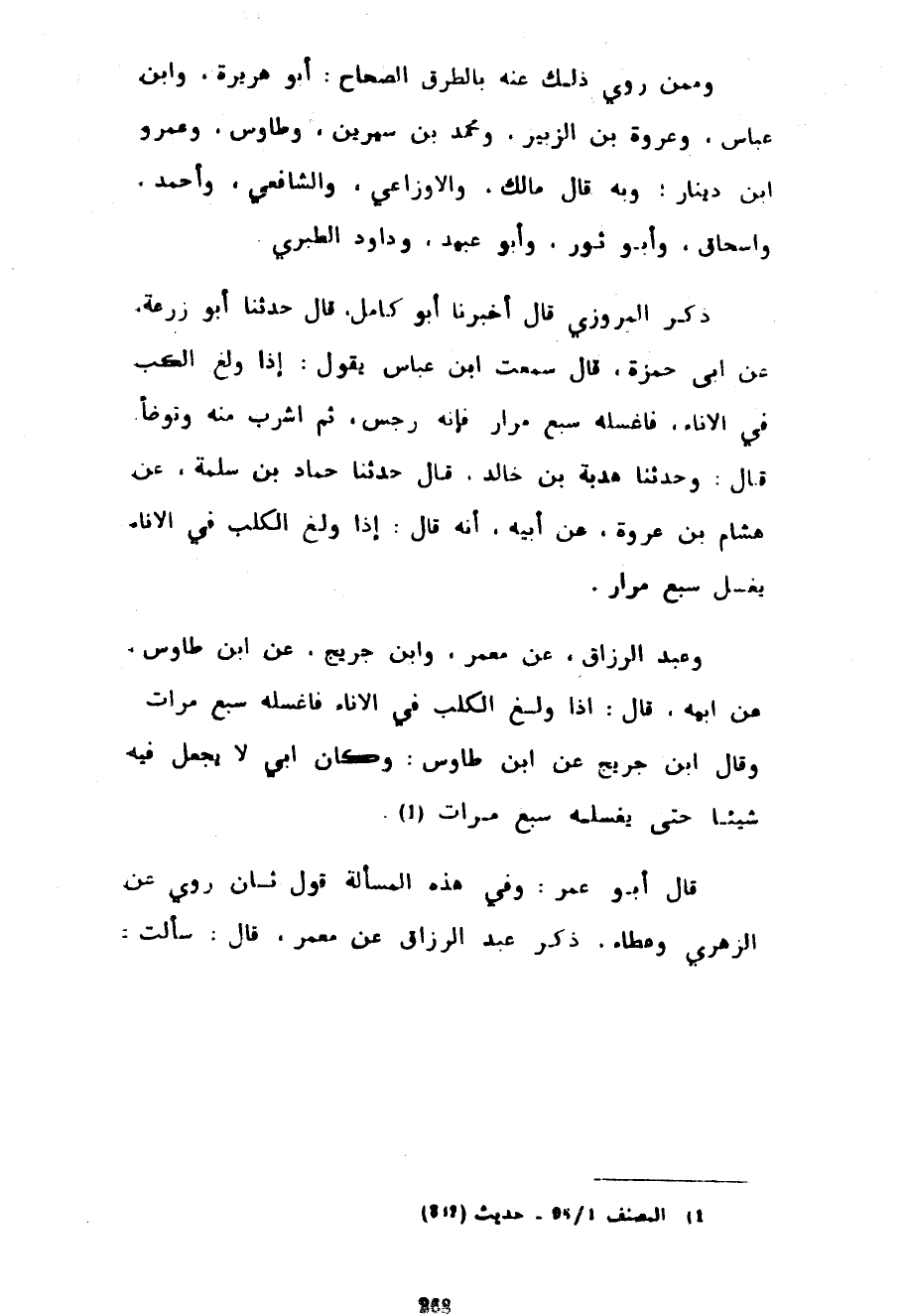 وممن روي ذلك بِالطُّرُقِ الصِّحَاحِ أَبُو هُرَيْرَةَ وَابْنُ عَبَّاسٍ وَعُرْوَةُ بْنُ الزُّبَيْرِ وَمُحَمَّدُ بْنُ سِيرِينَ وَطَاوُسٌ وَعَمْرُو بْنُ دِينَارٍ وَبِهِ قَالَ مَالِكٌ وَالْأَوْزَاعِيُّ وَالشَّافِعِيُّ وَأَحْمَدُ وَإِسْحَاقُ وَأَبُو ثَوْرٍ وَأَبُو عُبَيْدٍ وَدَاوُدُ الطَّبَرِيُّ ذَكَرَ الْمَرْوَزِيُّ قَالَ أَخْبَرَنَا أَبُو كَامِلٍ قال حدثا أَبُو زُرْعَةَ عَنْ أَبِي حَمْزَةَ قَالَ سَمِعْتُ ابْنَ عَبَّاسٍ يَقُولُ إِذَا وَلَغَ الْكَلْبُ فِي الإناء فاغلسه سَبْعَ مِرَارٍ فَإِنَّهُ رِجْسٌ ثُمَّ اشْرَبْ مِنْهُ وَتَوَضَّأْ قَالَ وَحَدَّثَنَا هُدْبَةُ بْنُ خَالِدٍ قَالَ حَدَّثَنَا حَمَّادُ بْنُ سَلَمَةَ عَنْ هِشَامِ بْنِ عُرْوَةَ عَنْ أَبِيهِ أَنَّهُ قَالَ إِذَا وَلَغَ الْكَلْبُ فِي الْإِنَاءِ يُغْسَلُ سَبْعَ مِرَارٍ وَعَبْدُ الرَّزَّاقِ عَنْ مَعْمَرٍ وَابْنِ جُرَيْجٍ عَنِ ابْنِ طَاوُسٍ عَنْ أَبِيهِ قَالَ إِذَا وَلَغَ الْكَلْبُ فِي الْإِنَاءِ فَاغْسِلْهُ سَبْعَ مَرَّاتٍ وَقَالَ ابْنُ جُرَيْجٍ عَنِ ابْنِ طَاوُسٍ وَكَانَ أَبِي لَا يَجْعَلُ فِيهِ شَيْئًا حَتَّى يَغْسِلَهُ سَبْعَ مَرَّاتٍ قَالَ أَبُو عُمَرَ وَفِي هَذِهِ الْمَسْأَلَةِ قَوْلٌ ثَانٍ رُوِيَ عَنِ الزُّهْرِيِّ وَعَطَاءٍ ذَكَرَ عَبْدُ الرَّزَّاقِ عَنْ مَعْمَرٍ قَالَ سَأَلْتُ