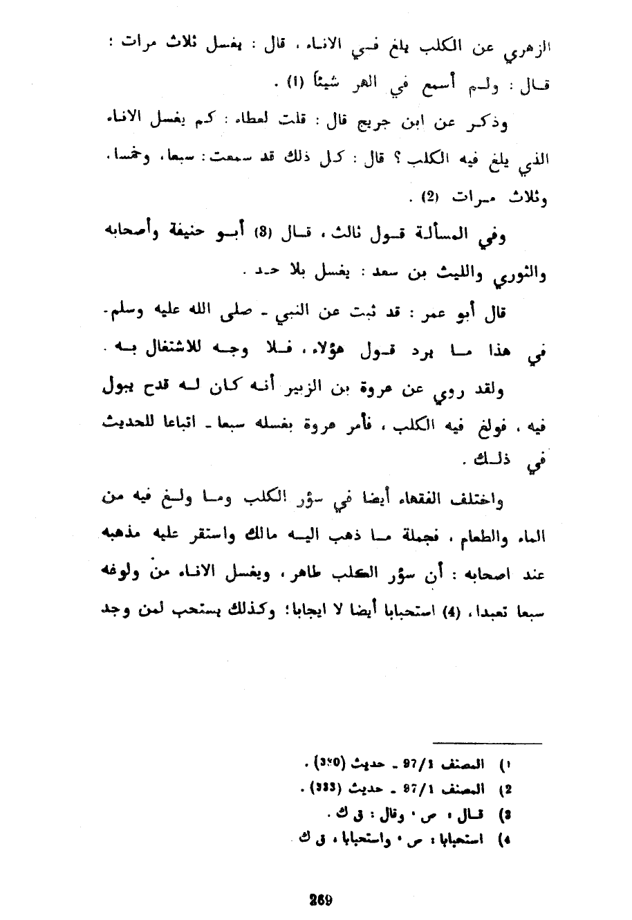 الزُّهْرِيَّ عَنِ الْكَلْبِ يَلَغُ فِي الْإِنَاءِ قَالَ يُغْسَلُ ثَلَاثَ مَرَّاتٍ قَالَ وَلَمْ أَسْمَعْ فِي الْهِرِّ شَيْئًا وَذُكِرَ عَنِ ابْنِ جُرَيْجٍ قَالَ قُلْتُ لِعَطَاءٍ كَمْ يُغْسَلُ الْإِنَاءُ الَّذِي يَلَغُ فِيهِ الْكَلْبُ قَالَ كُلُّ ذَلِكَ قَدْ سَمِعْتُ سَبْعًا وَخَمْسًا وَثَلَاثَ مَرَّاتٍ وَفِي الْمَسْأَلَةِ قَوْلٌ ثَالِثٌ قَالَ أَبُو حَنِيفَةَ وَأَصْحَابُهُ وَالثَّوْرِيُّ وَاللَّيْثُ بْنُ سَعْدٍ يُغْسَلُ بِلَا حَدٍّ قَالَ أَبُو عُمَرَ قَدْ ثَبَتَ عَنِ النَّبِيِّ صَلَّى اللَّهُ عَلَيْهِ وَسَلَّمَ فِي هَذَا مَا يَرُدُّ قَوْلَ هَؤُلَاءِ فَلَا وَجْهَ لِلِاشْتِغَالِ بِهِ وَلَقَدْ رُوِيَ عَنْ عُرْوَةَ بْنِ الزُّبَيْرِ أَنَّهُ كَانَ لَهُ قَدَحٌ يَبُولُ فِيهِ فَوَلَغَ فِيهِ الْكَلْبُ فَأَمَرَ عُرْوَةُ بِغَسْلِهِ سَبْعًا اتِّبَاعًا لِلْحَدِيثِ فِي ذَلِكَ وَاخْتَلَفَ الْفُقَهَاءُ أَيْضًا فِي سُؤْرِ الْكَلْبِ وَمَا وَلَغَ فِيهِ مِنَ الْمَاءِ وَالطَّعَامِ فَجُمْلَةُ مَا ذَهَبَ إِلَيْهِ مَالِكٌ وَاسْتَقَرَّ عَلَيْهِ مَذْهَبُهُ عِنْدَ أَصْحَابِهِ أَنَّ سُؤْرَ الْكَلْبِ طَاهِرٌ وَيُغْسَلُ الْإِنَاءُ مِنْ وُلُوغِهِ سَبْعًا تَعَبُّدًا اسْتِحْبَابًا أَيْضًا لَا إِيجَابًا وَكَذَلِكَ يُسْتَحَبُّ لِمَنْ وَجَدَ