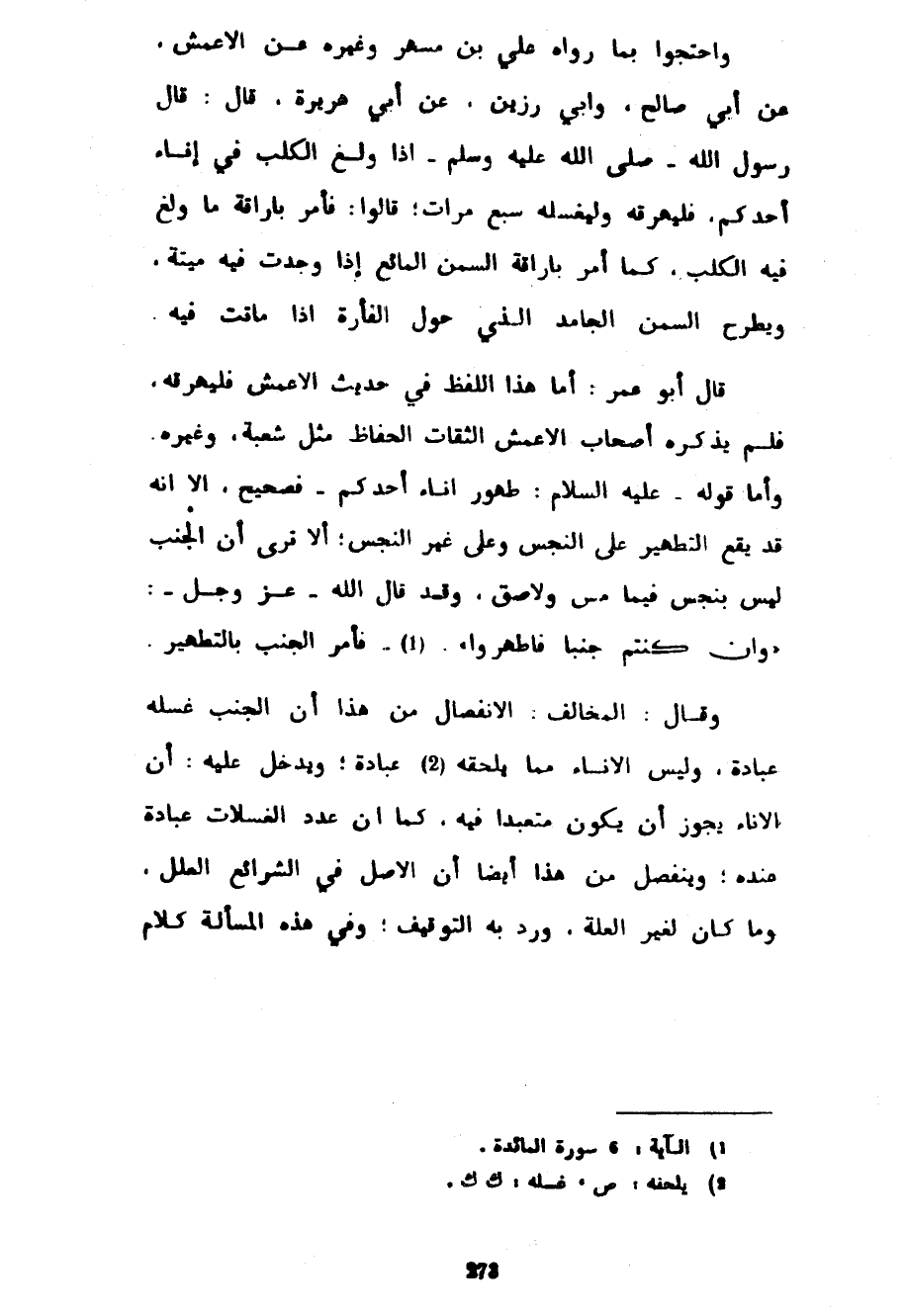 وَاحْتَجُّوا بِمَا رَوَاهُ عَلِيُّ بْنُ مُسْهِرٍ وَغَيْرُهُ عَنِ الْأَعْمَشِ عَنْ أَبِي صَالِحٍ وَأَبِي رَزِينٍ عَنْ أَبِي هُرَيْرَةَ قَالَ قَالَ رَسُولُ اللَّهِ صَلَّى اللَّهُ عَلَيْهِ وَسَلَّمَ إِذَا وَلَغَ الْكَلْبُ فِي إِنَاءِ أَحَدِكُمْ فَلْيُهْرِقْهُ وَلْيَغْسِلْهُ سَبْعَ مَرَّاتٍ قَالُوا فَأَمَرَ بِإِرَاقَةِ مَا وَلَغَ فِيهِ الْكَلْبُ كَمَا أَمَرَ بِإِرَاقَةِ السَّمْنِ الْمَائِعِ إِذَا وُجِدَتْ فِيهِ مَيْتَةٌ وَبِطَرْحِ السَّمْنِ الْجَامِدِ الَّذِي حَوْلَ الْفَأْرَةِ إِذَا مَاتَتْ فِيهِ قَالَ أَبُو عُمَرَ أَمَّا هَذَا اللَّفْظُ فِي حَدِيثِ الْأَعْمَشِ فَلْيُهْرِقْهُ فَلَمْ يَذْكُرْهُ أَصْحَابُ الْأَعْمَشِ الثِّقَاتُ الْحُفَّاظُ مِثْلَ شُعْبَةَ وَغَيْرِهِ وَأَمَّا قَوْلُهُ عَلَيْهِ السَّلَامُ طَهُورُ إِنَاءِ أَحَدِكُمْ فَصَحِيحٌ إِلَّا أَنَّهُ قَدْ يَقَعُ التَّطْهِيرُ عَلَى النَّجِسِ وَعَلَى غَيْرِ النَّجِسِ أَلَا تَرَى أَنَّ الْجُنُبَ لَيْسَ بِنَجِسٍ فِيمَا مَسَّ وَلَاصَقَ وَقَدْ قَالَ اللَّهُ عَزَّ وَجَلَّ وَإِنْ كُنْتُمْ جُنُبًا فَاطَّهَّرُوا فَأَمَرَ الْجُنُبَ بِالتَّطْهِيرِ وَقَالَ الْمُخَالِفُ الِانْفِصَالُ مِنْ هَذَا أَنَّ الْجُنُبَ غُسْلُهُ عِبَادَةٌ وَلَيْسَ الْإِنَاءُ مِمَّا يَلْحَقُهُ عِبَادَةٌ وَيَدْخُلُ عَلَيْهِ أَنَّ الْإِنَاءَ يَجُوزُ أَنْ يَكُونَ مُتَعَبَّدًا فِيهِ كَمَا أَنَّ عَدَدَ الْغَسَلَاتِ عِبَادَةٌ عِنْدَهُ وَيَنْفَصِلُ مِنْ هَذَا أَيْضًا أَنَّ الْأَصْلَ فِي الشَّرَائِعِ الْعِلَلُ وَمَا كَانَ لِغَيْرِ الْعِلَّةِ وَرَدَ به التوقيف وفي هذه المسأل كلام