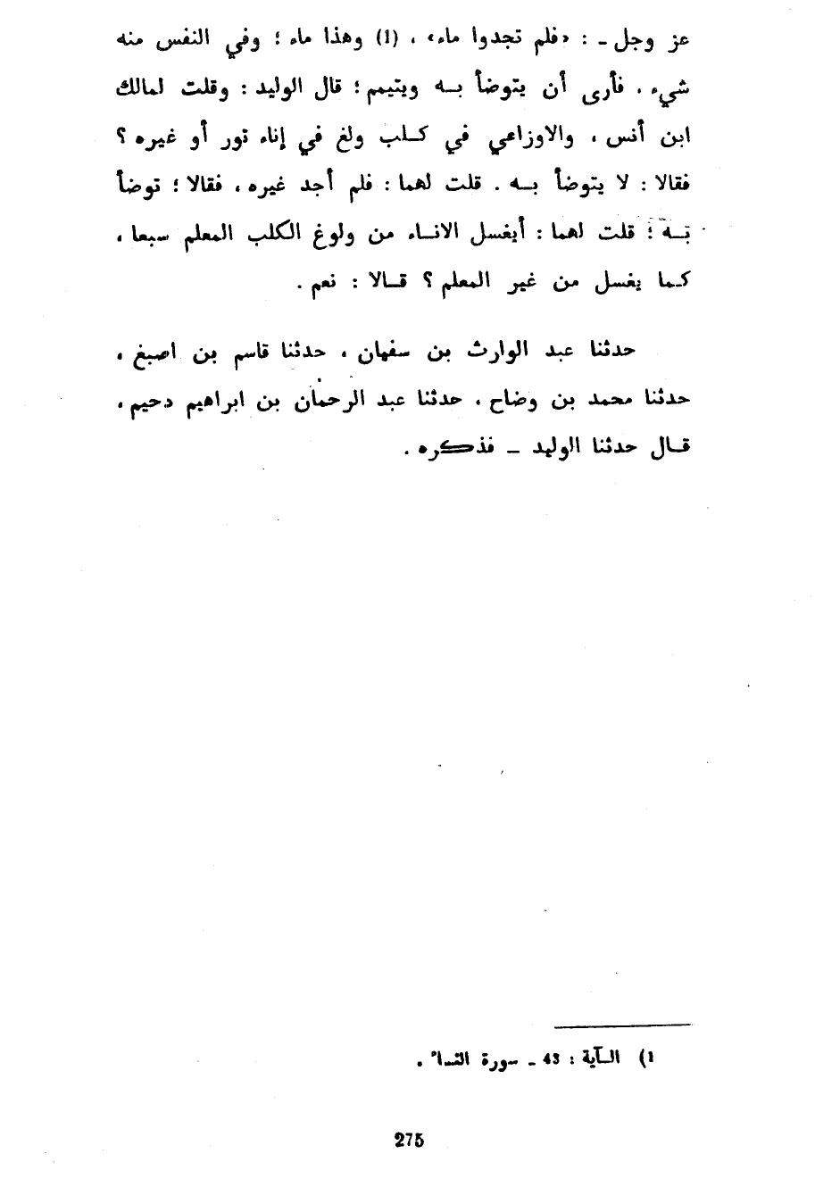 عَزَّ وَجَلَّ فَلَمْ تَجِدُوا مَاءً وَهَذَا مَاءٌ وَفِي النَّفْسِ مِنْهُ شَيْءٌ فَأَرَى أَنْ يُتَوَضَّأَ بِهِ وَيُتَيَمَّمَ قَالَ الْوَلِيدُ وَقُلْتُ لِمَالِكِ بْنِ أَنَسٍ وَالْأَوْزَاعِيِّ فِي كَلْبٍ وَلَغَ فِي إِنَاءِ تَوْرٍ أَوْ غَيْرِهِ فَقَالَا لَا يُتَوَضَّأُ بِهِ قُلْتُ لَهُمَا فَلَمْ أَجِدْ غَيْرَهُ فَقَالَا تَوَضَّأْ بِهِ قُلْتُ لَهُمَا أَيُغْسَلُ الْإِنَاءُ مِنْ وُلُوغِ الْكَلْبِ الْمُعَلَّمِ سَبْعًا كَمَا يُغْسَلُ مِنْ غَيْرِ الْمُعَلَّمِ قَالَا نَعَمْ حَدَّثَنَا عَبْدُ الْوَارِثِ بْنُ سُفْيَانَ حَدَّثَنَا قَاسِمُ بْنُ أَصْبَغَ حَدَّثَنَا مُحَمَّدُ بْنُ وَضَّاحٍ حَدَّثَنَا عبد الرحمان بْنُ إِبْرَاهِيمَ دُحَيْمٌ قَالَ حَدَّثَنَا الْوَلِيدُ فَذَكَرَهُ