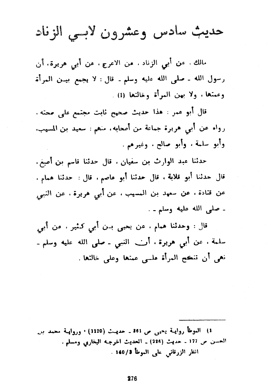 حَدِيثٌ سَادِسٌ وَعِشْرُونَ لِأَبِي الزِّنَادِ مَالِكٌ عَنْ أَبِي الزِّنَادِ عَنِ الْأَعْرَجِ عَنْ أَبِي هُرَيْرَةَ أَنَّ رَسُولَ اللَّهِ صَلَّى اللَّهُ عَلَيْهِ وسلم قَالَ لَا يُجْمَعُ بَيْنَ الْمَرْأَةِ وَعَمَّتِهَا وَلَا بَيْنَ الْمَرْأَةِ وَخَالَتِهَا قَالَ أَبُو عُمَرَ هَذَا حَدِيثٌ صَحِيحٌ ثَابِتٌ مُجْتَمَعٌ عَلَى صِحَّتِهِ رَوَاهُ عَنْ أَبِي هُرَيْرَةَ جَمَاعَةٌ مِنْ أَصْحَابِهِ مِنْهُمْ سَعِيدُ بْنُ الْمُسَيَّبِ وَأَبُو سَلَمَةُ وَأَبُو صَالِحٍ وَغَيْرُهُمْ حَدَّثَنَا عَبْدُ الْوَارِثِ بْنُ سُفْيَانَ قَالَ حَدَّثَنَا قَاسِمُ بْنُ أَصْبَغَ قَالَ حَدَّثَنَا أَبُو قِلَابَةَ قَالَ حَدَّثَنَا أَبُو عَاصِمٍ قَالَ حَدَّثَنَا هَمَّامٌ عَنْ قَتَادَةَ عَنْ سَعِيدِ بْنِ الْمُسَيَّبِ عَنْ أَبِي هُرَيْرَةَ عَنِ النَّبِيِّ صَلَّى اللَّهُ عَلَيْهِ وَسَلَّمَ قَالَ وَحَدَّثَنَا هَمَّامٌ عَنْ يَحْيَى بْنِ أَبِي كَثِيرٍ عَنْ أَبِي سَلَمَةَ عَنْ أَبِي هُرَيْرَةَ أَنَّ النَّبِيَّ صَلَّى اللَّهُ عَلَيْهِ وَسَلَّمَ نَهَى أَنْ تُنْكَحَ الْمَرْأَةُ عَلَى عَمَّتِهَا وعلى خالتها