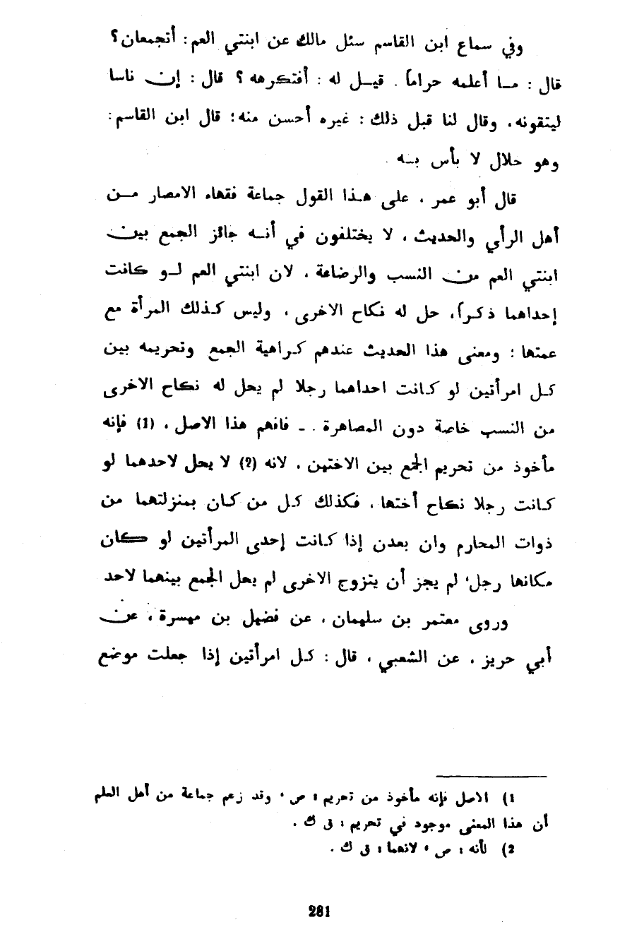 وَفِي سَمَاعِ ابْنِ الْقَاسِمِ سُئِلَ مَالِكٌ عَنِ ابْنَتَيِ الْعَمِّ أَتُجْمَعَانِ قَالَ مَا أَعْلَمُهُ حَرَامًا قِيلَ لَهُ أَفَتَكْرَهُهُ قَالَ إِنَّ نَاسًا لَيَتَّقُونَهُ وَقَالَ لَنَا قَبْلَ ذَلِكَ غَيْرُهُ أَحْسَنُ مِنْهُ قَالَ ابْنُ الْقَاسِمِ وَهُوَ حَلَالٌ لَا بَأْسَ بِهِ قَالَ أَبُو عُمَرَ عَلَى هَذَا الْقَوْلِ جَمَاعَةُ فُقَهَاءِ الْأَمْصَارِ مِنْ أَهْلِ الرَّأْيِ وَالْحَدِيثِ لَا يَخْتَلِفُونَ فِي أَنَّهُ جَائِزٌ الْجَمْعُ بَيْنَ ابْنَتَيِ الْعَمِّ مِنَ النَّسَبِ وَالرَّضَاعَةِ لِأَنَّ ابْنَتَيِ الْعَمِّ لَوْ كَانَتْ إِحْدَاهُمَا ذَكَرًا حَلَّ لَهُ نِكَاحُ الْأُخْرَى وَلَيْسَ كَذَلِكَ الْمَرْأَةُ مَعَ عَمَّتِهَا وَمَعْنَى هَذَا الْحَدِيثِ عِنْدَهُمْ كَرَاهِيَةُ الْجَمْعِ وَتَحْرِيمُهُ بَيْنَ كُلِّ امْرَأَتَيْنِ لَوْ كَانَتْ إِحْدَاهُمَا رَجُلًا لَمْ يَحِلَّ لَهُ نِكَاحُ الْأُخْرَى مِنَ النَّسَبِ خَاصَّةً دُونَ الْمُصَاهَرَةِ فَافْهَمْ هَذَا الْأَصْلَ فَإِنَّهُ مَأْخُوذٌ مِنْ تَحْرِيمِ الْجَمْعِ بَيْنَ الْأُخْتَيْنِ لِأَنَّهُ لَا يَحِلُّ لِأَحَدِهِمَا لَوْ كَانَتْ رَجُلًا نِكَاحُ أُخْتِهَا فَكَذَلِكَ كُلُّ مَنْ كَانَ بِمَنْزِلَتِهِمَا مِنْ ذَوَاتِ الْمَحَارِمِ وَإِنْ بَعُدْنَ إِذَا كَانَتْ إِحْدَى الْمَرْأَتَيْنِ لَوْ كَانَ مَكَانَهَا رَجُلٌ لَمْ يَجُزْ أَنْ يَتَزَوَّجَ الْأُخْرَى لَمْ يَحِلَّ الْجَمْعُ بَيْنَهُمَا لِأَحَدٍ وَرَوَى مُعْتَمِرُ بْنُ سُلَيْمَانَ عَنْ فُضَيْلِ بْنِ مَيْسَرَةَ عَنْ أَبِي حَرِيزٍ عَنِ الشَّعْبِيِّ قَالَ كُلُّ امْرَأَتَيْنِ إِذَا جَعَلْتَ مَوْضِعَ