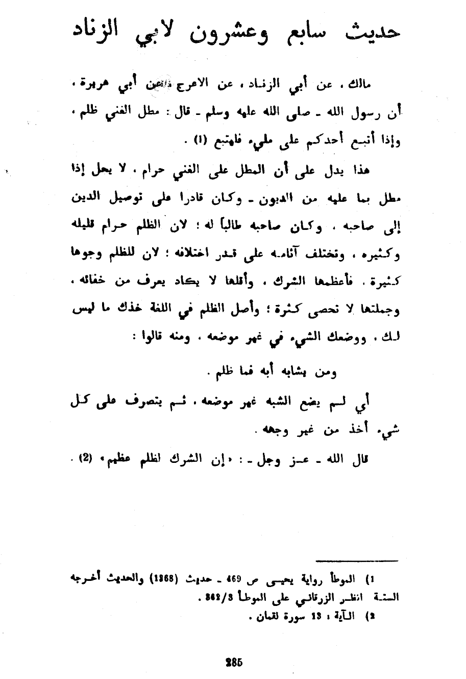 حَدِيثٌ سَابِعٌ وَعِشْرُونَ لِأَبِي الزِّنَادِ مَالِكٌ عَنْ أَبِي الزِّنَادِ عَنِ الْأَعْرَجِ عَنْ أَبِي هُرَيْرَةَ أَنَّ رَسُولَ اللَّهِ صَلَّى اللَّهُ عَلَيْهِ وسلم قَالَ مَطْلُ الْغَنِيِّ ظُلْمٌ وَإِذَا أُتْبِعَ أَحَدُكُمْ عَلَى مَلِيءٍ فَلْيَتْبَعْ هَذَا يَدُلُّ عَلَى أَنَّ المطل علىالغني حَرَامٌ لَا يَحِلُّ إِذَا مَطَلَ بِمَا عَلَيْهِ مِنَ الدُّيُونِ وَكَانَ قَادِرًا عَلَى تَوْصِيلِ الدَّيْنِ إِلَى صَاحِبِهِ وَكَانَ صَاحِبُهُ طَالِبًا لَهُ لِأَنَّ الظُّلْمَ حَرَامٌ قَلِيلُهُ وَكَثِيرُهُ وَتَخْتَلِفُ آثَامُهُ عَلَى قَدْرِ اخْتِلَافِهِ لِأَنَّ لِلظُّلْمِ وُجُوهًا كَثِيرَةً فَأَعْظَمُهَا الشِّرْكُ وَأَقَلُّهَا لَا يَكَادُ يُعْرَفُ مِنْ خَفَائِهِ وَجُمْلَتُهَا لَا تُحْصَى كَثْرَةً وَأَصْلُ الظُّلْمِ فِي اللُّغَةِ أَخْذُكَ مَا لَيْسَ لَكَ وَوَضْعُكَ الشَّيْءَ فِي غَيْرِ مَوْضِعِهِ وَمِنْهُ قَالُوا وَمَنْ يُشابِهْ أباه فَمَا ظَلَمْ أَيْ لَمْ يَضَعِ الشَّبَهَ غَيْرَ مَوْضِعِهِ ثُمَّ يَتَصَرَّفُ عَلَى كُلِّ شَيْءٍ أُخِذَ مِنْ غَيْرِ وَجْهِهِ قَالَ اللَّهُ عَزَّ وَجَلَّ إِنَّ الشِّرْكَ لَظُلْمٌ عَظِيمٌ