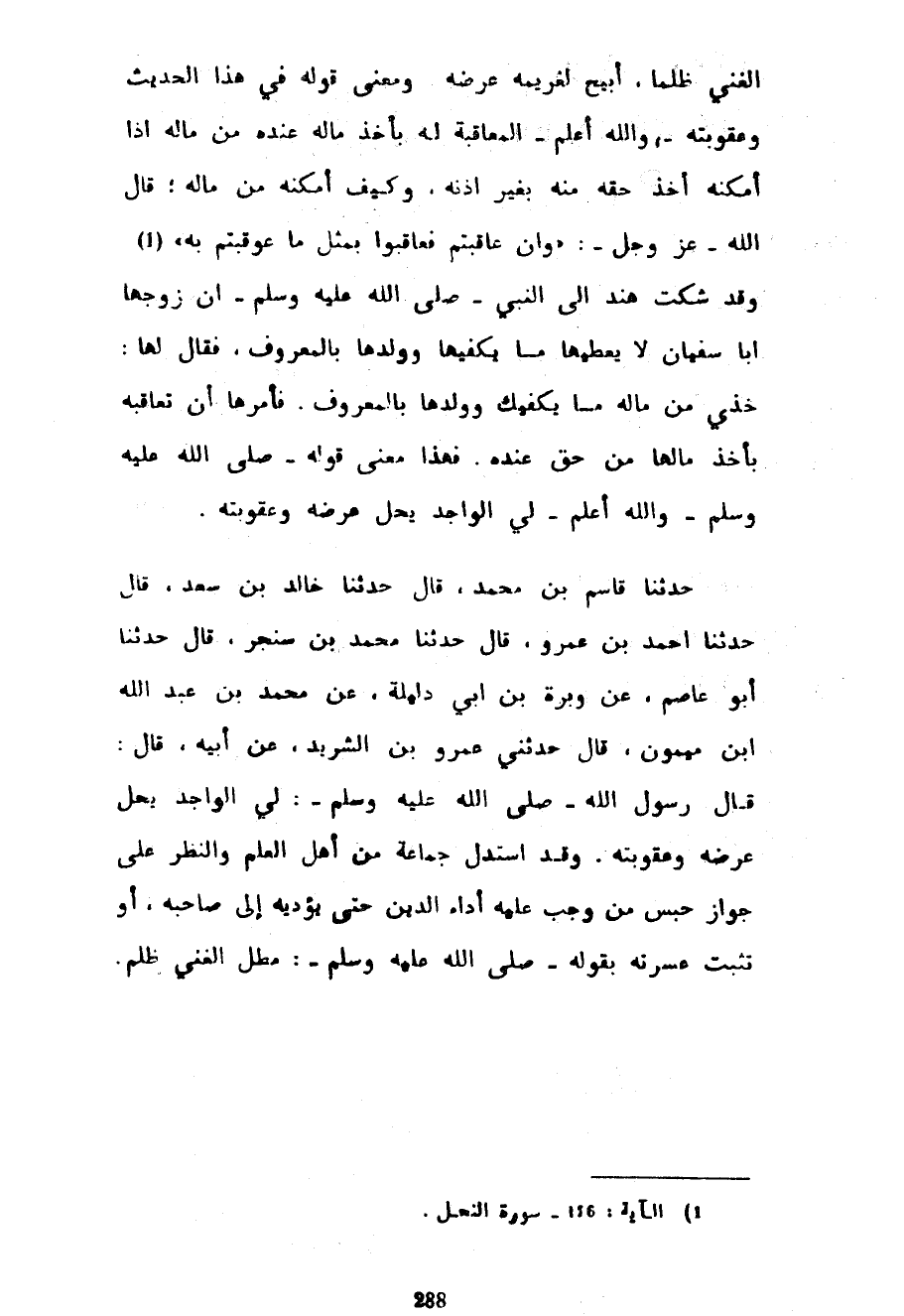 الْغَنِيِّ ظُلْمًا أُبِيحَ لِغَرِيمِهِ عِرْضُهُ وَمَعْنَى قَوْلِهِ فِي هَذَا الْحَدِيثِ وَعُقُوبَتَهُ وَاللَّهُ أَعْلَمُ الْمُعَاقَبَةُ لَهُ بِأَخْذِ مَالِهِ عِنْدَهُ مِنْ مَالِهِ إِذَا أَمْكَنَهُ أَخْذُ حَقِّهِ مِنْهُ بِغَيْرِ إِذْنِهِ وَكَيْفَ أَمْكَنَهُ مِنْ مَالِهِ قَالَ اللَّهِ عَزَّ وَجَلَّ وَإِنْ عَاقَبْتُمْ فَعَاقِبُوا بِمِثْلِ مَا عُوقِبْتُمْ بِهِ وَقَدْ شَكَتْ هِنْدٌ إِلَى النَّبِيِّ صَلَّى اللَّهُ عَلَيْهِ وَسَلَّمَ أَنَّ زَوْجَهَا أَبَا سُفْيَانَ لَا يُعْطِيهَا مَا يَكْفِيهَا وَوَلَدَهَا بِالْمَعْرُوفِ فَقَالَ لَهَا خذي من ماله ما يكفيك وولدها بِالْمَعْرُوفِ فَأَمَرَهَا أَنْ تُعَاقِبَهُ بِأَخْذِ مَالِهَا مِنْ حَقٍّ عِنْدَهُ فَهَذَا مَعْنَى قَوْلِهِ صَلَّى اللَّهُ عَلَيْهِ وَسَلَّمَ وَاللَّهُ أَعْلَمُ لَيُّ الْوَاجِدِ يُحِلُّ عِرْضَهُ وَعُقُوبَتَهُ حَدَّثَنَا قَاسِمُ بْنُ مُحَمَّدٍ قَالَ حَدَّثَنَا خَالِدُ بْنُ سَعْدٍ قَالَ حَدَّثَنَا أَحْمَدُ بْنُ عَمْرٍو قَالَ حَدَّثَنَا محمد بن سنجر قال حدثنا أبو عاصم عن وبرة بْنِ أَبِي دُلَيْلَةَ عَنْ مُحَمَّدُ بْنُ عَبْدِ اللَّهِ بْنِ مَيْمُونٍ قَالَ حَدَّثَنِي عَمْرُو بْنُ الشَّرِيدِ عَنْ أَبِيهِ قَالَ قَالَ رَسُولُ اللَّهِ صَلَّى اللَّهُ عَلَيْهِ وَسَلَّمَ لَيُّ الْوَاجِدِ يُحِلُّ عِرْضَهُ وَعُقُوبَتَهُ وَقَدِ اسْتَدَلَّ جَمَاعَةٌ مِنْ أَهْلِ الْعِلْمِ وَالنَّظَرِ عَلَى جَوَازِ حَبْسِ مَنْ وَجَبَ عَلَيْهِ أَدَاءُ الدَّيْنِ حَتَّى يُؤَدِّيَهُ إِلَى صَاحِبِهِ أَوْ تَثْبُتَ عُسْرَتُهُ بِقَوْلِهِ صَلَّى اللَّهُ عَلَيْهِ وَسَلَّمَ مَطْلُ الْغَنِيِّ ظُلْمٌ