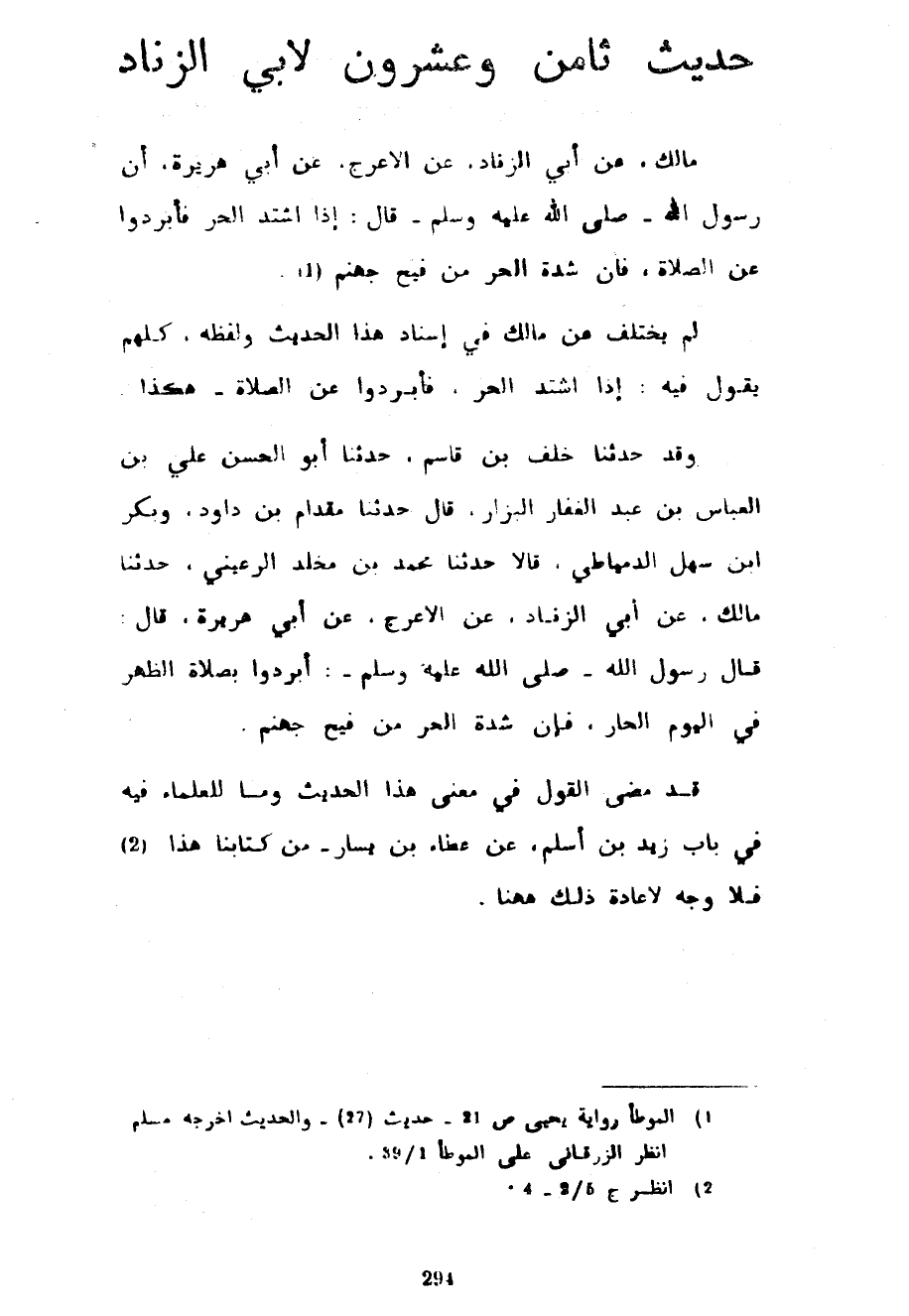 حديث ثامن وعشرن لأبي الزناد مَالِكٌ عَنْ أَبِي الزِّنَادِ عَنِ الْأَعْرَجِ عَنْ أَبِي هُرَيْرَةَ أَنَّ رَسُولَ اللَّهِ صَلَّى اللَّهُ عَلَيْهِ وَسَلَّمَ قَالَ إِذَا اشْتَدَّ الْحَرُّ فَأَبْرِدُوا عَنِ الصَّلَاةِ فَإِنَّ شِدَّةَ الْحَرِّ مِنْ فَيْحِ جَهَنَّمَ لَمْ يُخْتَلَفْ عَنْ مَالِكٍ فِي إِسْنَادِ هَذَا الْحَدِيثِ وَلَفْظُهُ كُلُّهُمْ يَقُولُ فِيهِ إِذَا اشْتَدَّ الْحَرُّ فَأَبْرِدُوا عَنِ الصَّلَاةِ هَكَذَا وَقَدْ حَدَّثَنَا خَلَفُ بْنُ قَاسِمٍ حَدَّثَنَا أَبُو الْحَسَنِ عَلِيُّ بْنُ الْعَبَّاسِ بْنِ عَبْدِ الْغَفَّارِ الْبَزَّارُ قَالَ حَدَّثَنَا مِقْدَامُ بْنُ دَاوُدَ وَبَكْرُ بْنُ سَهْلٍ الدِّمْيَاطِيُّ قَالَا حَدَّثَنَا مُحَمَّدُ بْنُ مَخْلَدٍ الرُّعَيْنِيُّ حَدَّثَنَا مَالِكٌ عَنْ أَبِي الزِّنَادِ عَنِ الْأَعْرَجِ عَنْ أَبِي هُرَيْرَةَ قَالَ قَالَ رَسُولُ اللَّهِ صَلَّى اللَّهُ عَلَيْهِ وَسَلَّمَ أبردوا بصلاة الظُّهْرَ فِي الْيَوْمِ الْحَارِّ فَإِنَّ شِدَّةَ الْحَرِّ مِنْ فَيْحِ جَهَنَّمَ قَدْ مَضَى الْقَوْلُ فِي مَعْنَى هَذَا الْحَدِيثِ وَمَا لِلْعُلَمَاءِ فِيهِ فِي بَابِ زَيْدِ بْنِ أَسْلَمَ عَنْ عَطَاءِ بْنِ يَسَارٍ مِنْ كِتَابِنَا هَذَا فَلَا وَجْهَ لِإِعَادَةِ ذَلِكَ ههنا