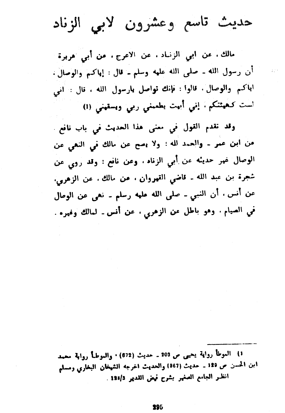 حَدِيثٌ تَاسِعٌ وَعِشْرُونَ لِأَبِي الزِّنَادِ مَالِكٌ عَنْ أَبِي الزِّنَادِ عَنِ الْأَعْرَجِ عَنْ أَبِي هُرَيْرَةَ أَنَّ رَسُولَ اللَّهِ صَلَّى اللَّهُ عَلَيْهِ وسلم قَالَ إِيَّاكُمْ وَالْوِصَالَ إِيَّاكُمْ وَالْوِصَالَ قَالُوا فَإِنَّكَ تُوَاصِلُ يَا رَسُولَ اللَّهِ قَالَ إِنِّي لَسْتُ كَهَيْئَتِكُمْ إِنِّي أَبِيتُ يُطْعِمُنِي رَبِّي وَيَسْقِينِي وَقَدْ تَقَدَّمَ الْقَوْلُ فِي مَعْنَى هَذَا الْحَدِيثِ فِي بَابِ نَافِعٍ عَنِ ابْنِ عُمَرَ وَالْحَمْدُ لِلَّهِ وَلَا يَصِحُّ عَنْ مَالِكٍ فِي النَّهْيِ عَنِ الْوِصَالِ غَيْرُ حَدِيثِهِ عَنْ أَبِي الزِّنَادِ وَعَنْ نَافِعٍ وَقَدْ رُوِيَ عَنْ شَجَرَةَ بْنِ عَبْدِ اللَّهِ قَاضِي الْقَيْرَوَانِ عَنْ مَالِكٍ عَنِ الزُّهْرِيِّ عَنْ أَنَسٍ أَنَّ النَّبِيَّ صَلَّى اللَّهُ عَلَيْهِ وَسَلَّمَ نَهَى عَنِ الْوِصَالِ فِي الصِّيَامِ وَهُوَ بَاطِلٌ عَنِ الزُّهْرِيِّ عَنْ أَنَسٍ لِمَالِكٍ وَغَيْرِهِ