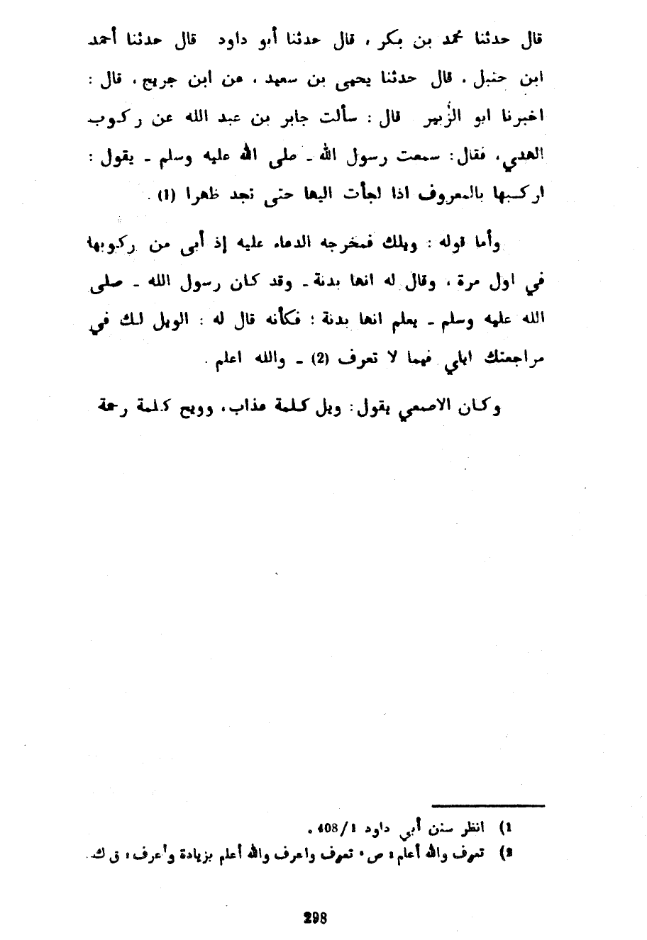قَالَ حَدَّثَنَا مُحَمَّدُ بْنُ بَكْرٍ قَالَ حَدَّثَنَا أَبُو دَاوُدَ قَالَ حَدَّثَنَا أَحْمَدُ بْنُ حَنْبَلٍ قَالَ حَدَّثَنَا يَحْيَى بْنُ سَعِيدٍ عَنِ ابْنِ جُرَيْجٍ قَالَ أَخْبَرَنَا أَبُو الزُّبَيْرِ قَالَ سَأَلْتُ جَابِرَ بْنَ عَبْدِ اللَّهِ عَنِ رُكُوبِ الْهَدْيِ فَقَالَ سَمِعْتُ رَسُولَ اللَّهِ صَلَّى اللَّهُ عَلَيْهِ وَسَلَّمَ يَقُولُ ارْكَبْهَا بِالْمَعْرُوفِ إِذَا لَجَأْتَ إِلَيْهَا حَتَّى تَجِدَ ظَهْرًا وَأَمَّا قَوْلُهُ وَيْلَكَ فَمَخْرَجُهُ الدُّعَاءُ عَلَيْهِ إِذْ أَبَى مِنْ رُكُوبِهَا فِي أَوَّلِ مَرَّةٍ وَقَالَ لَهُ إِنَّهَا بَدَنَةٌ وَقَدْ كَانَ رَسُولُ اللَّهِ صَلَّى اللَّهُ عَلَيْهِ وَسَلَّمَ يَعْلَمُ أَنَّهَا بَدَنَةٌ فَكَأَنَّهُ قَالَ لَهُ الْوَيْلُ لَكَ فِي مُرَاجَعَتِكَ إِيَّايَ فِيمَا لَا تَعْرِفُ وَاللَّهُ أَعْلَمُ وَكَانَ الْأَصْمَعِيُّ يَقُولُ وَيْلٌ كَلِمَةُ عَذَابٍ وَوَيْحٌ كَلِمَةُ رَحْمَةٍ