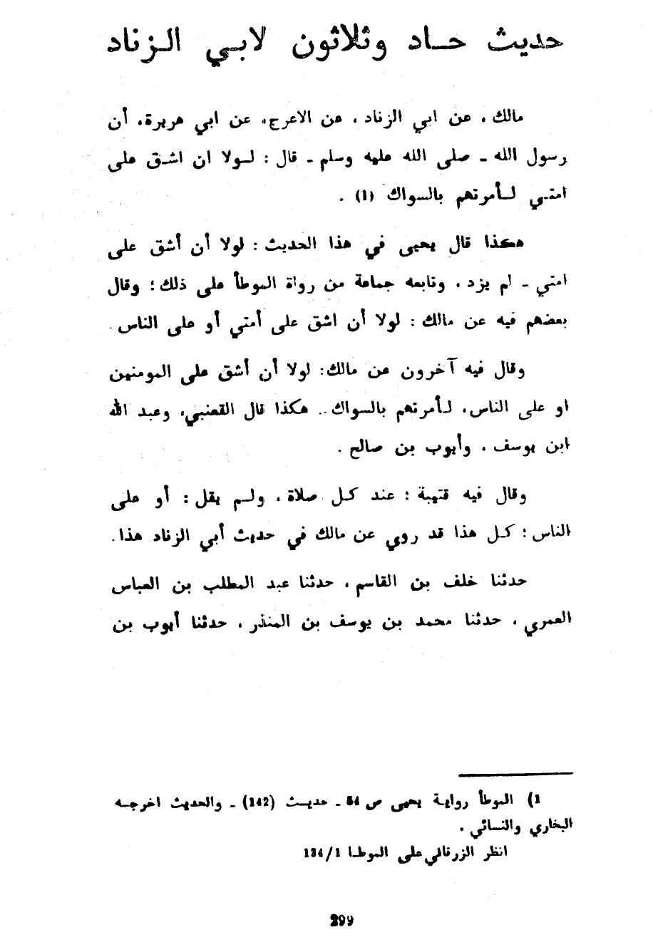 حَدِيثٌ حَادٍ وَثَلَاثُونَ لِأَبِي الزِّنَادِ مَالِكٌ عَنْ أَبِي الزِّنَادِ عَنِ الْأَعْرَجِ عَنْ أَبِي هُرَيْرَةَ أَنَّ رَسُولَ اللَّهِ صَلَّى اللَّهُ عَلَيْهِ وَسَلَّمَ قَالَ لَوْلَا أَنْ أَشُقَّ عَلَى أُمَّتِي لَأَمَرْتُهُمْ بِالسِّوَاكِ هَكَذَا قَالَ يَحْيَى فِي هَذَا الْحَدِيثِ لولا أن أشق عل أُمَّتِي لَمْ يَزِدْ وَتَابَعَهُ جَمَاعَةٌ مِنْ رُوَاةِ الْمُوَطَّأِ عَلَى ذَلِكَ وَقَالَ بَعْضُهُمْ فِيهِ عَنْ مَالِكٍ لَوْلَا أَنْ أَشُقَّ عَلَى أُمَّتِي أَوْ عَلَى النَّاسِ وَقَالَ فِيهِ آخَرُونَ عَنْ مَالِكٍ لَوْلَا أَنْ أَشُقَّ عَلَى الْمُؤْمِنِينَ أَوْ عَلَى النَّاسِ لَأَمَرْتُهُمْ بِالسِّوَاكِ هَكَذَا قَالَ الْقَعْنَبِيُّ وَعَبْدُ اللَّهِ بْنُ يُوسُفَ وَأَيُّوبُ بْنُ صَالِحٍ وَقَالَ فِيهِ قُتَيْبَةُ عِنْدَ كُلِّ صَلَاةٍ وَلَمْ يَقُلْ أَوْ عَلَى النَّاسِ كُلُّ هَذَا قَدْ رُوِيَ عَنْ مَالِكٍ فِي حَدِيثِ أَبِي الزِّنَادِ هَذَا حَدَّثَنَا خَلَفُ بْنُ الْقَاسِمِ حَدَّثَنَا عَبْدُ الْمُطَّلِبِ بْنُ الْعَبَّاسِ الْعُمَرِيُّ حَدَّثَنَا مُحَمَّدُ بْنُ يُوسُفَ بْنِ الْمُنْذِرِ حَدَّثَنَا أَيُّوبُ بْنُ