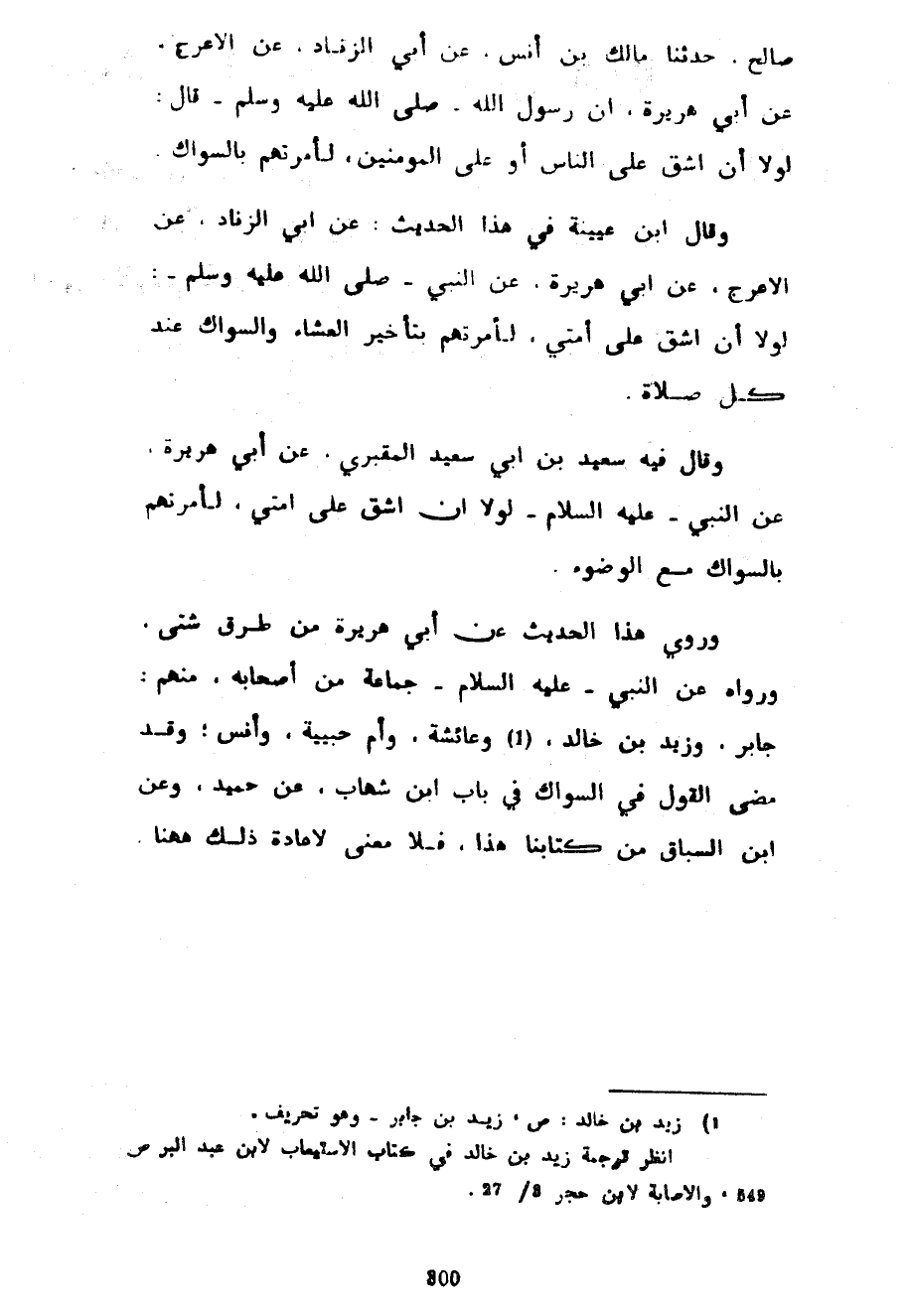 صَالِحٍ حَدَّثَنَا مَالِكُ بْنُ أَنَسٍ عَنْ أَبِي الزِّنَادِ عَنِ الْأَعْرَجِ عَنْ أَبِي هُرَيْرَةَ أَنَّ رَسُولَ اللَّهِ صَلَّى اللَّهُ عَلَيْهِ وسلم قال لَوْلَا أَنْ أَشُقَّ عَلَى النَّاسِ أَوْ عَلَى الْمُؤْمِنِينَ لَأَمَرْتُهُمْ بِالسِّوَاكِ وَقَالَ ابْنُ عُيَيْنَةَ فِي هَذَا الْحَدِيثِ عَنْ أَبِي الزِّنَادِ عَنِ الْأَعْرَجِ عَنْ أَبِي هُرَيْرَةَ عَنِ النَّبِيِّ صَلَّى اللَّهُ عَلَيْهِ وَسَلَّمَ لَوْلَا أَنْ أَشُقَّ عَلَى أُمَّتِي لَأَمَرْتُهُمْ بِتَأْخِيرِ الْعِشَاءِ وَالسِّوَاكِ عِنْدَ كُلِّ صَلَاةٍ وَقَالَ فِيهِ سَعِيدِ بْنِ أَبِي سَعِيدٍ الْمَقْبُرِيِّ عَنْ أَبِي هُرَيْرَةَ عَنِ النَّبِيِّ عَلَيْهِ السَّلَامُ لولا أن أشق عل أُمَّتِي لَأَمَرْتُهُمْ بِالسِّوَاكِ مَعَ الْوُضُوءِ وَرُوِيَ هَذَا الْحَدِيثُ عَنْ أَبِي هُرَيْرَةَ مِنْ طُرُقٍ شَتَّى وَرَوَاهُ عَنِ النَّبِيِّ عَلَيْهِ السَّلَامُ جَمَاعَةٌ مِنْ أَصْحَابِهِ مِنْهُمْ جَابِرٌ وَزَيْدُ بْنُ خَالِدٍ وَعَائِشَةُ وَأُمُّ حَبِيبَةَ وَأَنَسٌ وَقَدْ مَضَى الْقَوْلُ فِي السِّوَاكِ فِي بَابِ ابْنِ شِهَابٍ عَنْ حُمَيْدٍ وَعَنِ ابْنِ السَّبَّاقِ مِنْ كِتَابِنَا هَذَا فَلَا مَعْنَى لِإِعَادَةِ ذَلِكَ ههنا