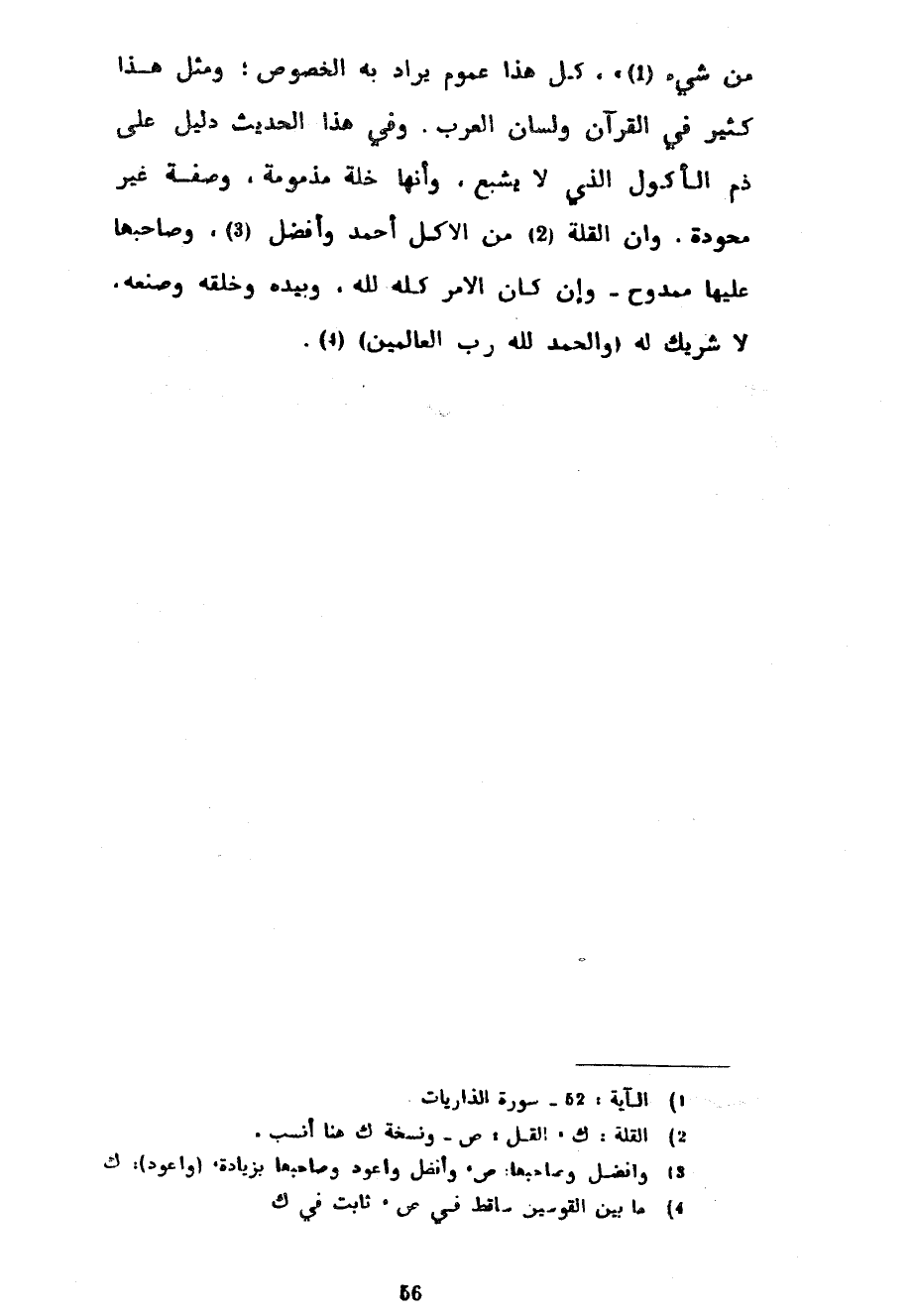 مِنْ شَيْءٍ كُلُّ هَذَا عُمُومٌ يُرَادُ بِهِ الْخُصُوصُ وَمِثْلُ هَذَا كَثِيرٌ فِي الْقُرْآنِ وَلِسَانِ الْعَرَبِ وَفِي هَذَا الْحَدِيثِ دَلِيلٌ عَلَى ذَمِّ الْأَكُولِ الَّذِي لَا يَشْبَعُ وَأَنَّهَا خَلَّةٌ مَذْمُومَةٌ وَصِفَةٌ غَيْرُ مَحْمُودَةٍ وَأَنَّ الْقِلَّةَ مِنَ الْأَكْلِ أَحْمَدُ وَأَفْضَلُ وَصَاحِبُهَا عَلَيْهَا مَمْدُوحٌ وَإِنْ كَانَ الْأَمْرُ كُلُّهُ لِلَّهِ وَبِيَدِهِ وَخَلْقِهِ وَصُنْعِهِ لَا شَرِيكَ لَهُ (وَالْحَمْدُ لِلَّهِ رَبِّ الْعَالَمِينَ)