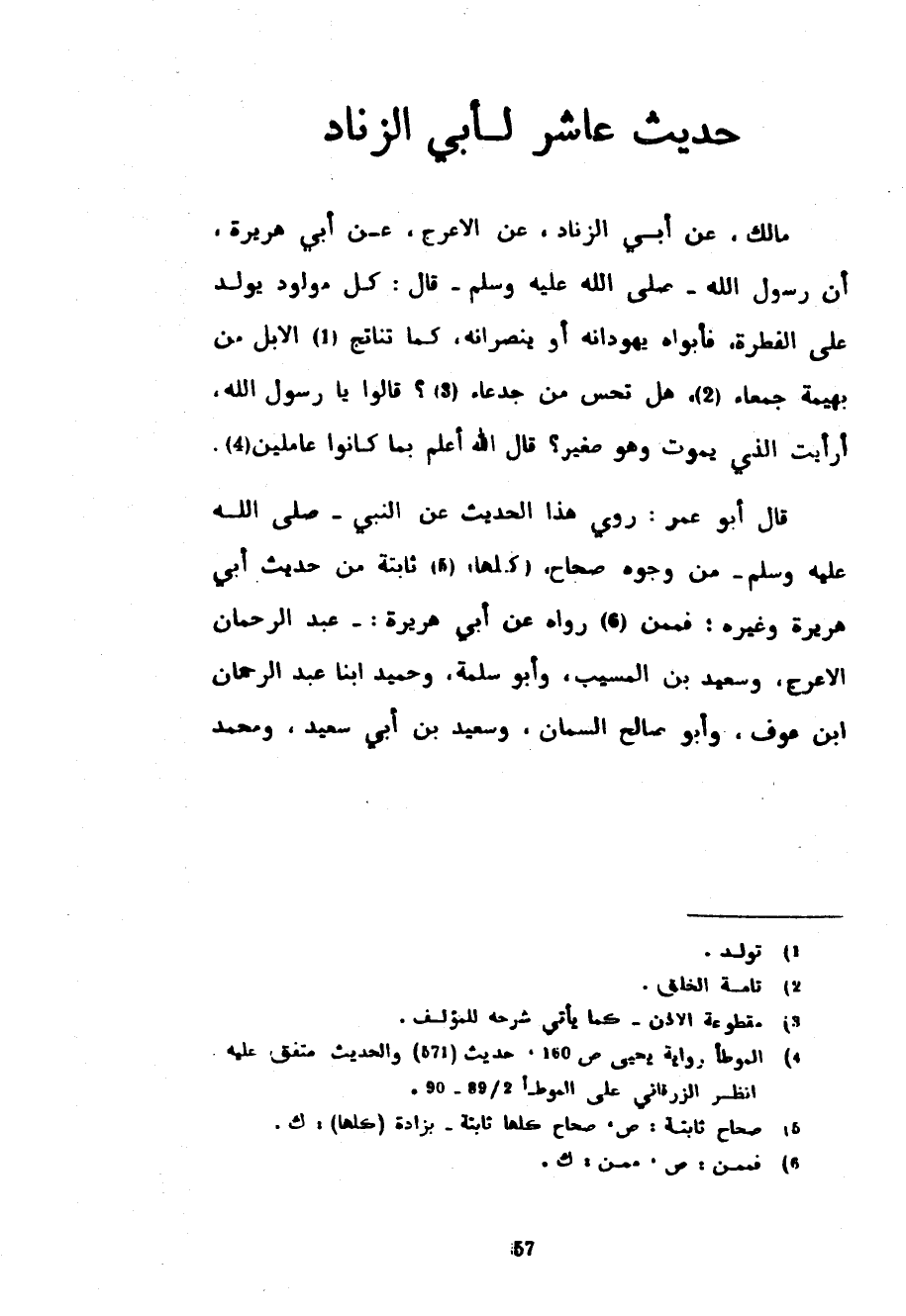 حَدِيثٌ عَاشِرٌ لِأَبِي الزِّنَادِ مَالِكٌ عَنْ أَبِي الزِّنَادِ عَنِ الْأَعْرَجِ عَنْ أَبِي هُرَيْرَةَ أَنَّ رَسُولَ اللَّهِ صَلَّى اللَّهُ عَلَيْهِ وسلم قال كل مولود يولد على الفطرة فأبواه يهودانه أَوْ يُنَصِّرَانِهِ كَمَا تَنَاتَجُ الْإِبِلُ مِنْ بَهِيمَةٍ جَمْعَاءَ هَلْ تُحِسُّ مِنْ جَدْعَاءَ قَالُوا يَا رَسُولَ اللَّهِ أَرَأَيْتَ الَّذِي يَمُوتُ وَهُوَ صَغِيرٌ قَالَ اللَّهُ أَعْلَمُ بِمَا كَانُوا عَامِلِينَ قَالَ أبوعمر رُوِيَ هَذَا الْحَدِيثُ عَنِ النَّبِيِّ صَلَّى اللَّهُ عَلَيْهِ وَسَلَّمَ مِنْ وُجُوهٍ صِحَاحٍ (كُلُّهَا) ثَابِتَةٌ مِنْ حَدِيثِ أَبِي هُرَيْرَةَ وَغَيْرِهِ فَمِمَّنْ رَوَاهُ عن أبي هريرة عبد الرحمان الْأَعْرَجُ وَسَعِيدُ بْنُ الْمُسَيَّبِ وَأَبُو سَلَمَةَ وَحُمَيْدٌ ابنا عبد الرحمان بْنِ عَوْفٍ وَأَبُو صَالِحٍ السَّمَّانُ وَسَعِيدُ بْنُ أبي سعيد ومحمد