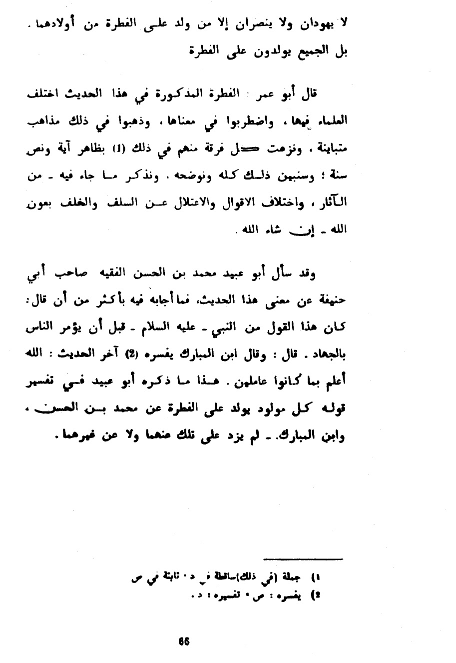 لَا يُهَوِّدَانِ وَلَا يُنَصِّرَانِ إِلَّا مَنْ وُلِدَ عَلَى الْفِطْرَةِ مِنْ أَوْلَادِهِمَا بَلِ الْجَمِيعُ يُولَدُونَ عَلَى الْفِطْرَةِ قَالَ أَبُو عُمَرَ الْفِطْرَةُ الْمَذْكُورَةُ فِي هَذَا الْحَدِيثِ اخْتَلَفَ الْعُلَمَاءُ فِيهَا وَاضْطَرَبُوا فِي مَعْنَاهَا وَذَهَبُوا فِي ذَلِكَ مَذَاهِبَ مُتَبَايِنَةً وَنَزَعَتْ كُلُّ فِرْقَةٍ مِنْهُمْ فِي ذَلِكَ بِظَاهِرِ آيَةٍ وَنَصِّ سُنَّةٍ وَسَنُبَيِّنُ ذَلِكَ كُلَّهُ وَنُوَضِّحُهُ وَنَذْكُرُ مَا جَاءَ فِيهِ مِنَ الْآثَارِ وَاخْتِلَافِ الْأَقْوَالِ وَالِاعْتِلَالِ عَنِ السَّلَفِ وَالْخَلَفِ بِعَوْنِ اللَّهِ إِنْ شَاءَ اللَّهُ وَقَدْ سَأَلَ أَبُو عُبَيْدٍ مُحَمَّدُ بْنُ الْحَسَنِ الْفَقِيهُ صَاحِبُ أَبِي حَنِيفَةَ عَنْ مَعْنَى هَذَا الْحَدِيثِ فَمَا أَجَابَهُ فِيهِ بأكثر ن أَنْ قَالَ كَانَ هَذَا الْقَوْلُ مِنَ النَّبِيِّ عَلَيْهِ السَّلَامُ قَبْلَ أَنْ يُؤْمَرَ النَّاسُ بِالْجِهَادِ قَالَ وَقَالَ ابْنُ الْمُبَارَكِ يُفَسِّرُهُ آخِرُ الْحَدِيثِ اللَّهُ أَعْلَمُ بِمَا كَانُوا عَامِلِينَ هَذَا مَا ذَكَرَهُ أَبُو عُبَيْدٍ فِي تَفْسِيرِ قَوْلِهِ كُلُّ مَوْلُودٍ يُولَدُ عَلَى الْفِطْرَةِ عَنْ مُحَمَّدِ بْنِ الْحَسَنِ وَابْنُ الْمُبَارَكِ لَمْ يَزِدْ عَلَى تِلْكَ عَنْهُمَا وَلَا عَنْ غَيْرِهِمَا