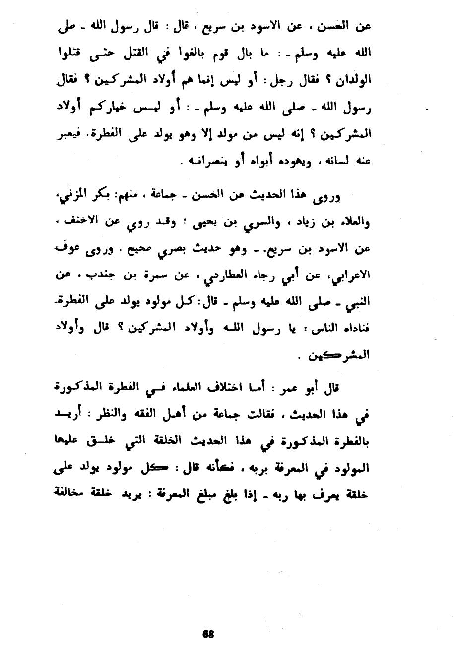 عَنِ الْحَسَنِ عَنِ الْأَسْوَدِ بْنِ سَرِيعٍ قَالَ قَالَ رَسُولُ اللَّهِ صَلَّى اللَّهُ عَلَيْهِ وَسَلَّمَ مَا بَالُ قَوْمٍ بَالَغُوا فِي الْقَتْلِ حَتَّى قتلوا الولدان فقال رجل أو ليس إِنَّمَا هُمْ أَوْلَادُ الْمُشْرِكِينَ فَقَالَ رَسُولُ اللَّهِ صَلَّى اللَّهُ عَلَيْهِ وَسَلَّمَ أو ليس خِيَارُكُمْ أَوْلَادَ الْمُشْرِكِينَ إِنَّهُ لَيْسَ مِنْ مَوْلُودٍ إِلَّا وَهُوَ يُولَدُ عَلَى الْفِطْرَةِ فَيُعَبِّرُ عَنْهُ لِسَانُهُ وَيُهَوِّدُهُ أَبَوَاهُ أَوْ يُنَصِّرَانِهِ وَرَوَى هَذَا الْحَدِيثَ عَنِ الْحَسَنِ جَمَاعَةٌ مِنْهُمْ بَكْرٌ الْمُزَنِيُّ وَالْعَلَاءُ بْنُ زِيَادٍ وَالسَّرِيُّ بْنُ يَحْيَى وَقَدْ رُوِيَ عَنِ الْأَحْنَفِ عَنِ الْأَسْوَدِ بْنِ سَرِيعٍ وَهُوَ حَدِيثٌ بَصْرِيٌّ صَحِيحٌ وَرَوَى عَوْفٌ الْأَعْرَابِيُّ عَنْ أَبِي رَجَاءٍ الْعُطَارِدِيِّ عَنْ سَمُرَةُ بْنُ جُنْدُبٍ عَنِ النَّبِيِّ صَلَّى اللَّهُ عَلَيْهِ وَسَلَّمَ قَالَ كُلُّ مَوْلُودٍ يُولَدُ عَلَى الْفِطْرَةِ فَنَادَاهُ النَّاسُ يَا رَسُولَ اللَّهِ وَأَوْلَادُ الْمُشْرِكِينَ قَالَ وَأَوْلَادُ الْمُشْرِكِينَ قَالَ أَبُو عُمَرَ أَمَّا اخْتِلَافُ الْعُلَمَاءِ فِي الْفِطْرَةِ الْمَذْكُورَةِ فِي هَذَا الْحَدِيثِ فَقَالَتْ جَمَاعَةٌ مِنْ أَهْلِ الْفِقْهِ وَالنَّظَرِ أُرِيدَ بِالْفِطْرَةِ الْمَذْكُورَةِ فِي هَذَا الْحَدِيثِ الْخِلْقَةُ الَّتِي خلق عليها المولد فِي الْمَعْرِفَةِ بِرَبِّهِ فَكَأَنَّهُ قَالَ كُلُّ مَوْلُودٍ يُولَدُ عَلَى خِلْقَةٍ يَعْرِفُ بِهَا رَبَّهُ إِذَا بَلَغَ مَبْلَغَ الْمَعْرِفَةِ يُرِيدُ خِلْقَةً مُخَالِفَةً