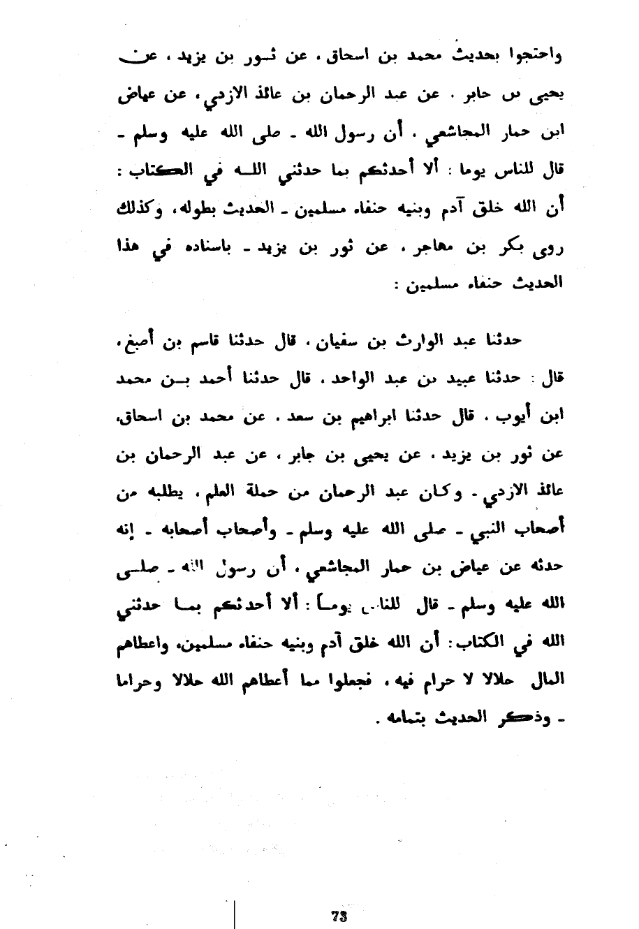 وَاحْتَجُّوا بِحَدِيثِ مُحَمَّدِ بْنِ إِسْحَاقَ عَنْ ثَوْرِ بْنِ يَزِيدَ عَنْ يَحْيَى بْنِ جَابِرٍ عن عبد الرحمان بْنِ عَائِذٍ الْأَزْدِيِّ عَنْ عِيَاضِ بْنِ حِمَارٍ الْمُجَاشِعِيِّ أَنَّ رَسُولَ اللَّهِ صَلَّى اللَّهُ عَلَيْهِ وَسَلَّمَ قَالَ لِلنَّاسِ يَوْمًا أَلَا أُحَدِّثُكُمْ بِمَا حَدَّثَنِي اللَّهُ فِي الْكِتَابِ أَنَّ اللَّهَ خَلَقَ آدَمَ وَبَنِيهِ حُنَفَاءَ مُسْلِمِينَ الْحَدِيثَ بِطُولِهِ وَكَذَلِكَ رَوَى بَكْرُ بْنُ مُهَاجِرٍ عَنْ ثَوْرِ بْنِ يَزِيدَ بِإِسْنَادِهِ فِي هَذَا الْحَدِيثِ حُنَفَاءَ مُسْلِمِينَ حَدَّثَنَا عَبْدُ الْوَارِثِ بْنُ سُفْيَانَ قَالَ حَدَّثَنَا قَاسِمُ بْنُ أَصْبَغَ قَالَ حَدَّثَنَا عُبَيْدُ بْنُ عَبْدِ الْوَاحِدِ قَالَ حَدَّثَنَا أَحْمَدُ بْنُ مُحَمَّدِ بْنِ أَيُّوبَ قَالَ حَدَّثَنَا إِبْرَاهِيمُ بْنُ سَعْدٍ عَنْ مُحَمَّدِ بْنِ إِسْحَاقَ عَنْ ثَوْرِ بْنِ يَزِيدَ عَنْ يَحْيَى بْنِ جَابِرٍ عَنْ عَبْدِ الرحمان بن عائذ الأزدي وكان عبد الرحمان مِنْ حَمَلَةِ الْعِلْمِ يَطْلُبُهُ مِنْ أَصْحَابِ النَّبِيِّ صَلَّى اللَّهُ عَلَيْهِ وَسَلَّمَ وَأَصْحَابِ أَصْحَابِهِ أَنَّهُ حَدَّثَهُ عَنْ عِيَاضِ بْنِ حِمَارٍ الْمُجَاشِعِيِّ أَنَّ رسول الله صلى الله عليه وسلم قال لِلنَّاسِ يَوْمًا أَلَا أُحَدِّثُكُمْ بِمَا حَدَّثَنِي اللَّهُ فِي الْكِتَابِ أَنَّ اللَّهَ خَلَقَ آدَمَ وَبَنِيهِ حُنَفَاءَ مُسْلِمِينَ وَأَعْطَاهُمُ الْمَالَ حَلَالًا لَا حَرَامَ فِيهِ فَجَعَلُوا مِمَّا أَعْطَاهُمُ اللَّهُ حَلَالًا وَحَرَامًا وذكر الحديث بتمامه