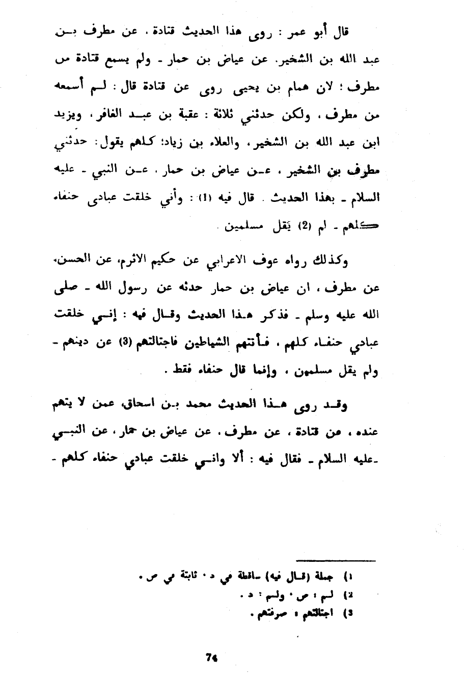 ! وَلَمْ يَسْمَعْ قَتَادَةُ مِنْ مُطَرِّفٍ لِأَنَّ هَمَّامَ بْنَ يَحْيَى رَوَى عَنْ قَتَادَةَ قَالَ لَمْ أَسْمَعْهُ مِنْ مُطَرِّفٍ وَلَكِنْ حَدَّثَنِي ثَلَاثَةٌ عُقْبَةُ بْنُ عَبْدِ الْغَافِرِ وَيَزِيدُ بْنُ عَبْدِ اللَّهِ بْنِ الشِّخِّيرِ وَالْعَلَاءُ بْنُ زِيَادٍ كُلُّهُمْ يَقُولُ حَدَّثَنِي مُطَرِّفُ بْنُ الشِّخِّيرِ عَنْ عِيَاضِ بْنِ حِمَارٍ عَنِ النَّبِيِّ عَلَيْهِ السَّلَامُ بِهَذَا الْحَدِيثِ قَالَ فِيهِ وَإِنِّي خَلَقْتُ عِبَادِي حُنَفَاءَ كُلَّهُمْ لَمْ يَقُلْ مُسْلِمِينَ وَكَذَلِكَ رَوَاهُ عَوْفٌ الْأَعْرَابِيُّ عَنْ حَكِيمٍ الْأَثْرَمِ عَنِ الْحَسَنِ عَنْ مُطَرِّفٍ أَنَّ عِيَاضَ بْنَ حِمَارٍ حَدَّثَهُ عَنْ رَسُولِ اللَّهِ صَلَّى اللَّهُ عَلَيْهِ وَسَلَّمَ فَذَكَرَ هَذَا الْحَدِيثَ وَقَالَ فِيهِ إِنِّي خَلَقْتُ عِبَادِي حُنَفَاءَ كُلَّهُمْ فَأَتَتْهُمُ الشَّيَاطِينُ فَاجْتَالَتْهُمْ عَنْ دِينِهِمْ وَلَمْ يَقُلْ مُسْلِمِينَ وَإِنَّمَا قَالَ حُنَفَاءَ فَقَطْ وَقَدْ رَوَى هَذَا الْحَدِيثَ مُحَمَّدُ بْنُ إِسْحَاقَ عَمَّنْ لَا يُتَّهَمُ عِنْدَهُ عَنْ قَتَادَةَ عَنْ مُطَرِّفٍ عَنْ عِيَاضِ بْنِ حِمَارٍ عَنِ النَّبِيِّ عَلَيْهِ السَّلَامُ فَقَالَ فِيهِ أَلَا وَإِنِّي خَلَقْتُ عِبَادِي حنفاء كلهم