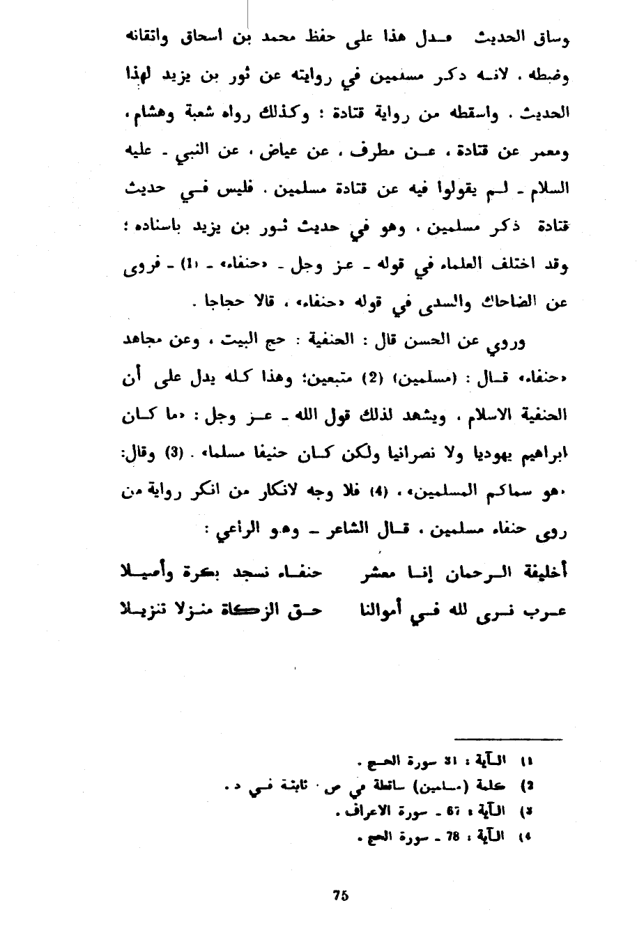 وَسَاقَ الْحَدِيثَ فَدَلَّ هَذَا عَلَى حِفْظِ مُحَمَّدِ بْنِ إِسْحَاقَ وَإِتْقَانِهِ وَضَبْطِهِ لِأَنَّهُ ذَكَرَ مُسْلِمِينَ فِي رِوَايَتِهِ عَنْ ثَوْرِ بْنِ يَزِيدَ لِهَذَا الْحَدِيثِ وَأَسْقَطَهُ مِنْ رِوَايَةِ قَتَادَةَ وَكَذَلِكَ رَوَاهُ شُعْبَةُ وَهِشَامٌ وَمَعْمَرٌ عَنْ قَتَادَةَ عَنْ مُطَرِّفٍ عَنْ عِيَاضٍ عَنِ النَّبِيِّ عَلَيْهِ السَّلَامُ لَمْ يَقُولُوا فِيهِ عَنْ قَتَادَةَ مُسْلِمِينَ فَلَيْسَ فِي حَدِيثِ قَتَادَةَ ذِكْرُ مُسْلِمِينَ وَهُوَ فِي حَدِيثِ ثَوْرِ بْنِ يَزِيدَ بِإِسْنَادِهِ وَقَدِ اخْتَلَفَ الْعُلَمَاءُ فِي قَوْلِهِ عَزَّ وَجَلَّ حُنَفَاءَ فَرُوِيَ عَنِ الضَّحَّاكِ وَالسُّدِّيِّ فِي قَوْلِهِ حُنَفَاءَ قَالَا حُجَّاجًا وَرُوِيَ عَنِ الْحَسَنِ قَالَ الْحَنَفِيَّةُ حَجُّ الْبَيْتِ وعن مجاهد حنفاء قال (مسلمين) متبيعن وَهَذَا كُلُّهُ يَدُلُّ عَلَى أَنَّ الْحَنَفِيَّةَ الْإِسْلَامُ وَيَشْهَدُ لِذَلِكَ قَوْلُ اللَّهِ عَزَّ وَجَلَّ مَا كَانَ إِبْرَاهِيمُ يَهُودِيًّا وَلَا نَصْرَانِيًّا وَلَكِنْ كَانَ حَنِيفًا مُسْلِمًا وَقَالَ هُوَ سَمَّاكُمُ الْمُسْلِمِينَ فَلَا وَجْهَ لِإِنْكَارِ مَنْ أَنْكَرَ رِوَايَةَ مَنْ رَوَى حُنَفَاءَ مُسْلِمِينَ قَالَ الشَّاعِرُ وَهُوَ الرَّاعِي ... أَخَلِيفَةَ الرحمان إِنَّا مَعْشَرٌ ... حُنَفَاءُ نَسْجُدُ بُكْرَةً وَأَصِيلَا ... ... عَرَبٌ نَرَى لِلَّهِ فِي أَمْوَالِنَا ... حَقَّ الزَّكَاةِ مُنَزَّلًا تنزيلا