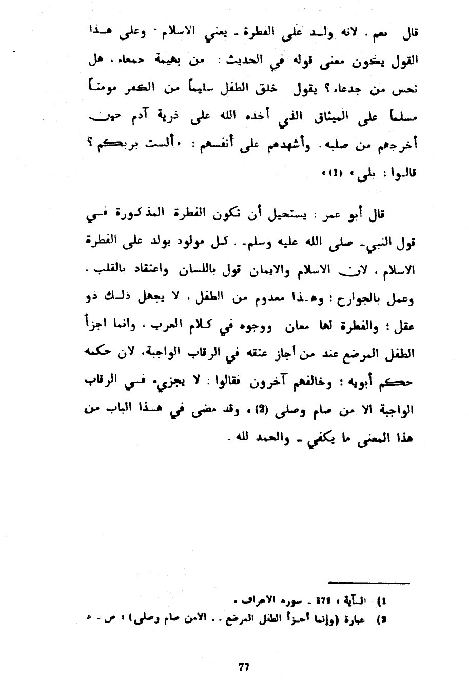 قَالَ نَعَمْ لِأَنَّهُ وُلِدَ عَلَى الْفِطْرَةِ يَعْنِي الْإِسْلَامَ وَعَلَى هَذَا الْقَوْلِ يَكُونُ مَعْنَى قَوْلِهِ فِي الْحَدِيثِ مِنْ بَهِيمَةٍ جَمْعَاءَ هَلْ تُحِسُّ مِنْ جَدْعَاءَ يَقُولُ خُلِقَ الطِّفْلُ سَلِيمًا مِنَ الْكُفْرِ مُؤْمِنًا مُسْلِمًا عَلَى الْمِيثَاقِ الَّذِي أَخَذَهُ اللَّهُ عَلَى ذُرِّيَّةِ آدَمَ حِينَ أَخْرَجَهُمْ مَنْ صُلْبِهِ وَأَشْهَدَهُمْ عَلَى أَنْفُسِهِمْ أَلَسْتُ بِرَبِّكُمْ قَالُوا بَلَى قَالَ أَبُو عُمَرَ يَسْتَحِيلُ أَنْ تَكُونَ الْفِطْرَةُ الْمَذْكُورَةُ فِي قَوْلِ النَّبِيِّ صَلَّى اللَّهُ عَلَيْهِ وَسَلَّمَ كُلُّ مَوْلُودٍ يُولَدُ عَلَى الْفِطْرَةِ الْإِسْلَامُ لِأَنَّ الْإِسْلَامَ وَالْإِيمَانَ قَوْلٌ بِاللِّسَانِ وَاعْتِقَادٌ بِالْقَلْبِ وَعَمَلٌ بِالْجَوَارِحِ وَهَذَا مَعْدُومٌ مِنَ الطِّفْلِ لَا يَجْهَلُ بِذَلِكَ ذُو عَقْلٍ وَالْفِطْرَةُ لَهَا مَعَانٍ وَوُجُوهٌ فِي كَلَامِ الْعَرَبِ وَإِنَّمَا أَجْزَأَ الطِّفْلُ الْمُرْضِعُ عِنْدَ مَنْ أَجَازَ عِتْقَهُ فِي الرِّقَابِ الْوَاجِبَةِ لِأَنَّ حُكْمَهُ حُكْمُ أَبَوَيْهِ وَخَالَفَهُمْ آخَرُونَ فَقَالُوا لَا يُجْزِئُ فِي الرِّقَابِ الْوَاجِبَةِ إِلَّا مَنْ صَامَ وَصَلَّى وَقَدْ مَضَى فِي هَذَا الْبَابِ مِنْ هَذَا الْمَعْنَى مَا يَكْفِي والحمد لله
