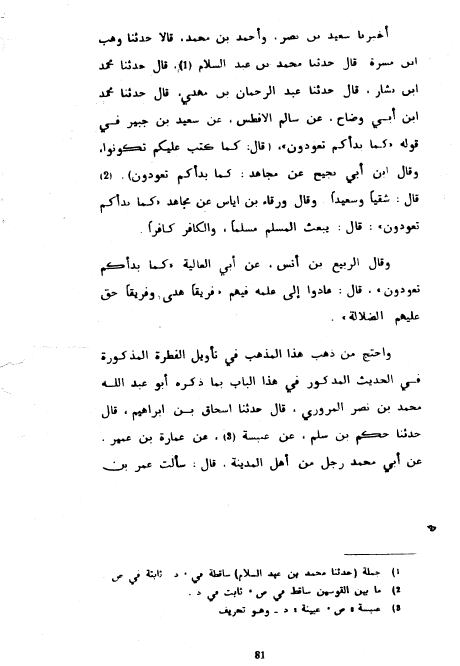 أَخْبَرَنَا سَعِيدُ بْنُ نَصْرٍ وَأَحْمَدُ بْنُ مُحَمَّدٍ قَالَا حَدَّثَنَا وَهْبُ بْنُ مَسَرَّةَ قَالَ حَدَّثَنَا مُحَمَّدُ بْنُ عَبْدِ السَّلَامِ قَالَ حَدَّثَنَا مُحَمَّدُ بْنُ بَشَّارٍ قَالَ حَدَّثَنَا عَبْدُ الرحمان بْنُ مَهْدِيٍّ قَالَ حَدَّثَنَا مُحَمَّدُ بْنُ أَبِي وَضَّاحٍ عَنْ سَالِمٍ الْأَفْطَسِ عَنْ سَعِيدِ بْنِ جُبَيْرِ فِي قَوْلِهِ كَمَا بَدَأَكُمْ تَعُودُونَ (قَالَ كَمَا كَتَبَ عَلَيْكُمْ تَكُونُوا وَقَالَ ابْنُ أَبِي نَجِيحٍ عَنْ مُجَاهِدٍ كَمَا بَدَأَكُمْ تَعُودُونَ (2) قَالَ شَقِيًّا وَسَعِيدًا وَقَالَ وَرْقَاءُ بْنُ إِيَاسٍ عَنْ مُجَاهِدٍ كَمَا بَدَأَكُمْ تَعُودُونَ قَالَ يُبْعَثُ الْمُسْلِمُ مُسْلِمًا وَالْكَافِرُ كَافِرًا وَقَالَ الرَّبِيعُ بْنُ أَنَسٍ عَنْ أَبِي الْعَالِيَةَ كَمَا بَدَأَكُمْ تَعُودُونَ قَالَ عَادُوا إِلَى عِلْمِهِ فِيهِمْ فَرِيقًا هَدَى وَفَرِيقًا حَقَّ عَلَيْهِمُ الضَّلَالَةُ وَاحْتَجَّ مَنْ ذَهَبَ هَذَا الْمَذْهَبَ فِي تَأْوِيلِ الْفِطْرَةِ الْمَذْكُورَةِ فِي الْحَدِيثِ الْمَذْكُورِ فِي هَذَا الْبَابِ بِمَا ذَكَرَهُ أَبُو عَبْدِ اللَّهِ مُحَمَّدُ بْنُ نَصْرٍ الْمَرْوَزِيُّ قَالَ حَدَّثَنَا إِسْحَاقُ بْنُ إِبْرَاهِيمَ قَالَ حَدَّثَنَا حَكَمُ بْنُ سَلْمٍ عَنْ عَنْبَسَةَ عَنْ عُمَارَةَ بْنِ عُمَيْرٍ عَنْ أَبِي مُحَمَّدٍ رَجُلٌ مِنْ أَهْلِ الْمَدِينَةِ قَالَ سَأَلْتُ عُمَرَ بْنَ