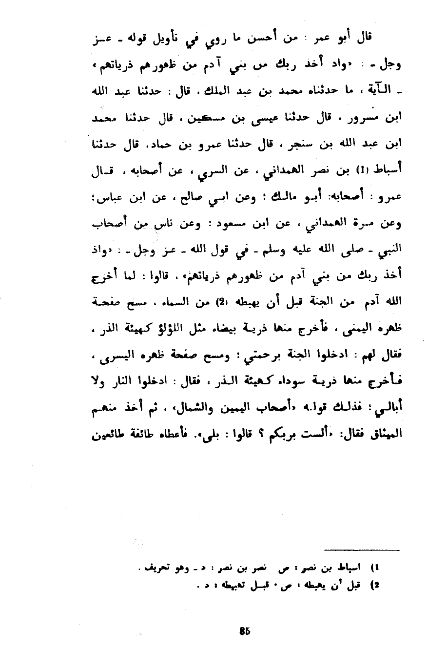 قال أبوعمر مِنْ أَحْسَنِ مَا رُوِيَ فِي تَأْوِيلِ قَوْلِهِ عز وجل وَإِذْ أَخَذَ رَبُّكَ مِنْ بَنِي آدَمَ مِنْ ظُهُورِهِمْ ذُرِّيَّاتِهِمْ الْآيَةَ مَا حَدَّثَنَاهُ مُحَمَّدُ بْنُ عَبْدِ الْمَلِكِ قَالَ حَدَّثَنَا عَبْدُ اللَّهِ بْنُ مَسْرُورٍ قَالَ حَدَّثَنَا عِيسَى بْنُ مِسْكِينٍ قَالَ حَدَّثَنَا مُحَمَّدُ بْنُ عَبْدِ اللَّهِ بْنِ سِنْجَرٍ قَالَ حَدَّثَنَا عَمْرُو بْنُ حَمَّادٍ قَالَ حَدَّثَنَا أَسْبَاطُ بْنُ نَصْرٍ الْهَمْدَانِيُّ عَنِ السَّرِيِّ عَنْ أَصْحَابِهِ قَالَ عَمْرٌو أَصْحَابُهُ أَبُو مَالِكٍ وَعَنْ أَبِي صَالِحٍ عَنِ ابْنِ عَبَّاسٍ وَعَنْ مُرَّةَ الْهَمْدَانِيِّ عَنِ ابْنِ مَسْعُودٍ وَعَنْ نَاسٍ مِنْ أَصْحَابِ النَّبِيِّ صَلَّى اللَّهُ عَلَيْهِ وَسَلَّمَ فِي قَوْلِ اللَّهِ عَزَّ وَجَلَّ وَإِذْ أَخَذَ رَبُّكَ مِنْ بَنِي آدَمَ مِنْ ظهورهم ذُرِّيَّاتِهِمْ قَالُوا لَمَّا أَخْرَجَ اللَّهُ آدَمَ مِنَ الْجَنَّةِ قَبْلَ أَنْ يُهْبِطَهُ مِنَ السَّمَاءِ مَسَحَ صَفْحَةَ ظَهْرِهِ الْيُمْنَى فَأَخْرَجَ مِنْهَا ذَرِّيَّةً بَيْضَاءَ مِثْلَ اللُّؤْلُؤِ كَهَيْئَةِ الذَّرِّ فَقَالَ لَهُمُ ادْخُلُوا الْجَنَّةَ بِرَحْمَتِي وَمَسَحَ صَفْحَةَ ظَهْرِهِ الْيُسْرَى فَأَخْرَجَ مِنْهَا ذَرِّيَّةً سَوْدَاءَ كَهَيْئَةِ الذَّرِّ فَقَالَ ادْخُلُوا النَّارَ وَلَا أُبَالِي فَذَلِكَ قَوْلُهُ أَصْحَابُ الْيَمِينِ وَالشِّمَالِ ثُمَّ أَخَذَ مِنْهُمُ الْمِيثَاقَ فَقَالَ أَلَسْتُ بِرَبِّكُمْ قَالُوا بَلَى فَأَعْطَاهُ طَائِفَةً طَائِعِينَ