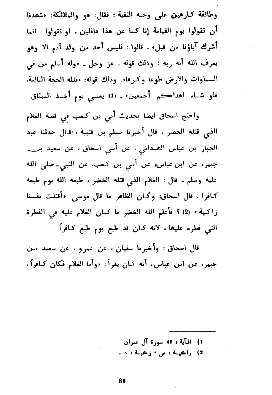 وَطَائِفَةً كَارِهِينَ عَلَى وَجْهِ التَّقِيَّةِ فَقَالَ هُوَ وَالْمَلَائِكَةُ شَهِدْنَا أَنْ تَقُولُوا يَوْمَ الْقِيَامَةِ إِنَّا كُنَّا عَنْ هَذَا غَافِلِينَ أَوْ تَقُولُوا إِنَّمَا أَشْرَكَ آبَاؤُنَا مِنْ قَبْلُ قَالُوا فَلَيْسَ أَحَدٌ مِنْ وَلَدِ آدَمَ إِلَّا وَهُوَ يَعْرِفُ اللَّهَ أَنَّهُ رَبُّهُ وَذَلِكَ قَوْلُهُ عَزَّ وَجَلَّ وَلَهُ أَسْلَمَ مَنْ فِي السَّمَاوَاتِ وَالْأَرْضِ طَوْعًا وَكَرْهًا وَذَلِكَ قَوْلُهُ فَلِلَّهِ الْحُجَّةُ الْبَالِغَةُ فَلَوْ شَاءَ لَهَدَاكُمْ أَجْمَعِينَ يَعْنِي يَوْمَ أَخَذَ الْمِيثَاقَ وَاحْتَجَّ إِسْحَاقُ أَيْضًا بِحَدِيثِ أُبَيِّ بْنِ كَعْبٍ فِي قِصَّةِ الْغُلَامِ الَّذِي قَتَلَهُ الْخَضِرُ قَالَ أَخْبَرَنَا مُسْلِمُ بْنُ قُتَيْبَةَ قَالَ حَدَّثَنَا عَبْدُ الْجَبَّارِ بْنُ عَبَّاسٍ الْهَمْدَانِيُّ عَنْ أَبِي إِسْحَاقَ عَنْ سَعِيدِ بْنِ جُبَيْرٍ عَنِ ابْنِ عَبَّاسٍ عَنْ أُبَيِّ بْنِ كَعْبٍ عَنِ النَّبِيِّ صَلَّى اللَّهُ عَلَيْهِ وَسَلَّمَ قَالَ الْغُلَامُ الَّذِي قَتَلَهُ الْخَضِرُ طَبَعَهُ اللَّهُ يَوْمَ طَبَعَهَ كَافِرًا قَالَ إِسْحَاقُ وَكَانَ الظَّاهِرُ مَا قَالَ مُوسَى أَقَتَلْتَ نَفْسًا زاكية فَأَعْلَمَ اللَّهُ الْخَضِرَ مَا كَانَ الْغُلَامُ عَلَيْهِ فِي الْفِطْرَةِ الَّتِي فَطَرَهُ عَلَيْهَا لِأَنَّهُ كَانَ قَدْ طُبِعَ يَوْمَ طُبِعَ كَافِرًا قَالَ إِسْحَاقُ وَأَخْبَرَنَا سُفْيَانُ عَنْ عَمْرٍو عَنْ سَعِيدِ بْنِ جُبَيْرٍ عَنِ ابْنِ عَبَّاسٍ أَنَّهُ كَانَ يَقْرَأُ وَأَمَّا الْغُلَامُ فَكَانَ كَافِرًا
