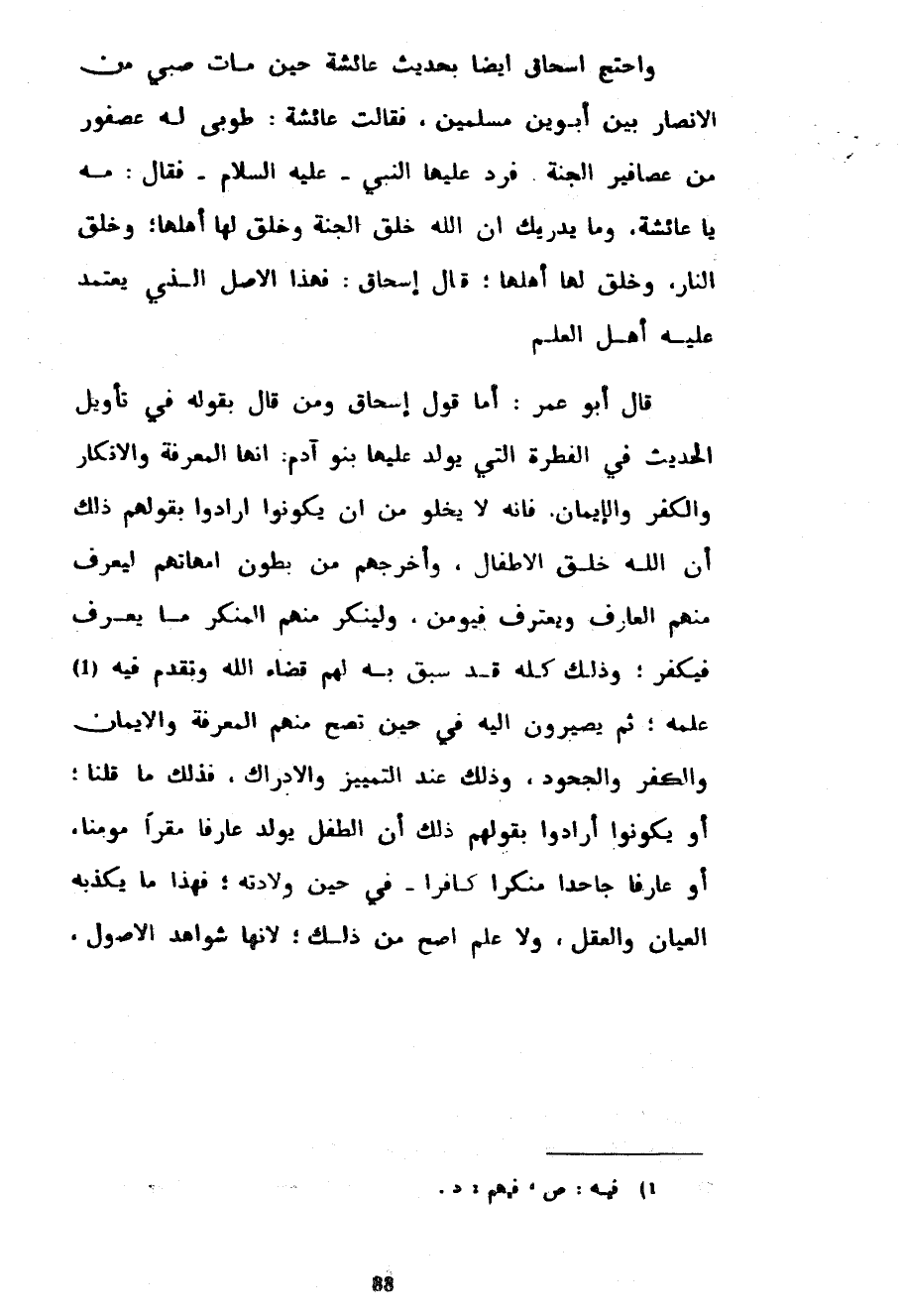 وَاحْتَجَّ إِسْحَاقُ أَيْضًا بِحَدِيثِ عَائِشَةَ حِينَ مَاتَ صَبِيٌّ مِنَ الْأَنْصَارِ بَيْنَ أَبَوَيْنِ مُسْلِمَيْنِ فَقَالَتْ عَائِشَةُ طُوبَى لَهُ عُصْفُورٌ مِنْ عَصَافِيرِ الْجَنَّةِ فَرَدَّ عَلَيْهَا النَّبِيُّ عَلَيْهِ السَّلَامُ فَقَالَ مَهْ يَا عَائِشَةُ وَمَا يُدْرِيكِ إِنَّ اللَّهَ خَلَقَ الْجَنَّةَ وَخَلَقَ لَهَا أَهْلَهَا وَخَلَقَ النَّارَ وَخَلَقَ لَهَا أَهْلَهَا قَالَ إِسْحَاقُ فَهَذَا الْأَصْلُ الَّذِي يَعْتَمِدُ عَلَيْهِ أَهْلُ الْعِلْمِ قَالَ أَبُو عُمَرَ أَمَّا قَوْلُ إِسْحَاقَ وَمَنْ قَالَ بِقَوْلِهِ فِي تَأْوِيلِ الْحَدِيثِ فِي الْفِطْرَةِ الَّتِي يُولَدُ عَلَيْهَا بَنُو آدَمَ إِنَّهَا الْمَعْرِفَةُ وَالْإِنْكَارُ وَالْكُفْرُ وَالْإِيمَانُ فَإِنَّهُ لَا يَخْلُو مِنْ أَنْ يَكُونُوا أَرَادُوا بِقَوْلِهِمْ ذَلِكَ أَنَّ اللَّهَ خَلَقَ الْأَطْفَالَ وَأَخْرَجَهُمْ مِنْ بُطُونِ أُمَّهَاتِهِمْ لِيَعْرِفَ مِنْهُمُ الْعَارِفُ وَيَعْتَرِفَ فَيُؤْمِنُ وَلِيُنْكِرَ مِنْهُمُ الْمُنْكِرُ مَا يَعْرِفُ فَيَكْفُرُ وَذَلِكَ كُلُّهُ قَدْ سَبَقَ بِهِ لَهُمْ قَضَاءُ اللَّهِ وَتَقَدَّمَ فِيهِ عِلْمُهُ ثُمَّ يَصِيرُونَ إِلَيْهِ فِي حِينِ تَصِحُّ مِنْهُمُ الْمَعْرِفَةُ وَالْإِيمَانُ وَالْكُفْرُ وَالْجُحُودُ وَذَلِكَ عِنْدَ التَّمْيِيزِ وَالْإِدْرَاكِ فَذَلِكَ مَا قُلْنَا أَوْ يَكُونُوا أَرَادُوا بِقَوْلِهِمْ ذَلِكَ أَنَّ الطِّفْلَ يُولَدُ عَارِفًا مُقِرًّا مُؤْمِنًا أَوْ عَارِفًا جَاحِدًا مُنْكِرًا كَافِرًا فِي حِينِ وِلَادَتِهِ فَهَذَا مَا يُكَذِّبُهُ الْعِيَانُ وَالْعَقْلُ وَلَا عِلْمَ أَصَحُّ مِنْ ذَلِكَ لِأَنَّهَا شَوَاهِدُ الْأُصُولِ