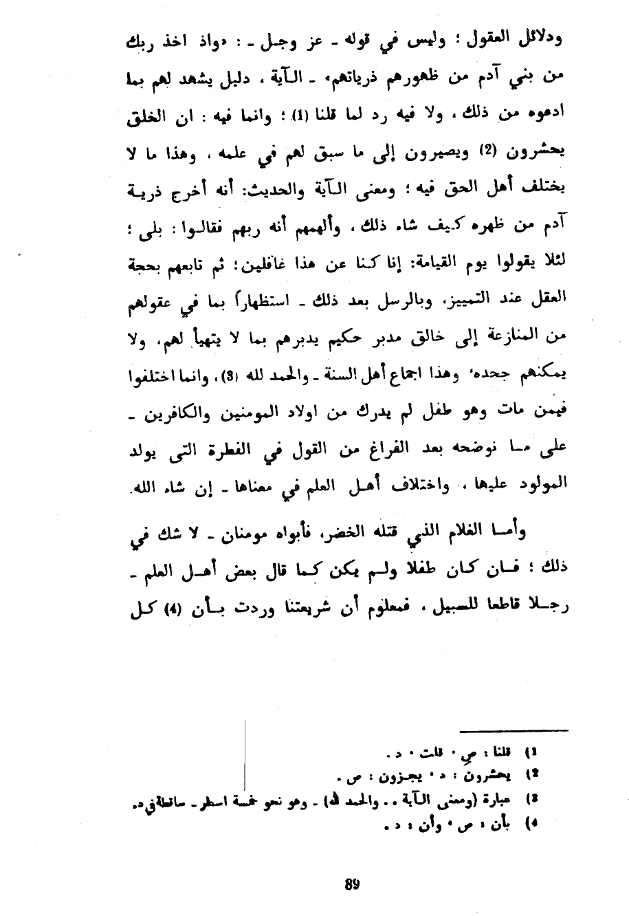 وَدَلَائِلُ الْعُقُولِ وَلَيْسَ فِي قَوْلِهِ عَزَّ وَجَلَّ وَإِذْ أَخَذَ رَبُّكَ مِنْ بَنِي آدَمَ مِنْ ظُهُورِهِمْ ذُرِّيَّاتِهِمْ الْآيَةَ دَلِيلٌ يَشْهَدُ لَهُمْ بِمَا ادَّعَوْهُ مِنْ ذَلِكَ وَلَا فِيهِ رَدٌّ لِمَا قُلْنَا وَإِنَّمَا فِيهِ أَنَّ الْخَلْقَ يُحْشَرُونَ وَيَصِيرُونَ إِلَى مَا سَبَقَ لَهُمْ فِي عِلْمِهِ وَهَذَا مَا لَا يَخْتَلِفُ أَهْلُ الْحَقِّ فِيهِ وَمَعْنَى الْآيَةِ وَالْحَدِيثِ أَنَّهُ أَخْرَجَ ذَرِّيَّةَ آدَمَ مِنْ ظَهْرِهِ كَيْفَ شَاءَ ذَلِكَ وَأَلْهَمَهُمْ أَنَّهُ رَبُّهُمْ فَقَالُوا بَلَى لِئَلَّا يَقُولُوا يَوْمَ الْقِيَامَةِ إِنَّا كُنَّا عَنْ هَذَا غَافِلِينَ ثُمَّ تَابَعَهُمْ بِحُجَّةِ الْعَقْلِ عِنْدَ التَّمْيِيزِ وَبِالرُّسُلِ بَعْدَ ذَلِكَ اسْتِظْهَارًا بِمَا فِي عُقُولِهِمْ مِنَ الْمُنَازَعَةِ إِلَى خَالِقٍ مُدَبِّرٍ حَكِيمٍ يُدَبِّرُهُمْ بِمَا لَا يَتَهَيَّأُ لَهُمْ وَلَا يُمْكِنُهُمْ جَحْدُهُ وَهَذَا إِجْمَاعُ أَهْلِ السُّنَّةِ وَالْحَمْدُ لِلَّهِ وَإِنَّمَا اخْتَلَفُوا فِيمَنْ مَاتَ وَهُوَ طِفْلٌ لَمْ يُدْرِكْ مِنْ أَوْلَادِ الْمُؤْمِنِينَ وَالْكَافِرِينَ على ما نوضح بَعْدَ الْفَرَاغِ مِنَ الْقَوْلِ فِي الْفِطْرَةِ الَّتِي يُولَدُ الْمَوْلُودُ عَلَيْهَا وَاخْتِلَافِ أَهْلِ الْعِلْمِ فِي مَعْنَاهَا إِنْ شَاءَ اللَّهُ وَأَمَّا الْغُلَامُ الَّذِي قَتَلَهُ الْخَضِرُ فَأَبَوَاهُ مُؤْمِنَانِ لَا شَكَّ فِي ذَلِكَ فَإِنْ كَانَ طِفْلًا وَلَمْ يَكُنْ كَمَا قَالَ بَعْضُ أَهْلِ الْعِلْمِ رَجُلًا قَاطِعًا لِلسَّبِيلِ فَمَعْلُومٌ أَنَّ شَرِيعَتَنَا وَرَدَتْ بِأَنَّ كُلَّ