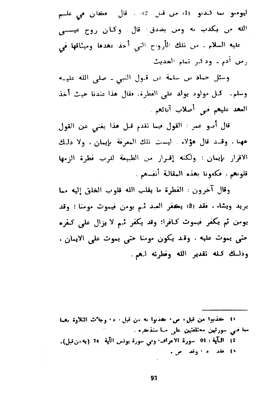 لِيُؤْمِنُوا بِمَا كَذَّبُوا مِنْ قَبْلُ قَالَ فَكَانَ فِي عِلْمِ اللَّهِ مَنْ يُكَذِّبُ بِهِ وَمَنْ يُصَدِّقُ قَالَ وَكَانَ رُوحُ عِيسَى عَلَيْهِ السَّلَامُ مِنْ تِلْكَ الْأَرْوَاحِ الَّتِي أَخَذَ عَهْدَهَا وَمِيثَاقَهَا فِي زَمَنِ آدَمَ وَذَكَرَ تَمَامَ الْحَدِيثِ وَسُئِلَ حَمَّادُ بْنُ سَلَمَةَ عَنْ قَوْلِ النَّبِيِّ صَلَّى اللَّهُ عَلَيْهِ وَسَلَّمَ كُلُّ مَوْلُودٍ يُولَدُ عَلَى الْفِطْرَةِ فَقَالَ هَذَا عِنْدَنَا حَيْثُ أُخِذَ الْعَهْدُ عَلَيْهِمْ فِي أَصْلَابِ آبَائِهِمْ قَالَ أَبُو عُمَرَ الْقَوْلُ فِيمَا تَقَدَّمَ قَبْلَ هَذَا يُغْنِي عَنِ الْقَوْلِ هَهُنَا وَقَدْ قَالَ هَؤُلَاءِ لَيْسَتْ تِلْكَ الْمَعْرِفَةُ بِإِيمَانٍ وَلَا ذَلِكَ الْإِقْرَارُ بِإِيمَانٍ وَلَكِنَّهُ إِقْرَارٌ مِنَ الطَّبِيعَةِ لِلرَّبِّ فِطْرَةٌ أَلْزَمَهَا قُلُوبَهُمْ فَكَفَوْنَا بِهَذِهِ الْمَقَالَةِ أَنْفُسَهُمْ وَقَالَ آخَرُونَ الْفِطْرَةُ مَا يُقَلِّبُ اللَّهُ قُلُوبَ الْخَلْقِ إِلَيْهِ مِمَّا يُرِيدُ وَيَشَاءُ فَقَدْ يَكْفُرُ الْعَبْدُ ثُمَّ يُؤْمِنُ فَيَمُوتُ مُؤْمِنًا وَقَدْ يُؤْمِنُ ثُمَّ يَكْفُرُ فَيَمُوتُ كَافِرًا وَقَدْ يَكْفُرُ ثُمَّ لَا يَزَالُ عَلَى كُفْرِهِ حَتَّى يَمُوتَ عَلَيْهِ وَقَدْ يَكُونُ مُؤْمِنًا حَتَّى يَمُوتَ عَلَى الْإِيمَانِ وَذَلِكَ كُلُّهُ تَقْدِيرُ اللَّهِ وَفِطْرَتُهُ لَهُمْ
