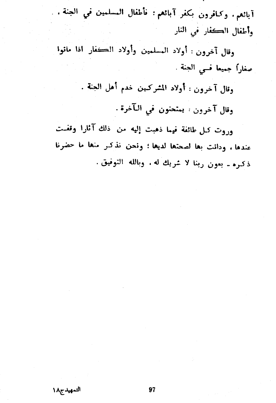 آبَائِهِمْ وَكَافِرُونَ بِكُفْرِ آبَائِهِمْ فَأَطْفَالُ الْمُسْلِمِينَ فِي الْجَنَّةِ وَأَطْفَالُ الْكُفَّارِ فِي النَّارِ وَقَالَ آخَرُونَ أَوْلَادُ الْمُسْلِمِينَ وَأَوْلَادُ الْكُفَّارِ إِذَا مَاتُوا صِغَارًا جَمِيعًا فِي الْجَنَّةِ وَقَالَ آخَرُونَ أَوْلَادُ الْمُشْرِكِينَ خَدَمُ أَهْلِ الْجَنَّةِ وَقَالَ آخَرُونَ يُمْتَحَنُونَ فِي الْآخِرَةِ وَرَوَتْ كُلُّ طَائِفَةٍ فِيمَا ذَهَبَتْ إِلَيْهِ مِنْ ذَلِكَ آثَارًا وَقَفَتْ عِنْدَهَا وَدَانَتْ بِهَا لِصِحَّتِهَا لَدَيْهَا وَنَحْنُ نَذْكُرُ مِنْهَا مَا حَضَرَنَا ذِكْرُهُ بِعَوْنِ رَبِّنَا لَا شَرِيكَ لَهُ وَبِاللَّهِ التوفيق