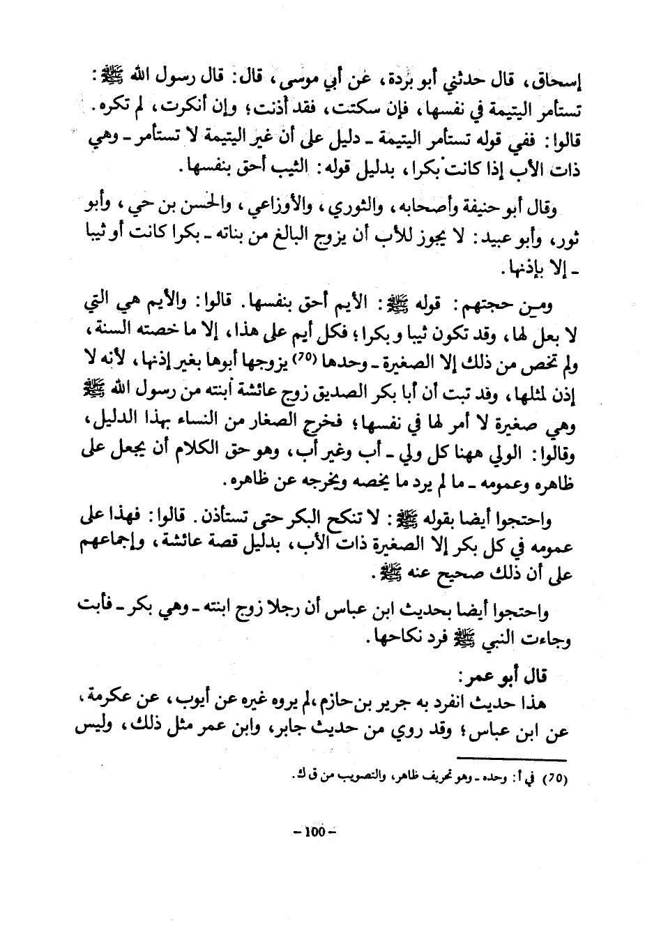 إِسْحَاقَ قَالَ حَدَّثَنِي أَبُو بُرْدَةَ عَنْ أَبِي مُوسَى قَالَ قَالَ رَسُولُ اللَّهِ صَلَّى اللَّهُ عَلَيْهِ وَسَلَّمَ تُسْتَأْمَرُ الْيَتِيمَةُ فِي نَفْسِهَا فَإِنْ سَكَتَتْ فَقَدْ أَذِنَتْ وَإِنْ أَنْكَرَتْ لَمْ تُكْرَهْ قَالُوا فَفِي قَوْلِهِ تُسْتَأْمَرُ الْيَتِيمَةُ دَلِيلٌ عَلَى أَنَّ غَيْرَ الْيَتِيمَةِ لَا تُسْتَأْمَرُ وَهِيَ ذَاتُ الْأَبِ إِذَا كَانْتْ بِكْرًا بِدَلِيلِ قَوْلِهِ الثَّيِّبُ أَحَقُّ بِنَفْسِهَا وَقَالَ أَبُو حَنِيفَةَ وَأَصْحَابُهُ وَالثَّوْرِيُّ وَالْأَوْزَاعِيُّ وَالْحُسْنُ بْنِ حَيٍّ وَأَبُو ثَوْرٍ وَأَبُو عُبَيْدٍ لَا يَجُوزُ لِلْأَبِ أَنْ يُزَوِّجَ الْبَالِغَ مِنْ بَنَاتِهِ بِكْرًا كَانَتْ أَوْ ثَيِّبًا إِلَّا بِإِذْنِهَا وَمِنْ حُجَّتِهِمْ قَوْلُهُ صَلَّى اللَّهُ عَلَيْهِ وَسَلَّمَ الْأَيِّمُ أَحَقُّ بِنَفْسِهَا قَالُوا وَالْأَيِّمُ هِيَ الَّتِي لَا بَعْلَ لَهَا وَقَدْ تَكُونُ ثَيِّبًا وَبِكْرًا فَكُلٌّ أَيِّمٍّ عَلَى هَذَا إِلَّا مَا خَصَّتْهُ السُّنَّةُ وَلَمْ تَخُصَّ مِنْ ذَلِكَ إِلَّا الصَّغِيرَةَ وَحْدَهَا يُزَوِّجُهَا أَبُوهَا بِغَيْرِ إِذْنِهَا لِأَنَّهُ لا إذن لمثلها وقد تبت أَنَّ أَبَا بَكْرٍ الصِّدِّيقَ زَوَّجَ عَائِشَةَ ابْنَتَهُ مِنْ رَسُولِ اللَّهِ صَلَّى اللَّهُ عَلَيْهِ وَسَلَّمَ وَهِيَ صَغِيرَةٌ لَا أَمْرَ لَهَا فِي نَفْسِهَا فَخَرَجَ الصِّغَارُ مِنَ النِّسَاءِ بِهَذَا الدَّلِيلِ وَقَالُوا الْوَلِيُّ هَهُنَا كُلُّ وَلِيٍّ أَبٌ وَغَيْرُ أَبٍ وَهُوَ حَقُّ الْكَلَامِ أَنْ يُجْعَلَ عَلَى ظَاهِرِهِ وعمومه ما لم يرد مايخصه وَيُخْرِجُهُ عَنْ ظَاهِرِهِ وَاحْتَجُّوا أَيْضًا بِقَوْلِهِ صَلَّى اللَّهُ عَلَيْهِ وَسَلَّمَ لَا تُنْكَحُ الْبِكْرُ حَتَّى تُسْتَأْذَنَ قَالُوا فَهَذَا عَلَى عُمُومِهِ فِي كُلِّ بِكْرٍ إِلَّا الصَّغِيرَةَ ذَاتَ الْأَبِ بِدَلِيلِ قِصَّةِ عَائِشَةَ وَإِجْمَاعِهِمْ عَلَى أَنَّ ذَلِكَ صَحِيحٌ عَنْهُ صَلَّى اللَّهُ عَلَيْهِ وَسَلَّمَ وَاحْتَجُّوا أَيْضًا بِحَدِيثِ ابْنِ عَبَّاسٍ أَنْ رَجُلًا زَوَّجَ ابْنَتَهُ وَهِيَ بِكْرٌ فَأَبَتْ وَجَاءَتِ النَّبِيَّ صَلَّى اللَّهُ عَلَيْهِ وَسَلَّمَ فَرَدَّ نِكَاحَهَا قَالَ أَبُو عُمَرَ هَذَا حَدِيثٌ انْفَرَدَ بِهِ جَرِيرُ بْنُ حَازِمٍ لَمْ يَرْوِهِ غَيْرُهُ عَنْ أَيُّوبَ عَنْ عِكْرِمَةَ عَنِ ابْنِ عَبَّاسٍ وَقَدْ رُوِيَ مِنْ حَدِيثِ جَابِرٍ وَابْنِ عُمَرَ مِثْلُ ذَلِكَ وَلَيْسَ