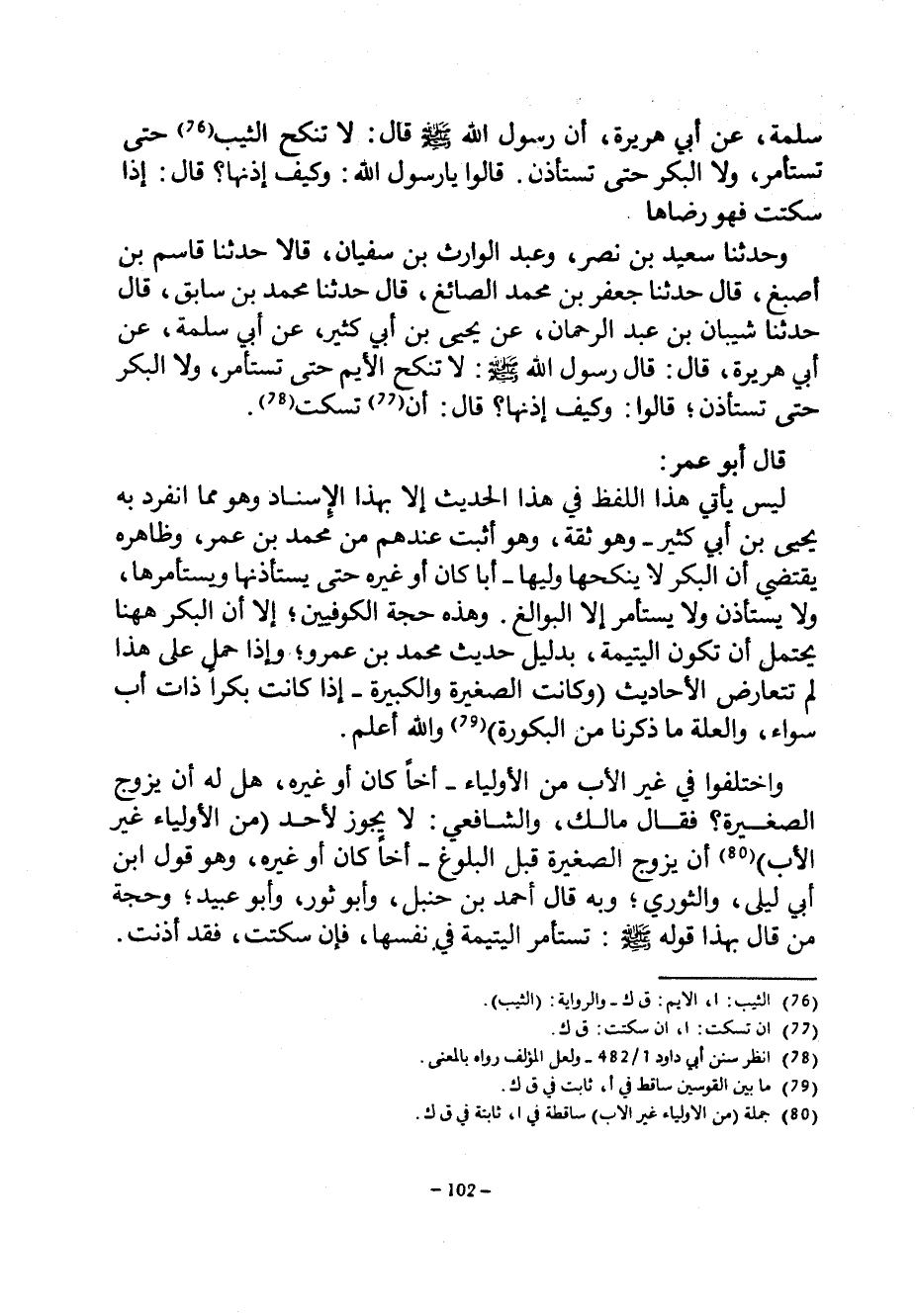 سَلَمَةَ عَنْ أَبِي هُرَيْرَةَ أَنَّ رَسُولَ اللَّهِ صَلَّى اللَّهُ عَلَيْهِ وَسَلَّمَ قَالَ لَا تُنْكَحُ الثَّيِّبُ حَتَّى تُسْتَأْمَرَ وَلَا الْبِكْرُ حَتَّى تُسْتَأْذَنَ قَالُوا يَا رَسُولَ اللَّهِ وَكَيْفَ إِذْنُهَا قَالَ إِذَا سَكَتَتْ فَهُوَ رِضَاهَا وَحَدَّثَنَا سَعِيدُ بْنُ نَصْرٍ وَعَبْدُ الْوَارِثِ بْنُ سُفْيَانَ قَالَا حَدَّثَنَا قَاسِمُ بْنُ أَصْبَغَ قَالَ حَدَّثَنَا جَعْفَرُ بْنُ مُحَمَّدٍ الصَّائِغُ قَالَ حَدَّثَنَا مُحَمَّدُ بْنُ سَابِقٍ قال حدثنا شيبان بن عبد الرحمان عَنْ يَحْيَى بْنِ أَبِي كَثِيرٍ عَنْ أَبِي سَلَمَةَ عَنْ أَبِي هُرَيْرَةَ قَالَ قَالَ رَسُولُ اللَّهِ صَلَّى اللَّهُ عَلَيْهِ وَسَلَّمَ لَا تُنْكَحُ الْأَيِّمُ حَتَّى تُسْتَأْمَرَ وَلَا الْبِكْرُ حَتَّى تُسْتَأْذَنَ قَالُوا وَكَيْفَ إِذْنُهَا قَالَ أَنْ تَسْكُتَ قَالَ أَبُو عُمَرَ لَيْسَ يَأْتِي هَذَا اللَّفْظُ فِي هَذَا الْحَدِيثِ إِلَّا بِهَذَا الْإِسْنَادِ وَهُوَ مِمَّا انْفَرَدَ بِهِ يَحْيَى بْنُ أَبِي كَثِيرٍ وَهُوَ ثِقَةٌ وَهُوَ أَثْبَتُ عِنْدَهُمْ مِنْ مُحَمَّدِ بْنِ عُمَرَ وَظَاهِرُهُ يَقْتَضِي أَنَّ الْبِكْرَ لَا يُنْكِحُهَا وليها أبا كَانَ أَوْ غَيْرُهُ حَتَّى يَسْتَأْذِنَهَا وَيَسْتَأْمِرَهَا وَلَا يُسْتَأْذَنُ وَلَا يُسْتَأْمَرُ إِلَّا الْبَوَالِغُ وَهَذِهِ حُجَّةُ الْكُوفِيِّينَ إِلَّا أَنَّ الْبِكْرَ هَهُنَا يُحْتَمَلُ أَنْ تَكُونَ الْيَتِيمَةَ بِدَلِيلِ حَدِيثِ مُحَمَّدِ بْنِ عَمْرٍو وَإِذَا حُمِلَ عَلَى هَذَا لَمْ تَتَعَارَضِ الْأَحَادِيثُ (وَكَانَتِ الصَّغِيرَةُ وَالْكَبِيرَةُ إِذَا كَانَتْ بِكْرًا ذَاتَ أَبٍ سَوَاءً وَالْعِلَّةُ مَا ذَكَرْنَا مِنَ الْبُكُورَةِ) والله أعلم واخلتفوا فِي غَيْرِ الْأَبِ مِنَ الْأَوْلِيَاءِ أَخًا كَانَ أَوْ غَيْرَهُ هَلْ لَهُ أَنْ يُزَوِّجَ الصَّغِيرَةَ فَقَالَ مَالِكٌ وَالشَّافِعِيُّ لَا يَجُوزُ لِأَحَدٍ (مِنَ الْأَوْلِيَاءِ غَيْرَ الْأَبِ) أَنْ يُزَوِّجَ الصَّغِيرَةَ قَبْلَ الْبُلُوغِ أَخًا كَانَ أَوْ غَيْرَهُ وَهُوَ قَوْلُ ابْنِ أَبِي لَيْلَى وَالثَّوْرِيِّ وَبِهِ قَالَ أَحْمَدُ بْنُ حَنْبَلٍ وَأَبُو ثَوْرٍ وَأَبُو عُبَيْدٍ وَحُجَّةُ مَنْ قَالَ بِهَذَا قَوْلُهُ صَلَّى اللَّهُ عَلَيْهِ وَسَلَّمَ تُسْتَأْمَرُ الْيَتِيمَةُ فِي نَفْسِهَا فَإِنْ سَكَتَتْ فقد أذنت