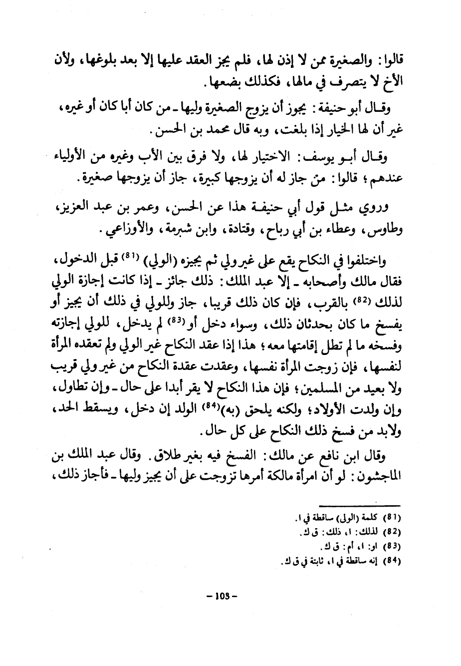 قَالُوا وَالصَّغِيرَةُ مِمَّنْ لَا إِذْنَ لَهَا فَلَمْ يَجُزِ الْعَقْدُ عَلَيْهَا إِلَّا بَعْدَ بُلُوغِهَا وَلِأَنَّ الْأَخَ لَا يَتَصَرَّفُ فِي مَالِهَا فَكَذَلِكَ بُضْعُهَا وَقَالَ أَبُو حَنِيفَةَ يَجُوزُ أَنْ يُزَوِّجَ الصَّغِيرَةَ وَلِيُّهَا مَنْ كَانَ أَبًا كَانَ أَوْ غَيْرَهُ غَيْرَ أَنَّ لَهَا الْخِيَارَ إِذَا بَلَغَتْ وَبِهِ قَالَ مُحَمَّدُ بْنُ الْحَسَنِ وَقَالَ أَبُو يُوسُفَ الِاخْتِيَارُ لَهَا وَلَا فَرْقَ بَيْنَ الْأَبِ وَغَيْرِهِ مِنَ الْأَوْلِيَاءِ عِنْدَهُمْ قَالُوا مَنْ جَازَ لَهُ أَنْ يُزَوِّجَهَا كَبِيرَةً جَازَ أَنْ يُزَوِّجَهَا صَغِيرَةً وَرُوِيَ مِثْلُ قَوْلِ أَبِي حَنِيفَةَ هَذَا عَنِ الْحَسَنِ وَعُمَرَ بْنِ عَبْدِ الْعَزِيزِ وَطَاوُسٍ وَعَطَاءِ بْنِ أَبِي رَبَاحٍ وَقَتَادَةَ وَابْنِ شُبْرُمَةَ وَالْأَوْزَاعِيِّ وَاخْتَلَفُوا فِي النِّكَاحِ يَقَعُ عَلَى غَيْرِ وَلِيٍّ ثُمَّ يُجِيزُهُ (الْوَلِيُّ) قَبْلَ الدُّخُولِ فَقَالَ مَالِكٌ وَأَصْحَابُهُ إِلَّا عَبْدَ الْمَلِكِ ذَلِكَ جَائِزٌ إِذَا كَانَتْ إِجَازَةُ الْوَلِيِّ لِذَلِكَ بِالْقُرْبِ فَإِنْ كَانَ ذَلِكَ قَرِيبًا جَازَ وَلِلْوَلِيِّ فِي ذَلِكَ أَنْ يُجِيزَ أَوْ يَفْسَخَ مَا كَانَ بِحِدْثَانِ ذَلِكَ وَسَوَاءٌ دَخَلَ أَوْ لَمْ يَدْخُلْ لِلْوَلِيِّ إِجَازَتُهُ وَفَسْخُهُ مَا لَمْ تَطُلْ إِقَامَتُهَا مَعَهُ هَذَا إذا عقد النكاح غير الْوَلِيُّ وَلَمْ تَعْقِدْهُ الْمَرْأَةُ لِنَفْسِهَا فَإِنْ زَوَّجَتِ الْمَرْأَةُ نَفْسَهَا وَعَقَدَتْ عُقْدَةَ النِّكَاحِ مِنْ غَيْرِ وَلِيٍّ قَرِيبٍ وَلَا بَعِيدٍ مِنَ الْمُسْلِمِينَ فَإِنَّ هَذَا النِّكَاحَ لَا يُقَرُّ أَبَدًا عَلَى حَالٍ وَإِنْ تَطَاوَلَ وَإِنْ وَلَدَتِ الْأَوْلَادَ وَلَكِنَّهُ يُلْحَقُ (بِهِ) الْوَلَدُ إِنْ دَخَلَ وَيَسْقُطُ الْحَدُّ وَلَا بُدَّ مِنْ فَسْخِ ذَلِكَ النِّكَاحِ عَلَى كُلِّ حَالٍ وَقَالَ ابْنُ نَافِعٍ عَنْ مَالِكٍ الْفَسْخُ فِيهِ بِغَيْرِ طَلَاقٍ وَقَالَ عَبْدُ الْمَلِكِ بْنُ الْمَاجِشُونِ لَوْ أَنَّ امْرَأَةً مَالِكَةً أَمْرَهَا تَزَوَّجَتْ عَلَى أَنْ يُجِيزَ وَلِيُّهَا فَأَجَازَ ذَلِكَ