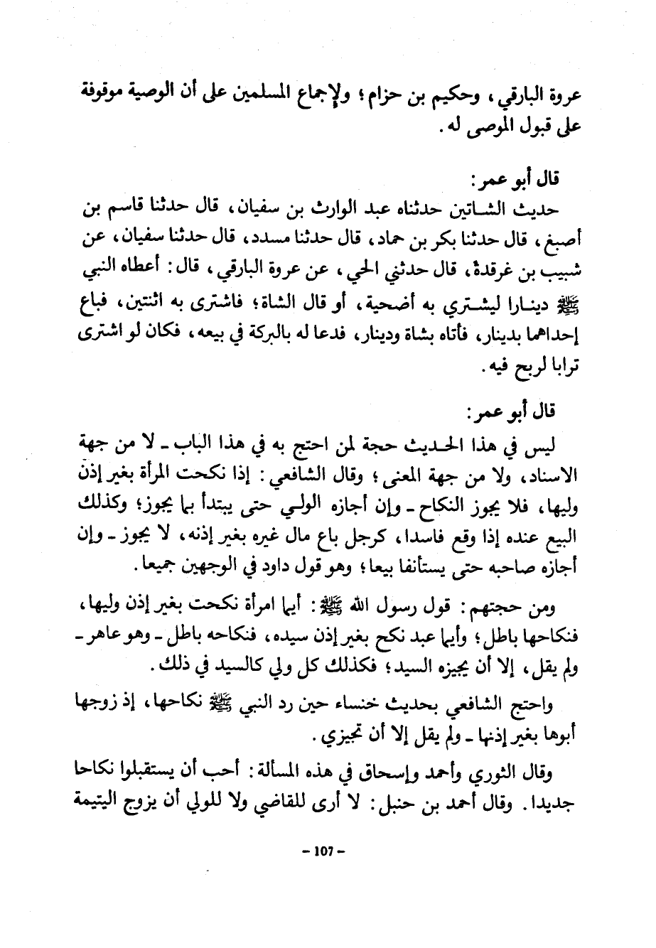 عُرْوَةَ الْبَارِقِيِّ وَحَكِيمِ بْنِ حِزَامٍ وَلِإِجْمَاعِ الْمُسْلِمِينَ عَلَى أَنَّ الْوَصِيَّةَ مَوْقُوفَةٌ عَلَى قَبُولِ الْمُوصَى لَهُ قَالَ أَبُو عُمَرَ حَدِيثُ الشَّاتَيْنِ حَدَّثَنَاهُ عَبْدُ الْوَارِثِ بْنُ سُفْيَانَ قَالَ حَدَّثَنَا قَاسِمُ بْنُ أَصْبَغَ قَالَ حَدَّثَنَا بَكْرُ بْنُ حَمَّادٍ قَالَ حَدَّثَنَا مُسَدَّدٌ قَالَ حَدَّثَنَا سُفْيَانُ عَنْ شَبِيبِ بْنِ غَرْقَدَةَ قَالَ حَدَّثَنِي الْحَيُّ عَنْ عُرْوَةَ الْبَارِقِيِّ قَالَ أَعْطَاهُ النَّبِيُّ صَلَّى اللَّهُ عَلَيْهِ وَسَلَّمَ دِينَارًا لِيَشْتَرِيَ بِهِ أُضْحِيَةً أَوْ قَالَ الشَّاةَ فَاشْتَرَى بِهِ اثْنَتَيْنِ فَبَاعَ إِحْدَاهُمَا بِدِينَارٍ فَأَتَاهُ بِشَاةٍ وَدِينَارٍ فَدَعَا لَهُ بِالْبَرَكَةِ فِي بَيْعِهِ فَكَانَ لَوِ اشْتَرَى تُرَابًا لَرَبِحَ فيه قال أبو عمر لي فِي هَذَا الْحَدِيثِ حُجَّةٌ لِمَنِ احْتَجَّ بِهِ فِي هَذَا الْبَابِ لَا مِنْ جِهَةِ الْإِسْنَادِ وَلَا مِنْ جِهَةِ الْمَعْنَى وَقَالَ الشَّافِعِيُّ إِذَا نَكَحَتِ الْمَرْأَةُ بِغَيْرِ إِذْنِ وَلِيِّهَا فَلَا يَجُوزُ النِّكَاحُ وَإِنْ أَجَازَهُ الْوَلِيُّ حَتَّى يُبْتَدَأَ بِمَا يَجُوزُ وَكَذَلِكَ الْبَيْعُ عِنْدَهُ إِذَا وَقَعَ فَاسِدًا كَرَجُلٍ بَاعَ مَالَ غَيْرِهِ بِغَيْرِ إِذْنِهِ لَا يَجُوزُ وَإِنْ أَجَازَهُ صَاحِبُهُ حَتَّى يَسْتَأْنِفَا بَيْعًا وَهُوَ قَوْلُ دَاوُدَ فِي الْوَجْهَيْنِ جَمِيعًا وَمِنْ حُجَّتِهِمْ قَوْلُ رَسُولِ اللَّهِ صَلَّى اللَّهُ عَلَيْهِ وسلم أيما امرأة نكحت بغير إذن وليها فَنِكَاحُهَا بَاطِلٌ وَأَيُّمَا عَبْدٍ نَكَحَ بِغَيْرِ إِذْنِ سَيِّدِهِ فَنِكَاحُهُ بَاطِلٌ وَهُوَ عَاهِرٌ وَلَمْ يَقُلْ إِلَّا أَنْ يُجِيزَهُ السَّيِّدُ فَكَذَلِكَ كُلُّ وَلِيٍّ كَالسَّيِّدِ فِي ذَلِكَ وَاحْتَجَّ الشَّافِعِيُّ بِحَدِيثِ خَنْسَاءَ حِينَ رَدَّ النَّبِيُّ صَلَّى اللَّهُ عَلَيْهِ وَسَلَّمَ نِكَاحَهَا إِذْ زَوَّجَهَا أَبُوهَا بِغَيْرِ إِذْنِهَا وَلَمْ يَقُلْ إِلَّا أَنْ تُجِيزِي وَقَالَ الثَّوْرِيُّ وَأَحْمَدُ وَإِسْحَاقُ فِي هَذِهِ الْمَسْأَلَةِ أُحِبُّ أَنْ يَسْتَقْبِلُوا نِكَاحًا جَدِيدًا وَقَالَ أَحْمَدُ بْنُ حَنْبَلٍ لَا أَرَى لِلْقَاضِي وَلَا لِلْوَلِيِّ أَنْ يُزَوِّجَ الْيَتِيمَةَ