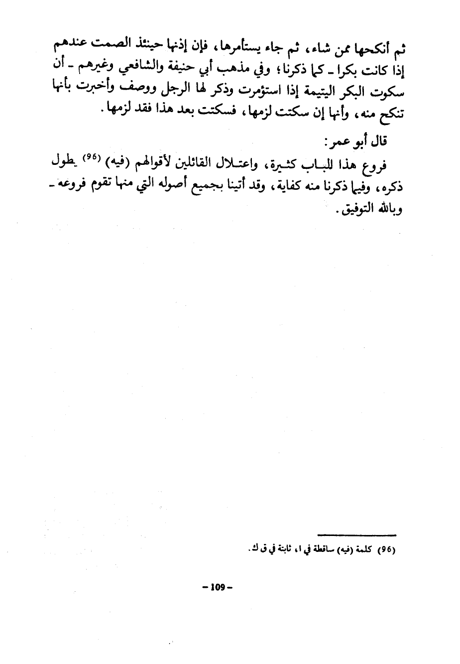 ثُمَّ أَنْكَحَهَا مِمَّنْ شَاءَ ثُمَّ جَاءَ يَسْتَأْمِرُهَا فَإِنَّ إِذْنَهَا حِينَئِذٍ الصَّمْتُ عِنْدَهُمْ إِذَا كَانْتْ بِكْرًا كَمَا ذَكَرْنَا وَفِي مَذْهَبِ أَبِي حَنِيفَةَ وَالشَّافِعِيِّ وَغَيْرِهِمْ أَنَّ سُكُوتَ الْبِكْرِ الْيَتِيمَةِ إِذَا اسْتُؤْمِرَتْ وَذُكِرَ لَهَا الرَّجُلُ وَوُصِفَ وَأُخْبِرَتْ بِأَنَّهَا تُنْكَحُ مِنْهُ وَأَنَّهَا إِنْ سَكَتَتْ لَزِمَهَا فَسَكَتَتْ بَعْدَ هَذَا فَقَدَ لَزِمَهَا قَالَ أَبُو عُمَرَ فروع هذا الباب كثيرة واعتلال القائلين لأقولاهم (فِيهِ) يَطُولُ ذِكْرُهُ وَفِيمَا ذَكَرْنَا مِنْهُ كِفَايَةٌ وَقَدْ أَتَيْنَا بِجَمِيعِ أُصُولِهِ الَّتِي مِنْهَا تَقُومُ فروعه وبالله التوفيق